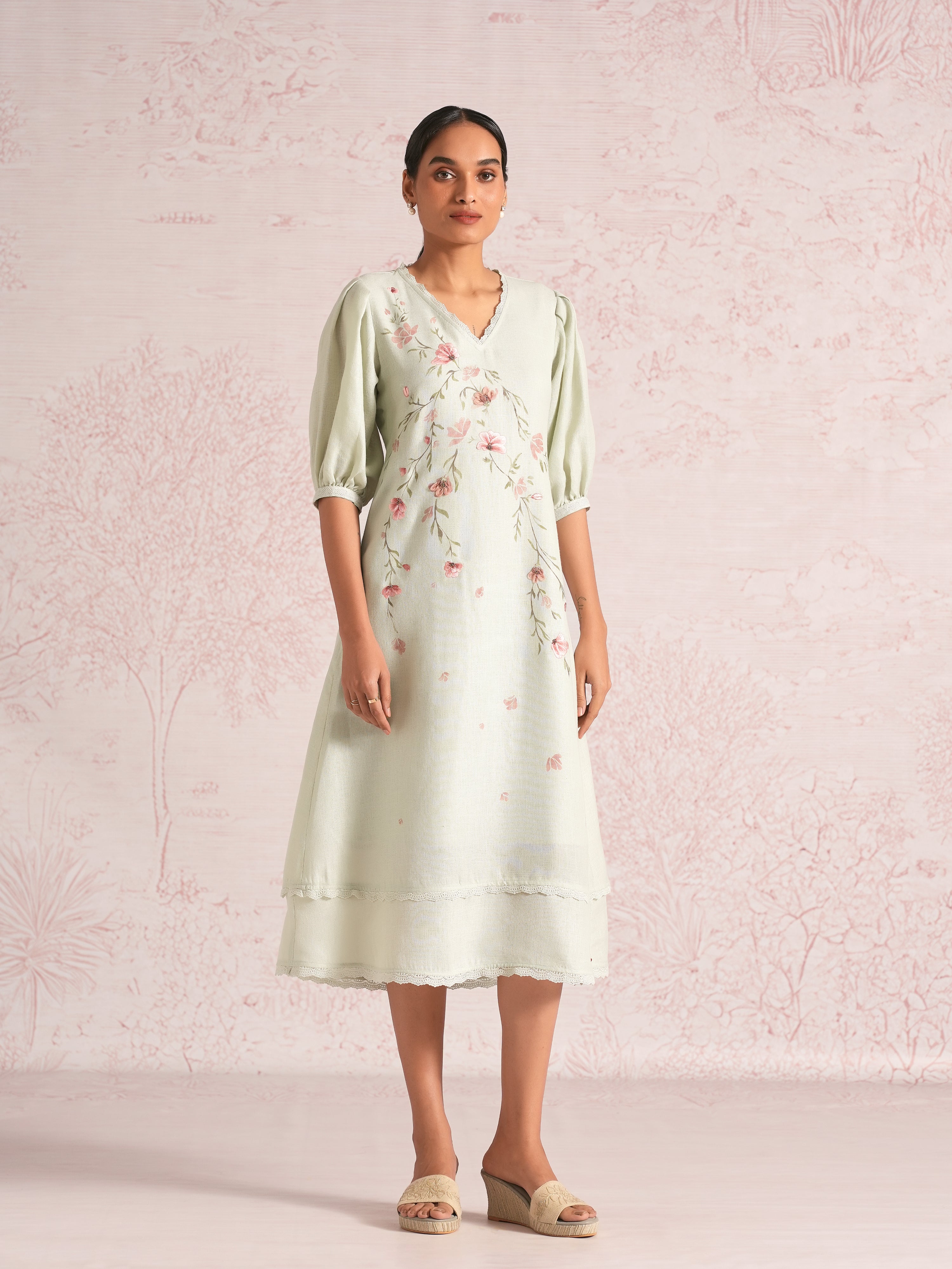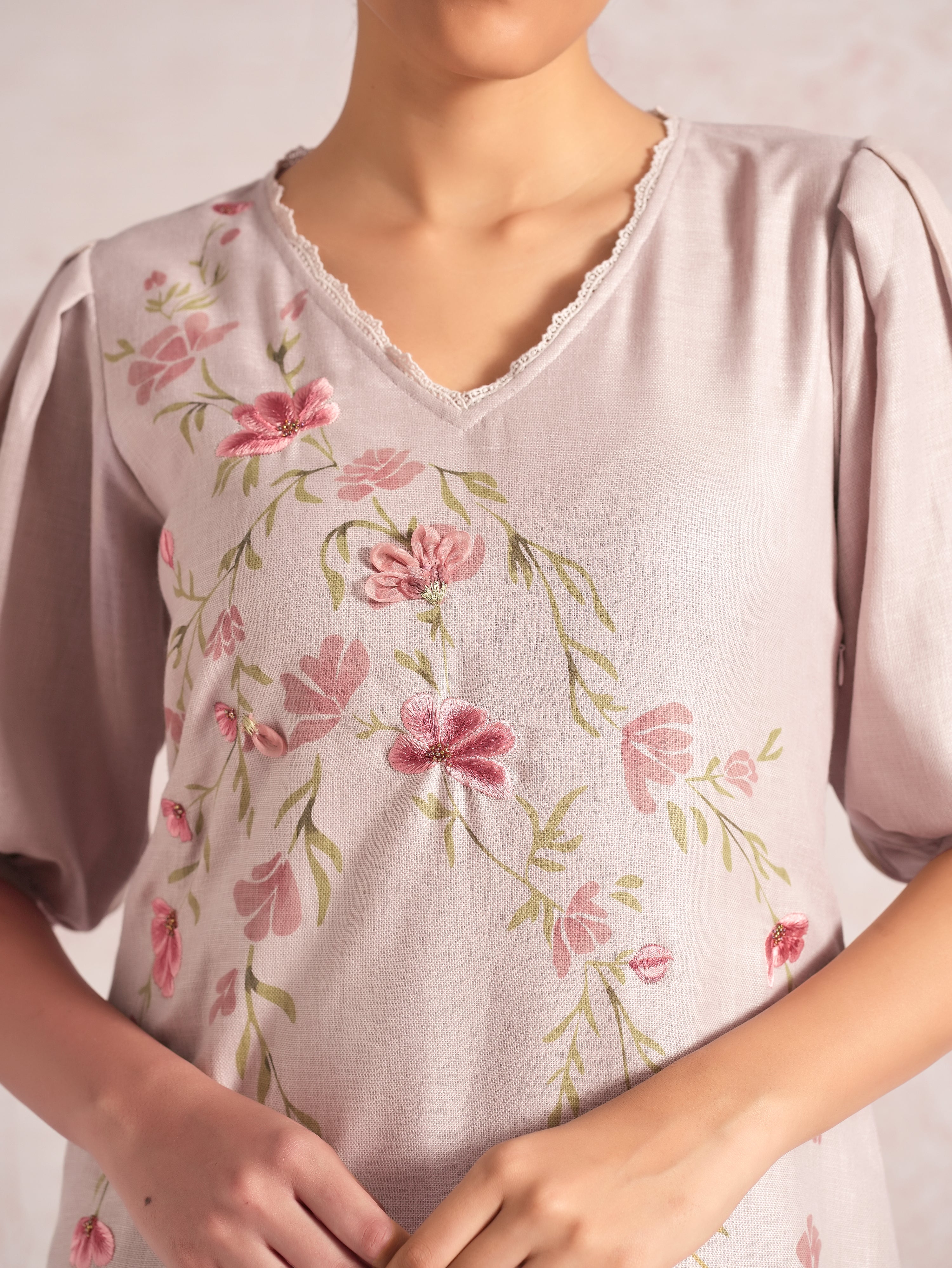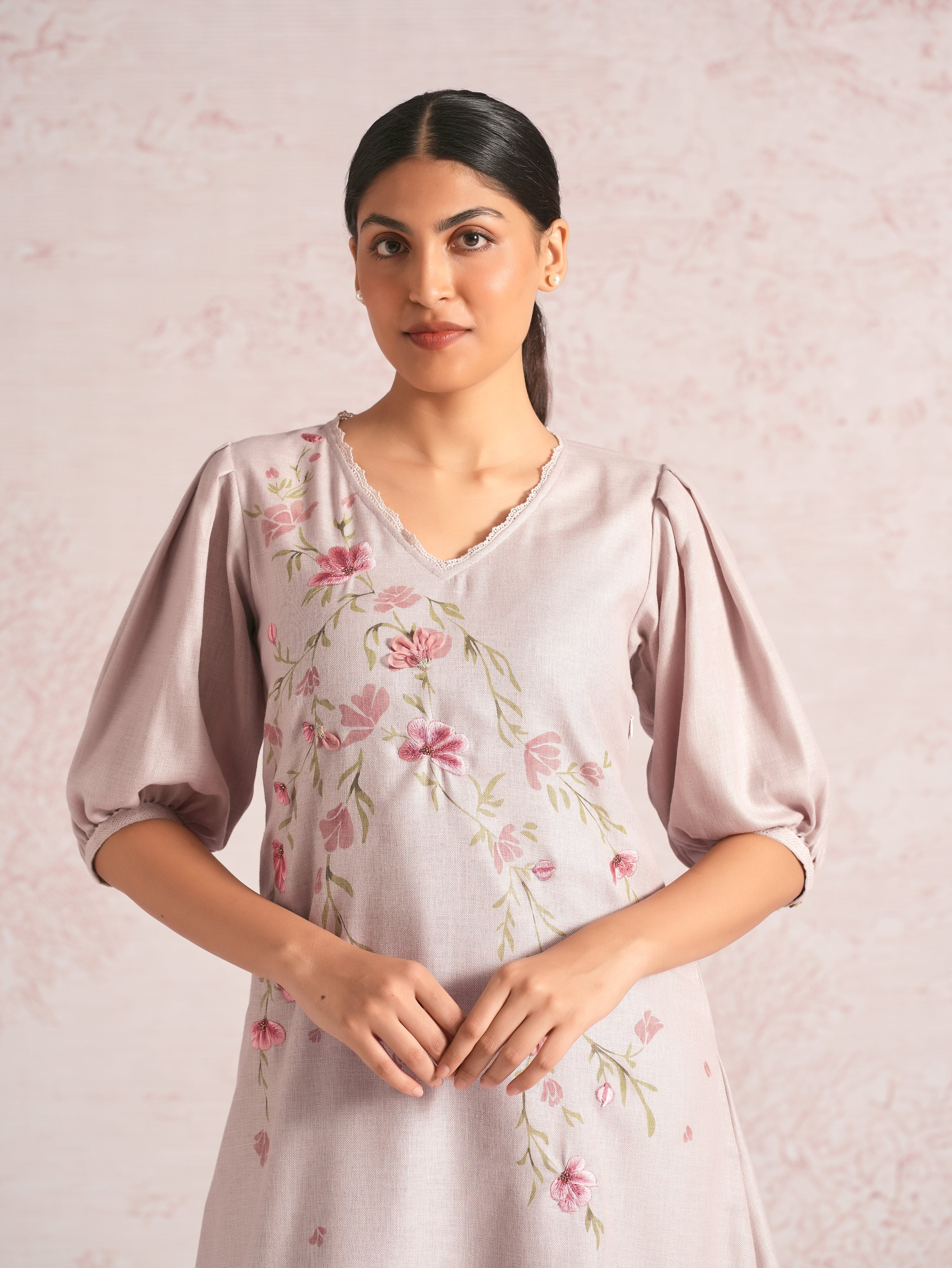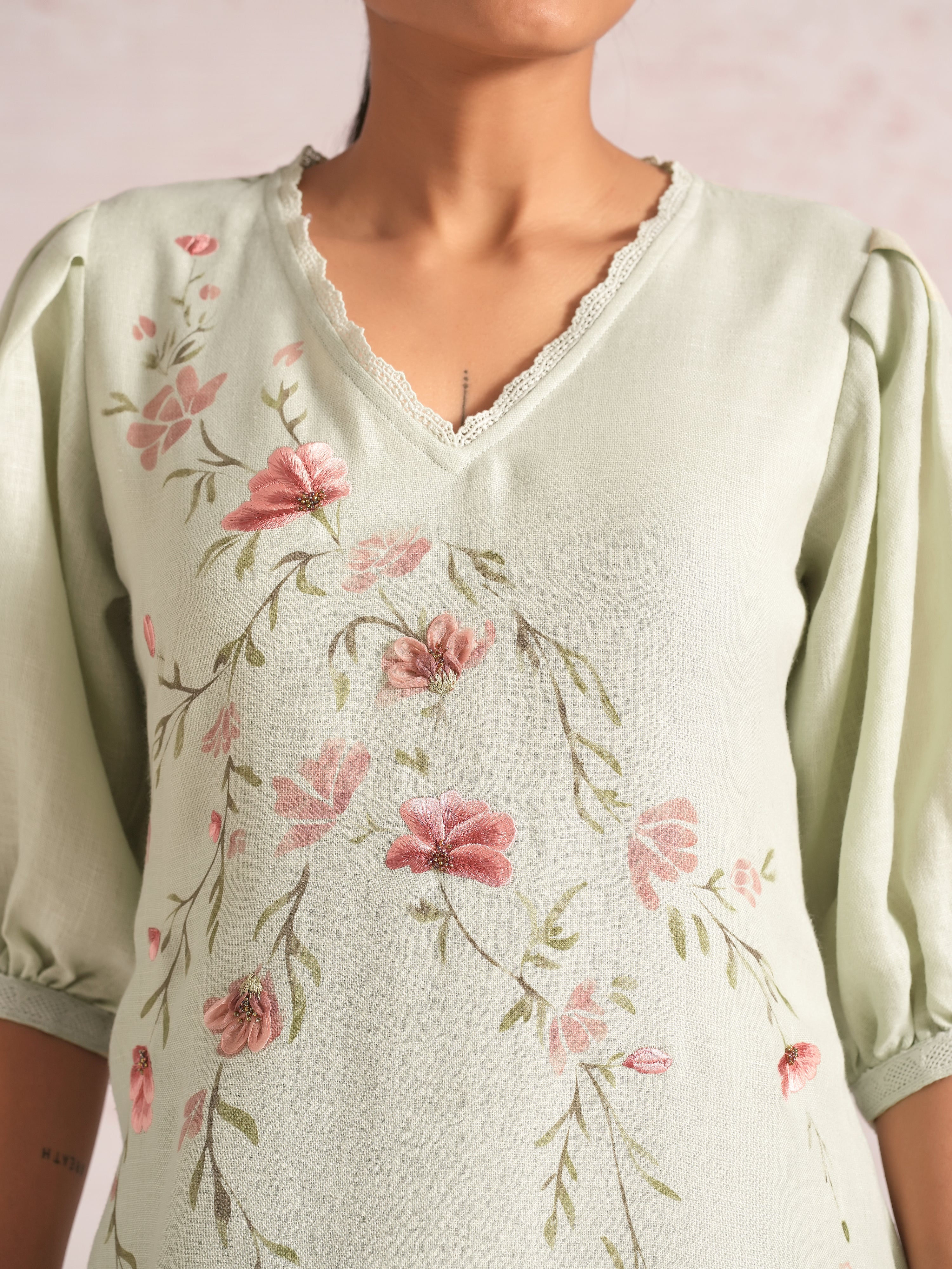 Blush Vines unfolds as a quiet ode to spring, where graceful vines wander delicately across each garment, creating a sense of natural movement and understated elegance. Soft, watercolor-washed florals lend the collection a painterly lightness, as though brushed gently onto fabric, enhancing its refined and airy character. Presented in serene hues of Bonny Green and Mauve, the palette evokes freshness, calm, and subtle romance. Feminine silhouettes such as peplum tops, tree tops, and a timeless waistcoat bring structure to the fluid compositions, striking a beautiful balance between softness and form. Light, elegant, and thoughtfully detailed, Blush Vines is designed for the spring–summer season — an effortless expression of grace, charm, and modern femininity.