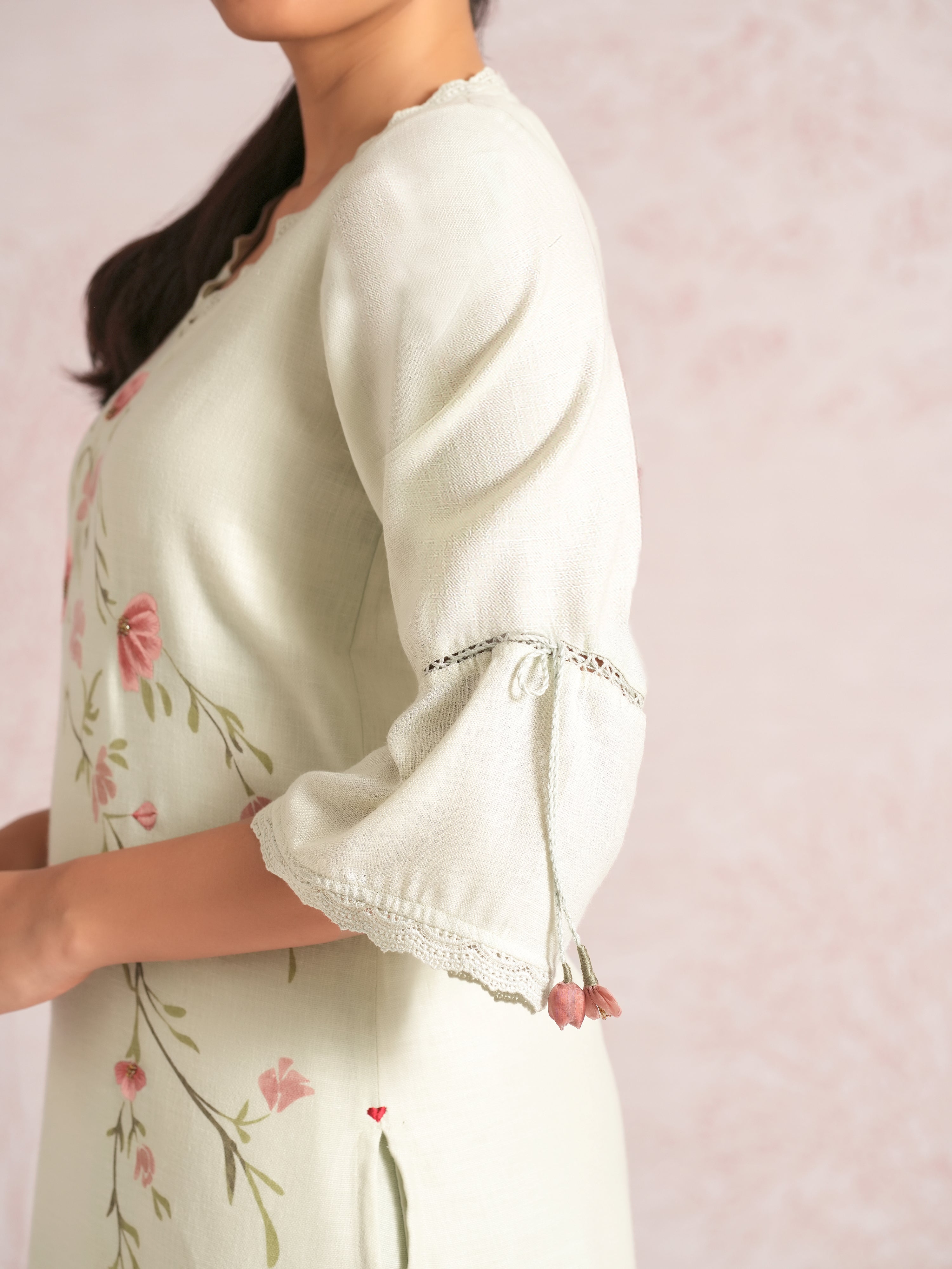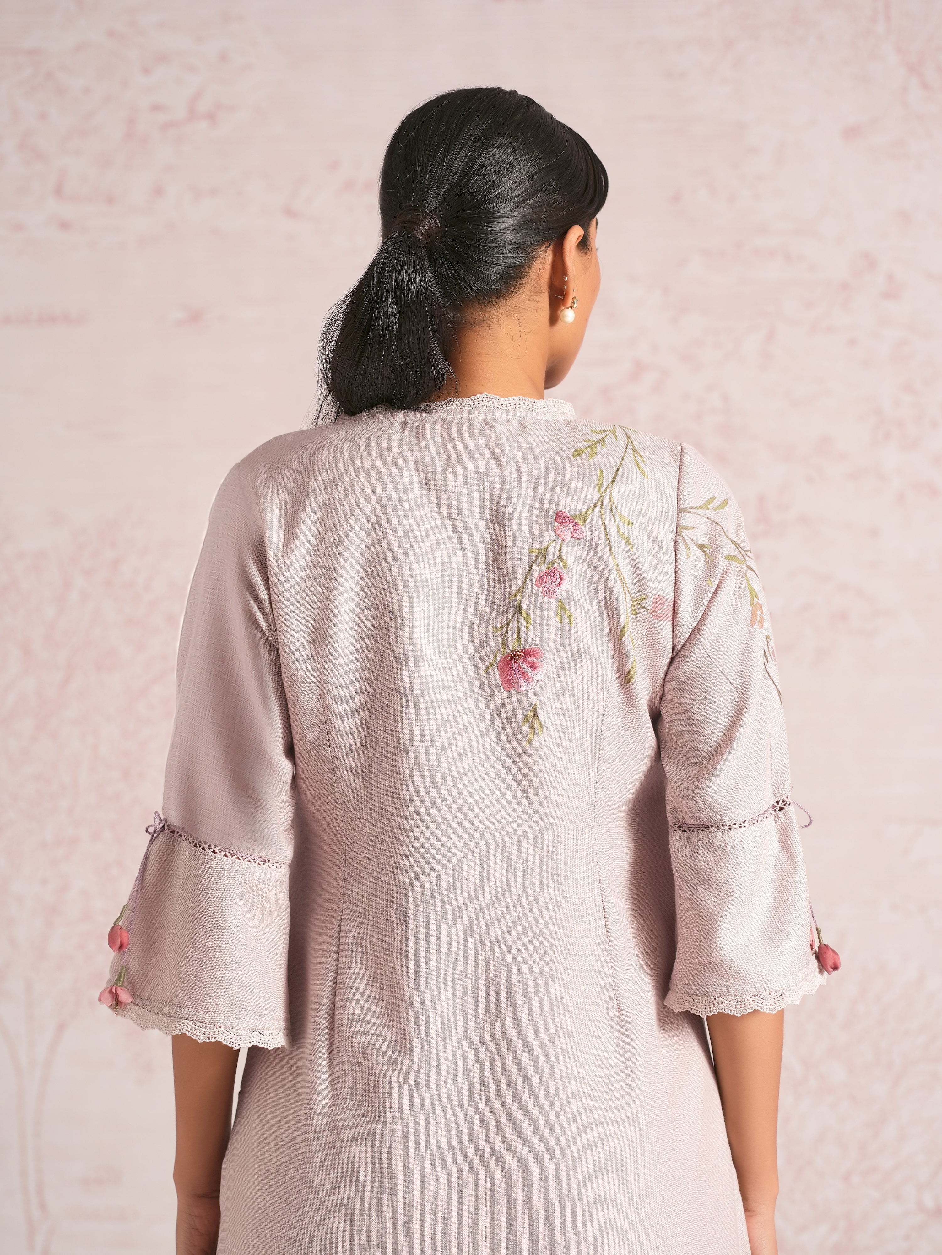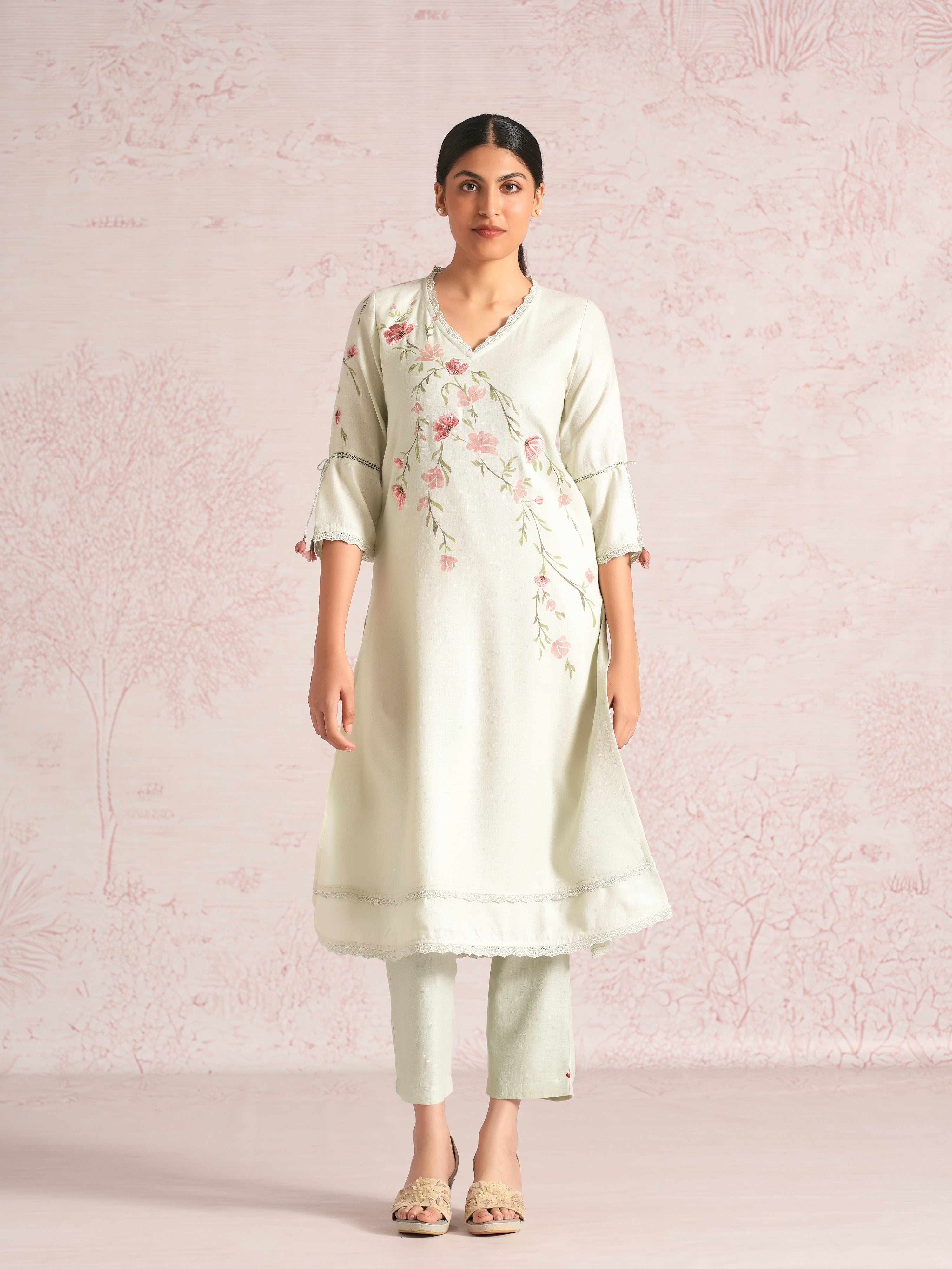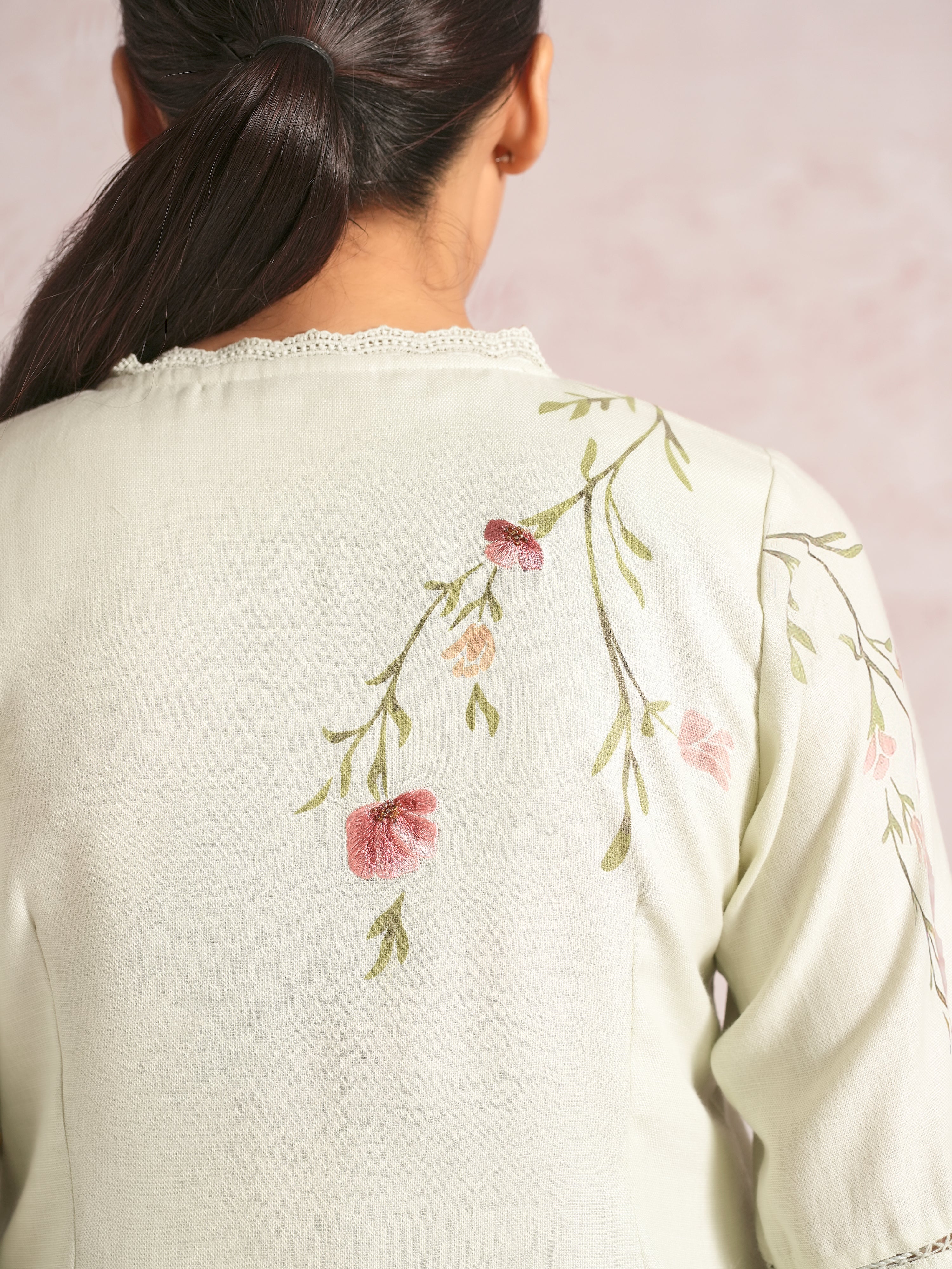 Blush Vines unfolds as a quiet ode to spring, where graceful vines wander delicately across each garment, creating a sense of natural movement and understated elegance. Soft, watercolor-washed florals lend the collection a painterly lightness, as though brushed gently onto fabric, enhancing its refined and airy character. Presented in serene hues of Bonny Green and Mauve, the palette evokes freshness, calm, and subtle romance. Feminine silhouettes such as peplum tops, tree tops, and a timeless waistcoat bring structure to the fluid compositions, striking a beautiful balance between softness and form. Light, elegant, and thoughtfully detailed, Blush Vines is designed for the spring–summer season — an effortless expression of grace, charm, and modern femininity.