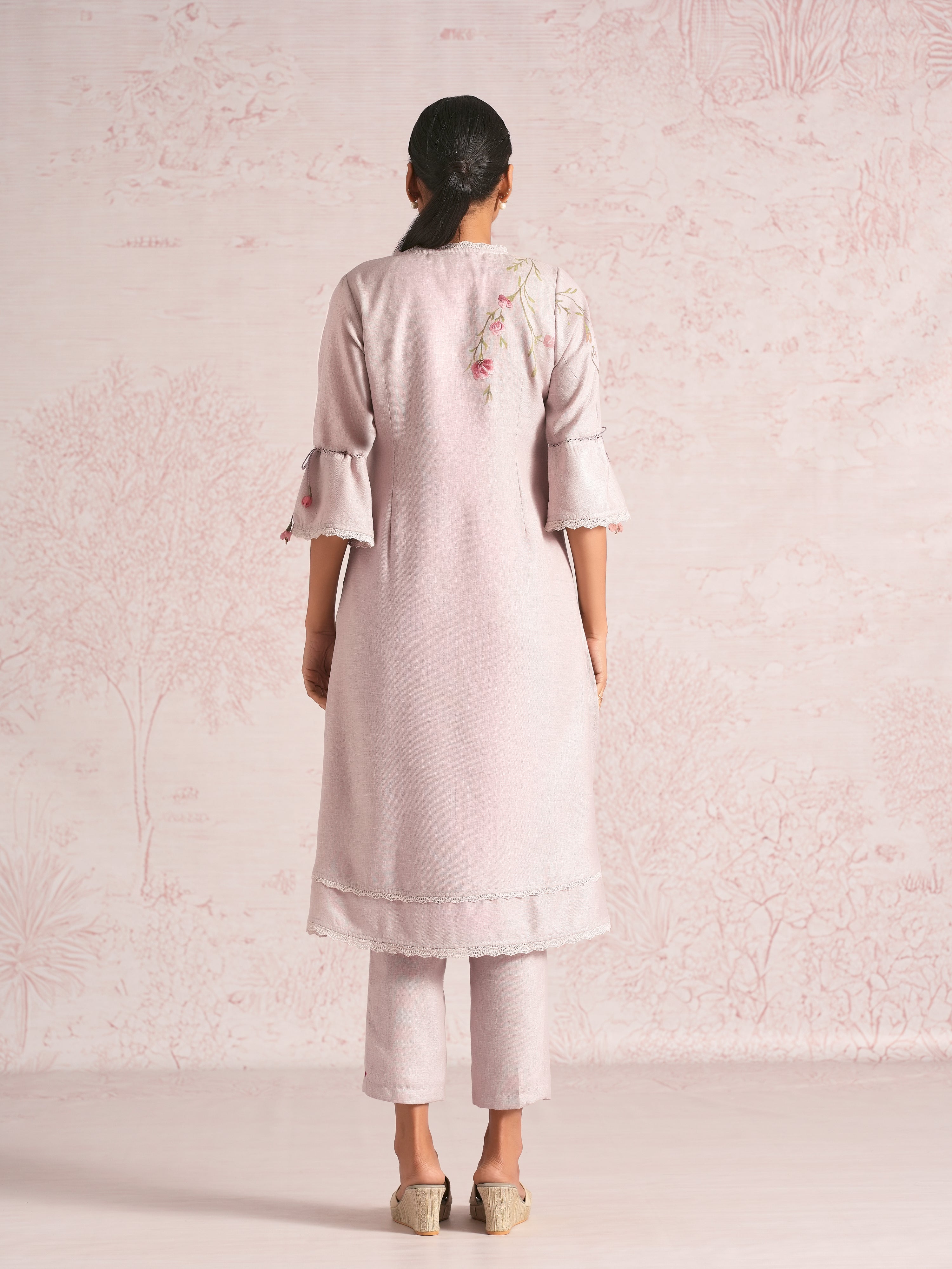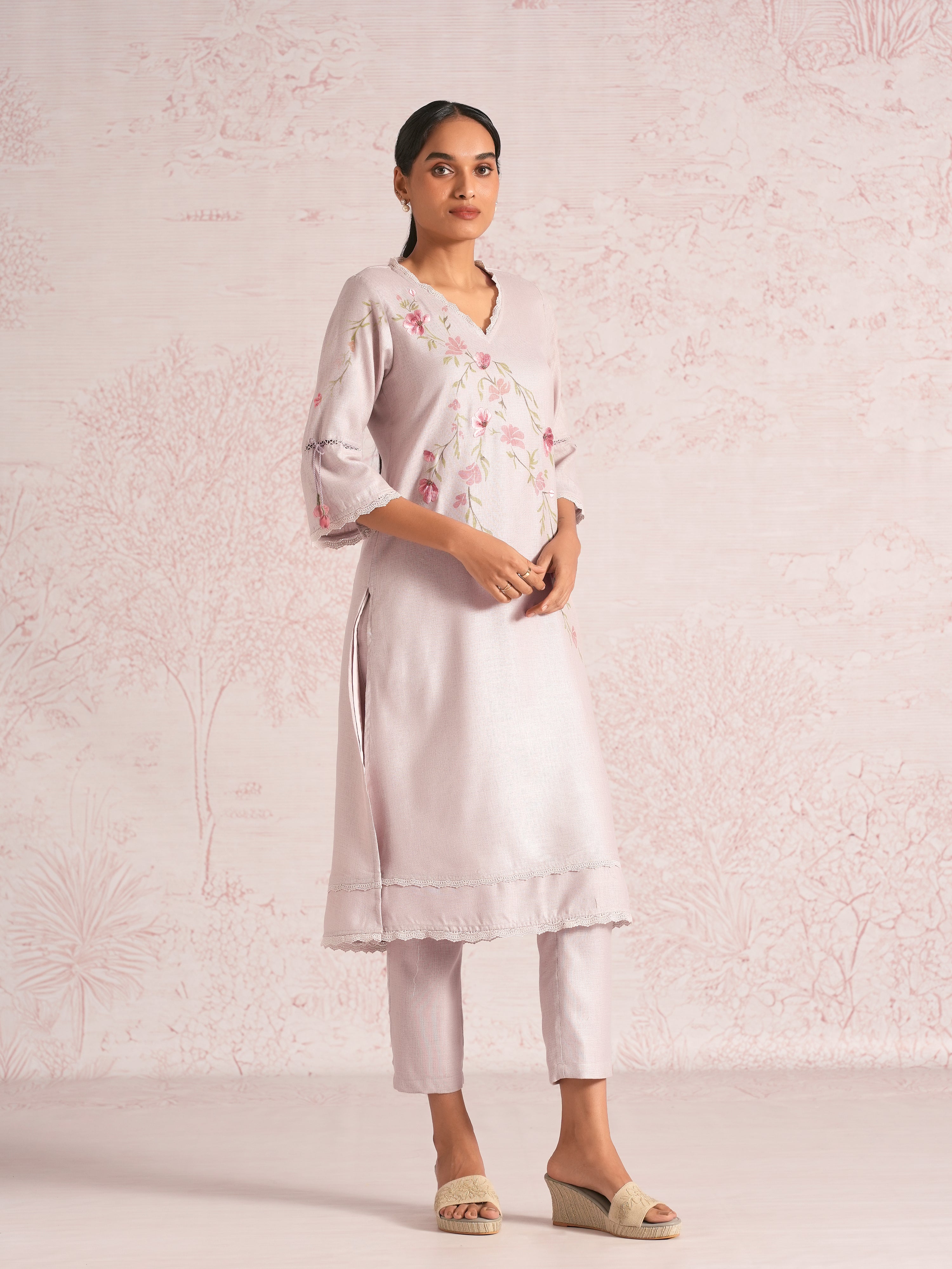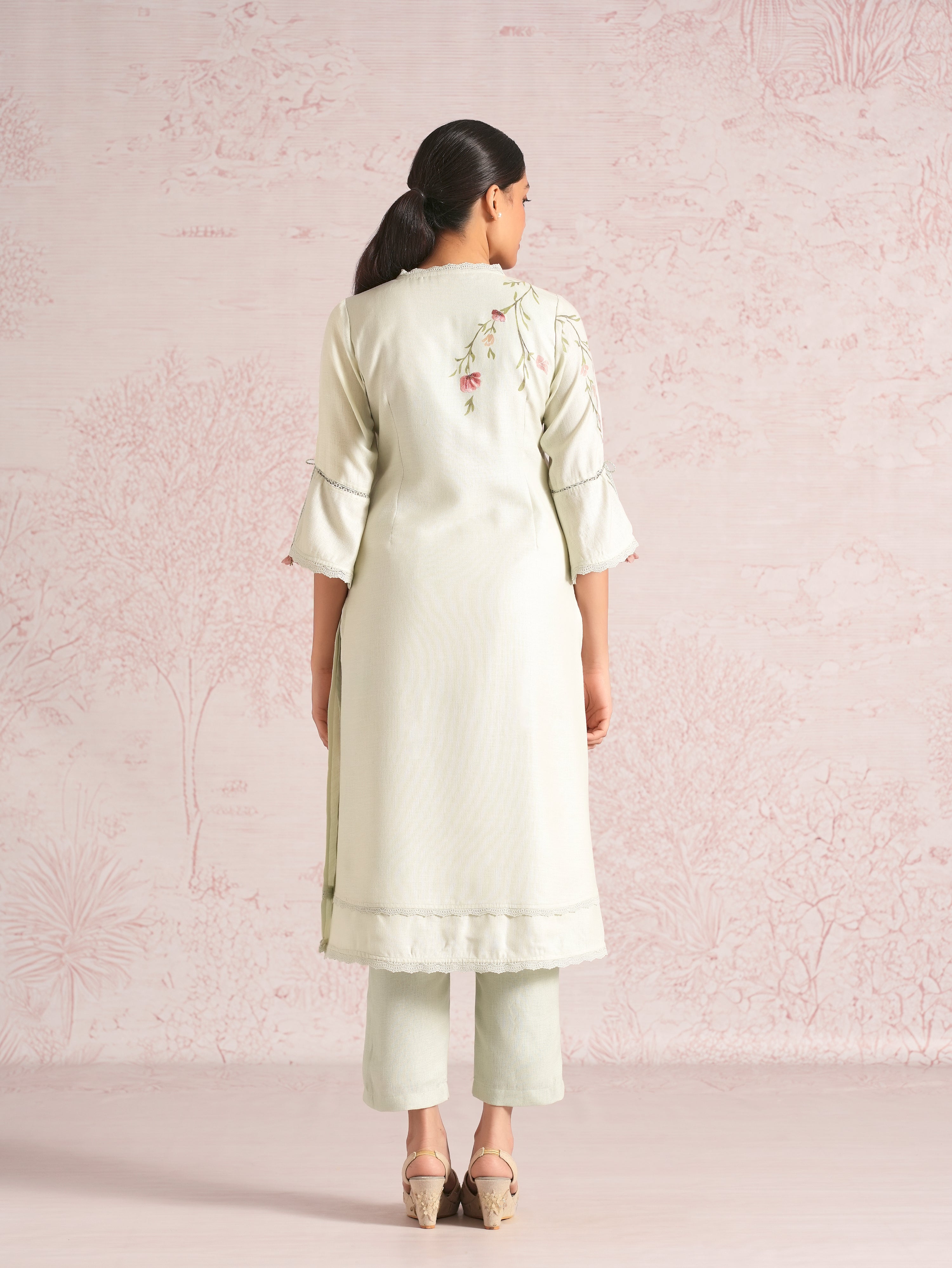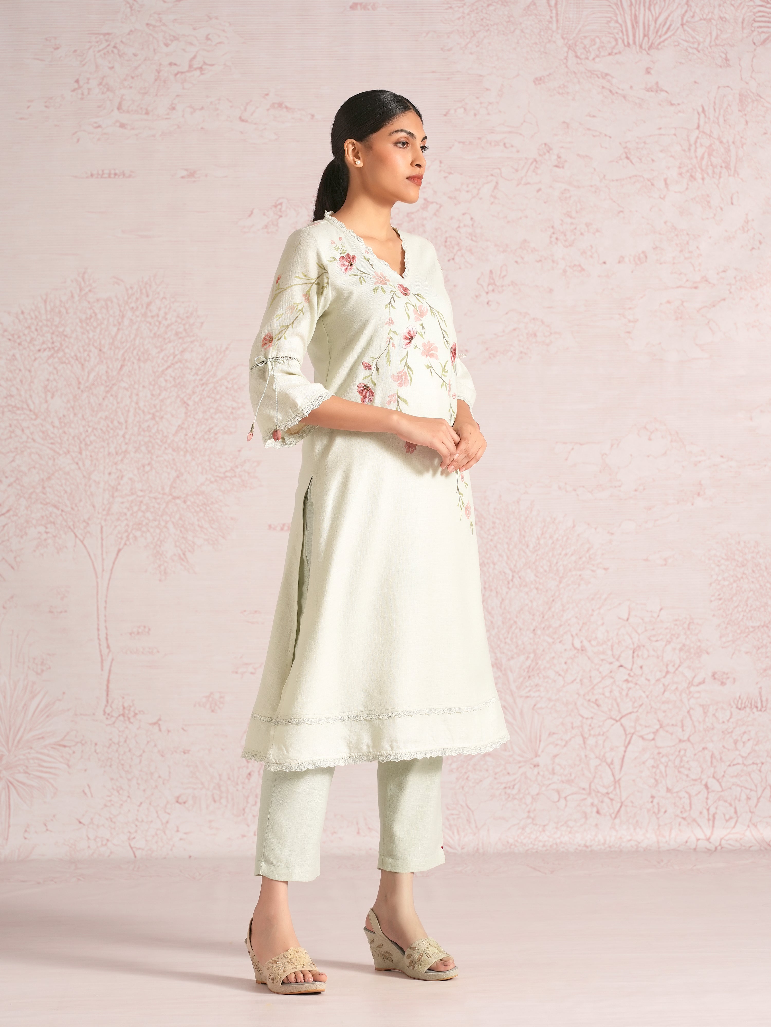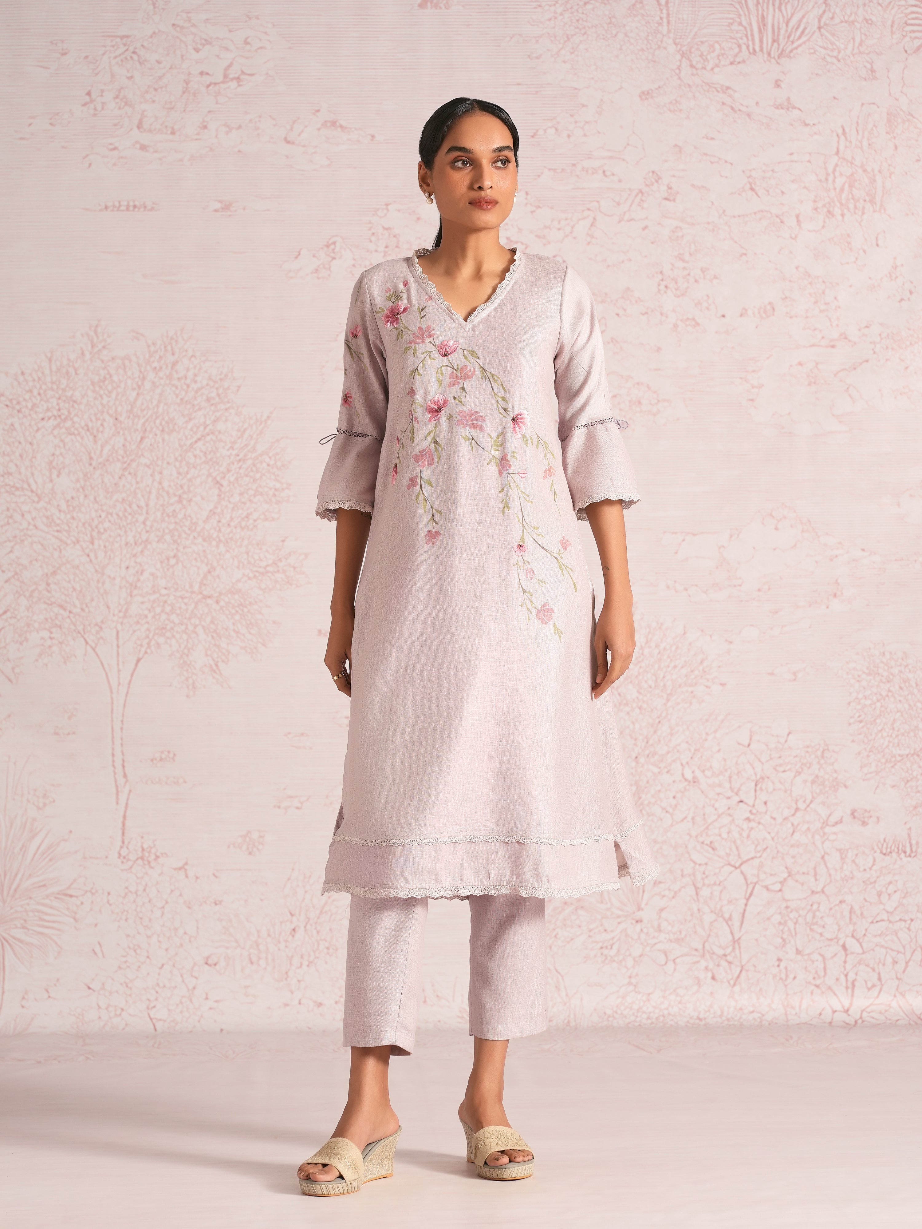Blush Vines unfolds as a quiet ode to spring, where graceful vines wander delicately across each garment, creating a sense of natural movement and understated elegance. Soft, watercolor-washed florals lend the collection a painterly lightness, as though brushed gently onto fabric, enhancing its refined and airy character. Presented in serene hues of Bonny Green and Mauve, the palette evokes freshness, calm, and subtle romance. Feminine silhouettes such as peplum tops, tree tops, and a timeless waistcoat bring structure to the fluid compositions, striking a beautiful balance between softness and form. Light, elegant, and thoughtfully detailed, Blush Vines is designed for the spring–summer season — an effortless expression of grace, charm, and modern femininity.