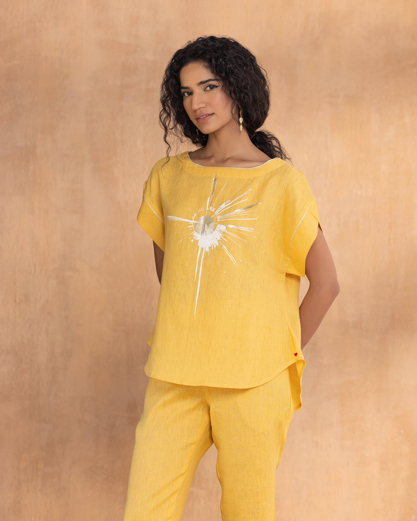 gold. Its off-white khadi print with ice gold foil is balanced by grounded colours and a