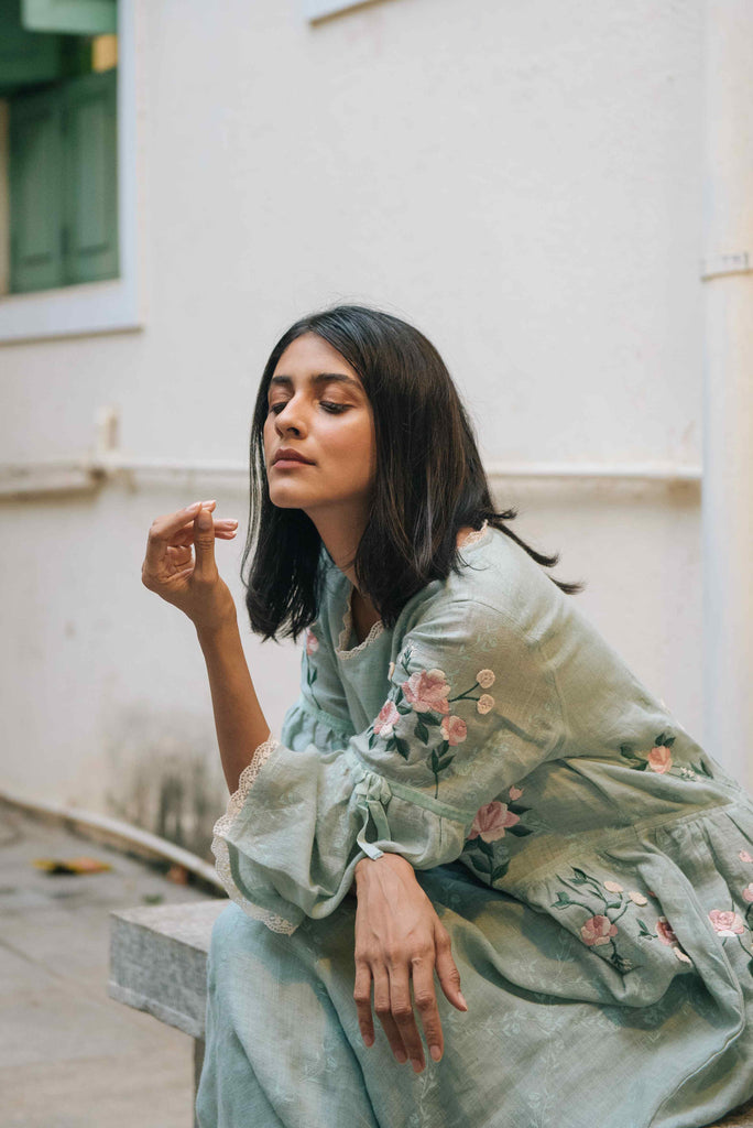 The romance of old-world old-school classic "Amanda" dress, with a simple round neck edged with pretty lace, and gathered at the waist. Printed with the "Garden Trellis" design with rose embroidery and crochet bud applique dancing around the waist, velvet bows on the sleeves, finished with a gentle ruffle on the hem. This dress is just so pretty!