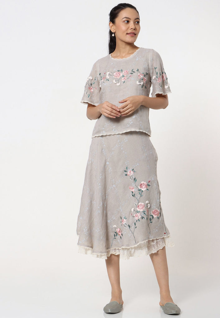 Short blouse printed with the "Garden Trellis" design with rose embroidery and crochet bud applique, velvet bows on the sleeves, all edged with pretty romantic lace and delicate ties and tassles to give you just the perfect fit. Goes beautifully with our Lily skirt.