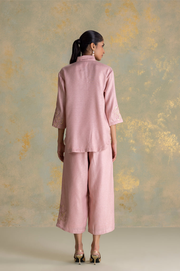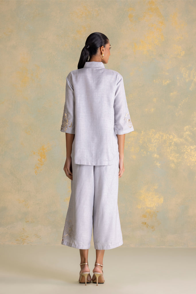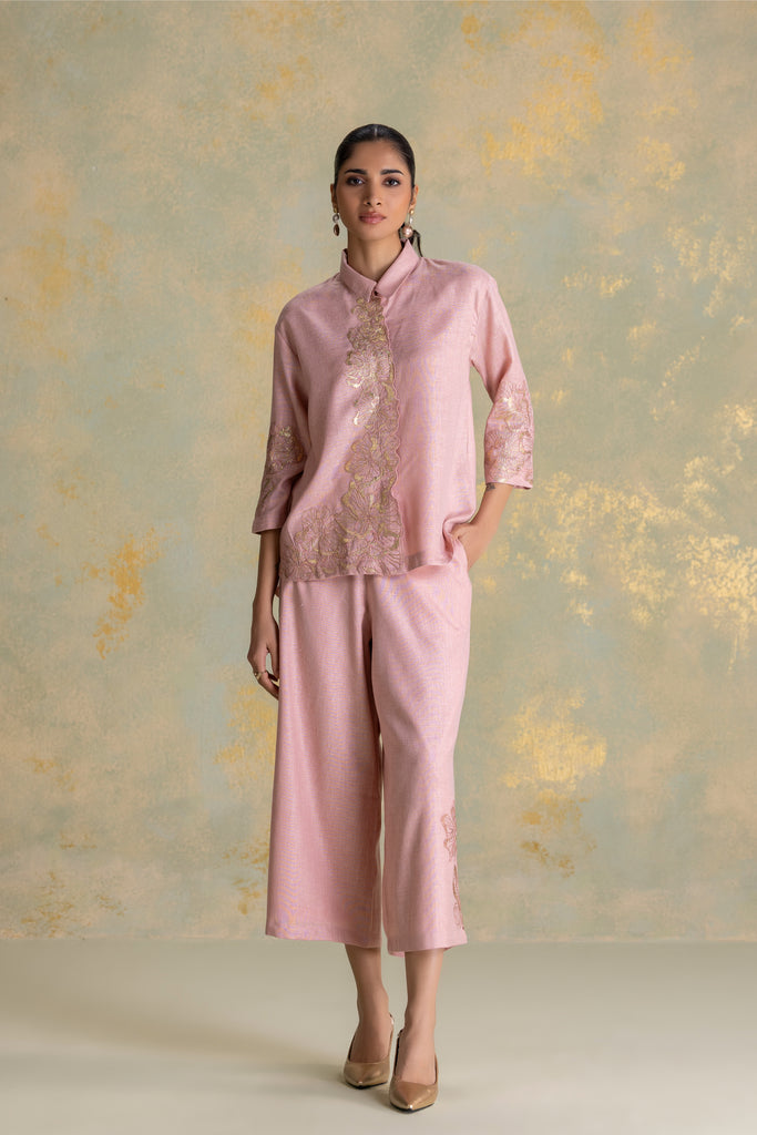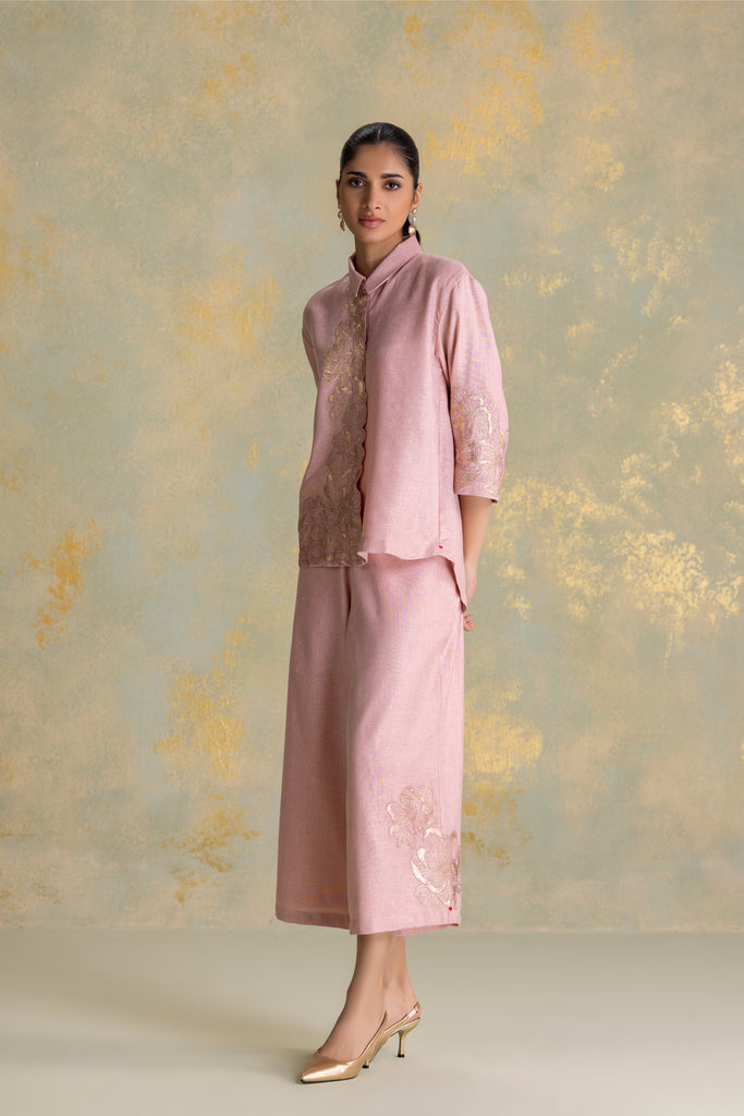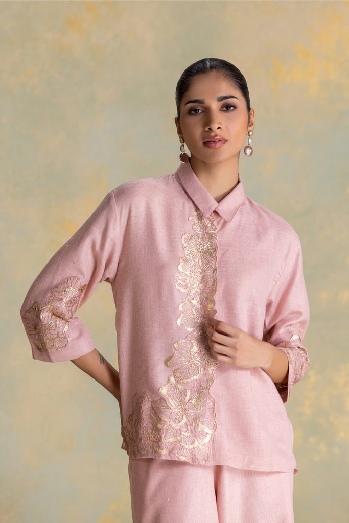 • The shirt features a delicately shaped placket inspired by a blooming flower, highlighted with intricate floral embroidery that traces its contours. • Designed with 3/4 length sleeves and a gentle flare, it combines structure with feminine softness, creating an effortlessly elegant silhouette. • Paired with pants detailed with floral embroidery and a hint of gold shimmer running along one leg, the look balances subtle artistry with contemporary charm.