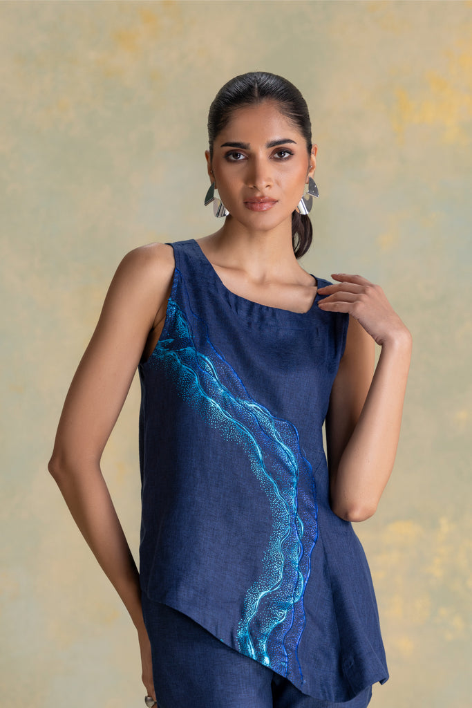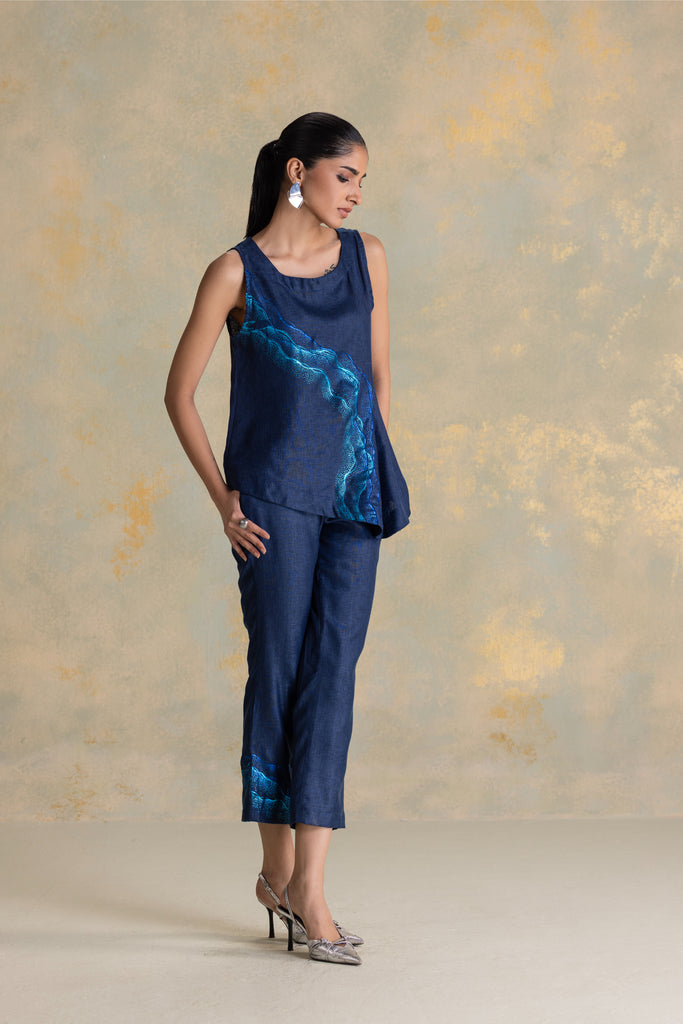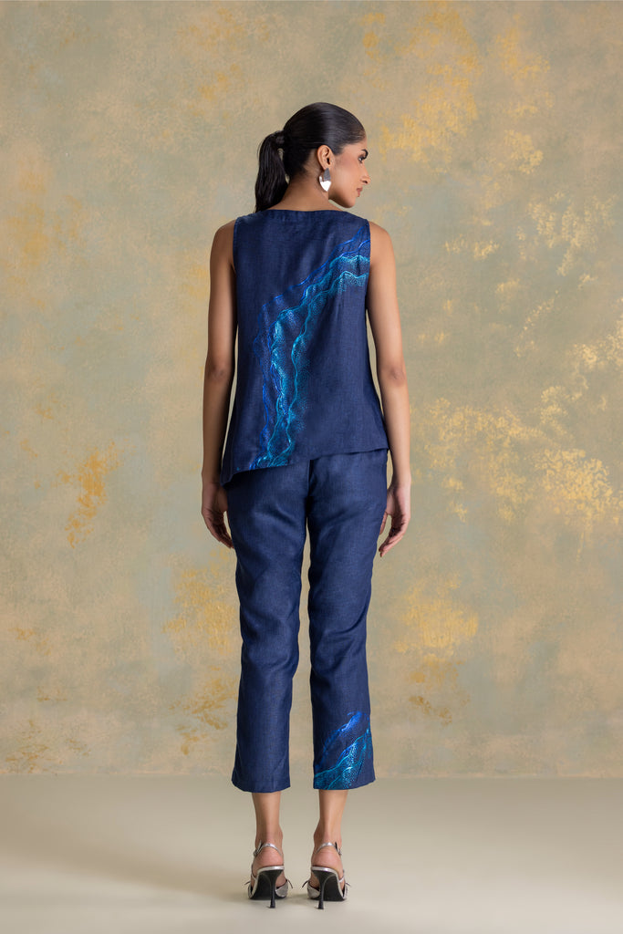 • Round-neck co-ord set with a high-low asymmetric hem, designed for those who appreciate a blend of natural elegance and modern flair. Detailed with foiling embroidery running from the armhole to the hem and paired with matching pants featuring the same foiling and embroidery, it creates a cohesive and radiant look.