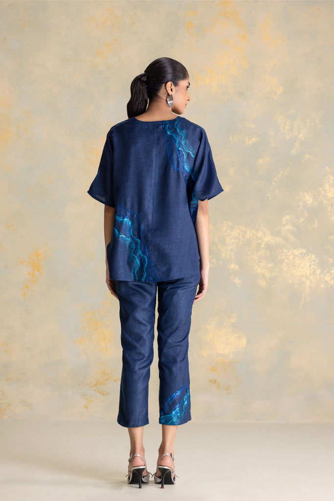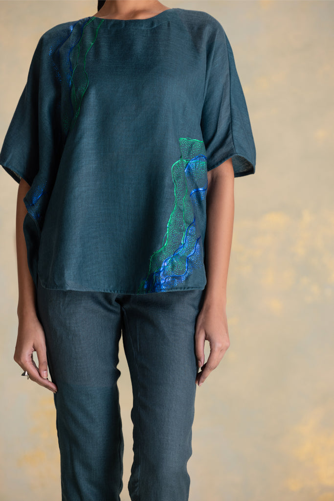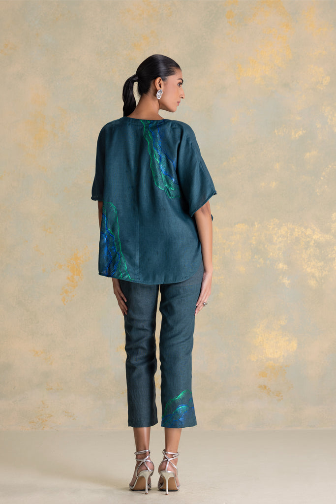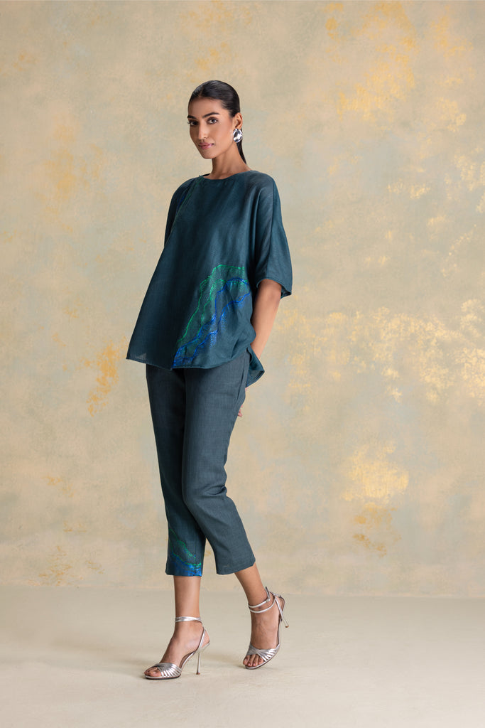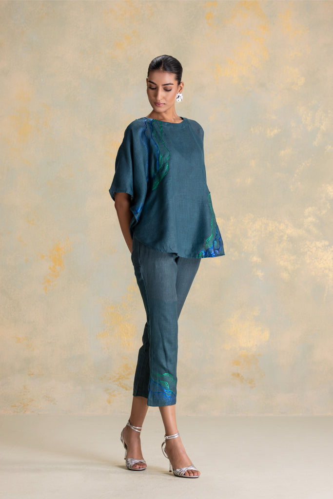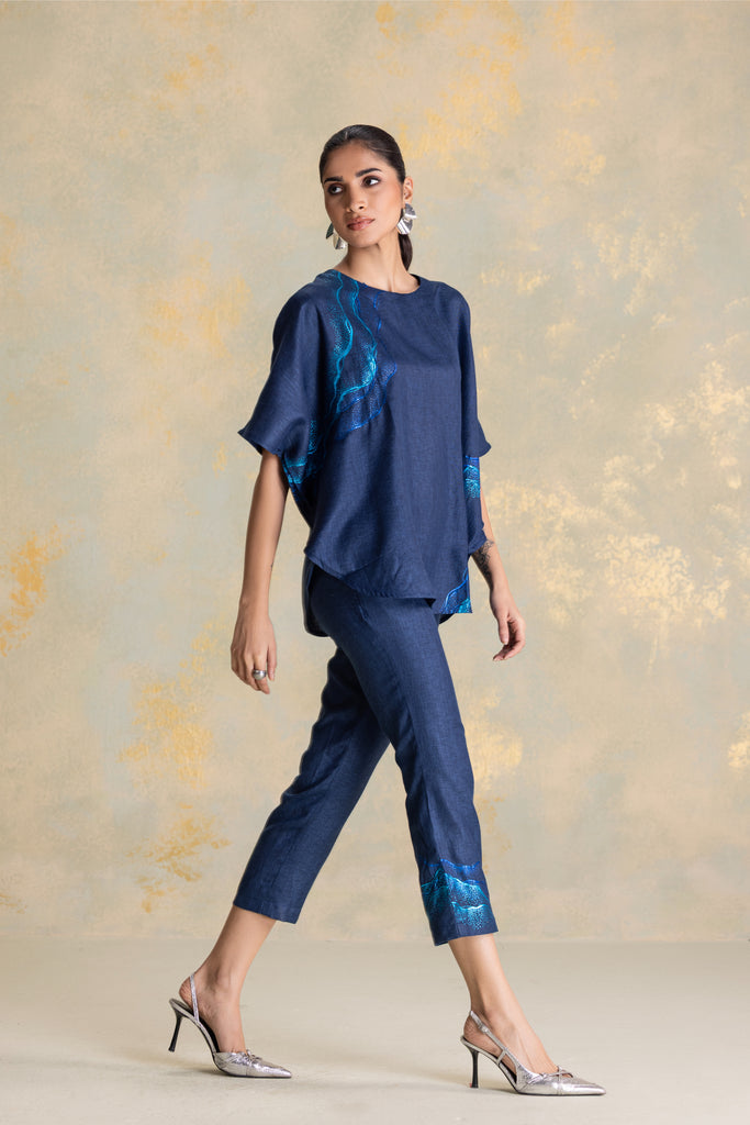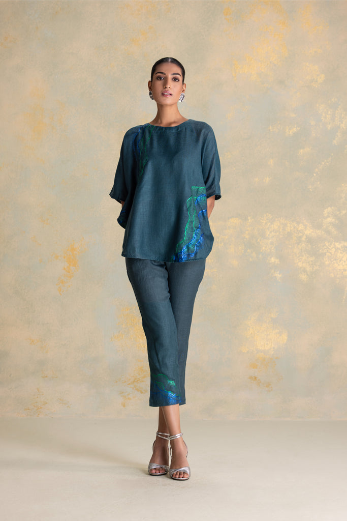• Round-neck top with extended 3/4 sleeves and a curved hem, featuring foiling and embroidery placed along the neckline and hem, adding a subtle shimmer and graceful movement to the silhouette. Paired with matching pants showcasing the same foiling and embroidery along one side, it creates a cohesive and radiant look.