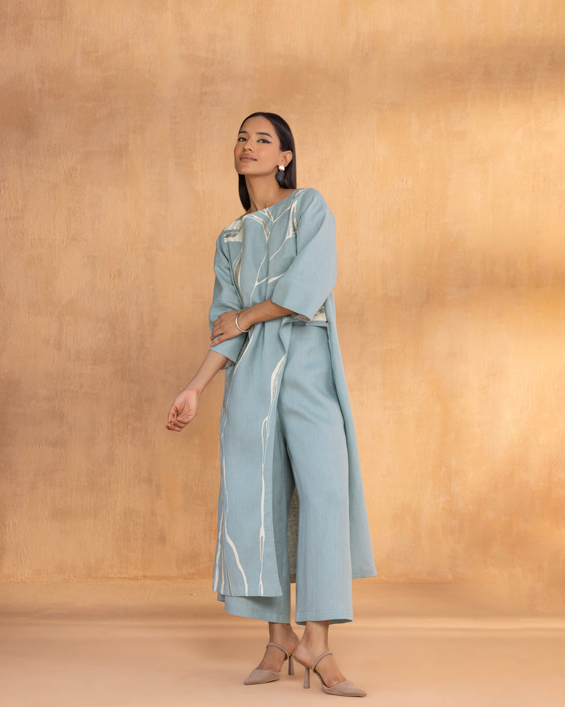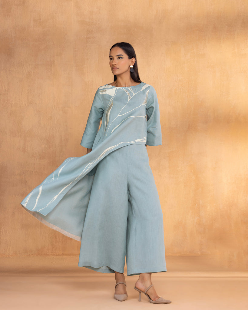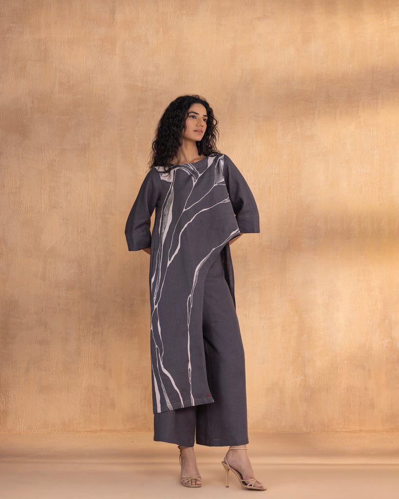 • An asymmetric curve top and relaxed pant, with abstract prints that whisper of shadows and shimmer.