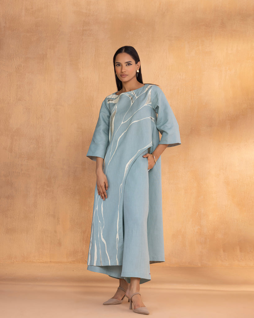Mysterious, modern, and quietly powerful, Quantum Theory reimagines elegance through minimal forms and abstract details. The silhouettes are clean and fluid—simple to wear, yet rich with intention. In a palette of Charcoal & Jade the collection evokes a world of shadows and shimmer, where beauty lives in the unseen. Each piece is a quiet statement, balancing presence and intrigue—like a whispered thought, or the moment before something shifts.