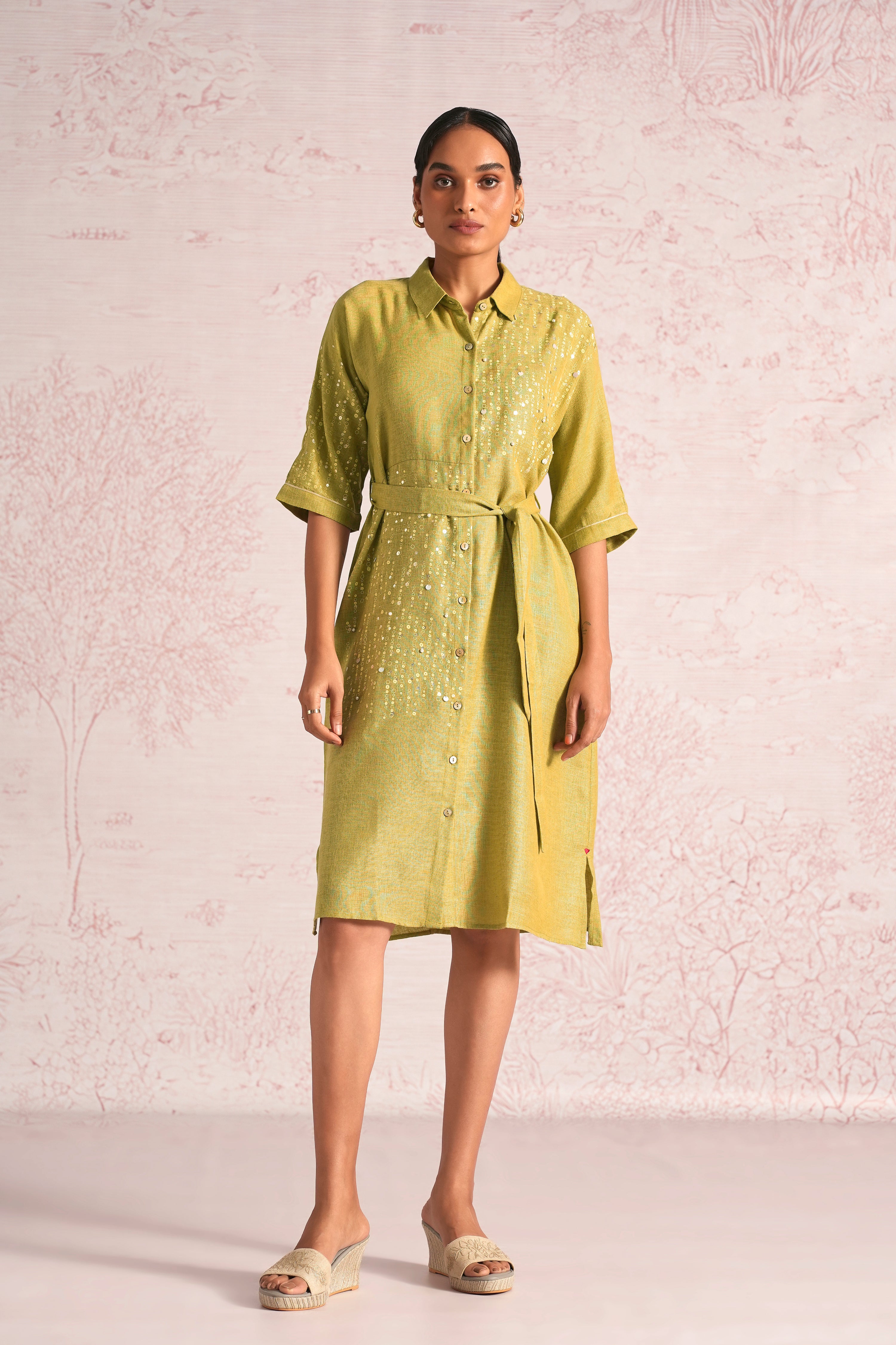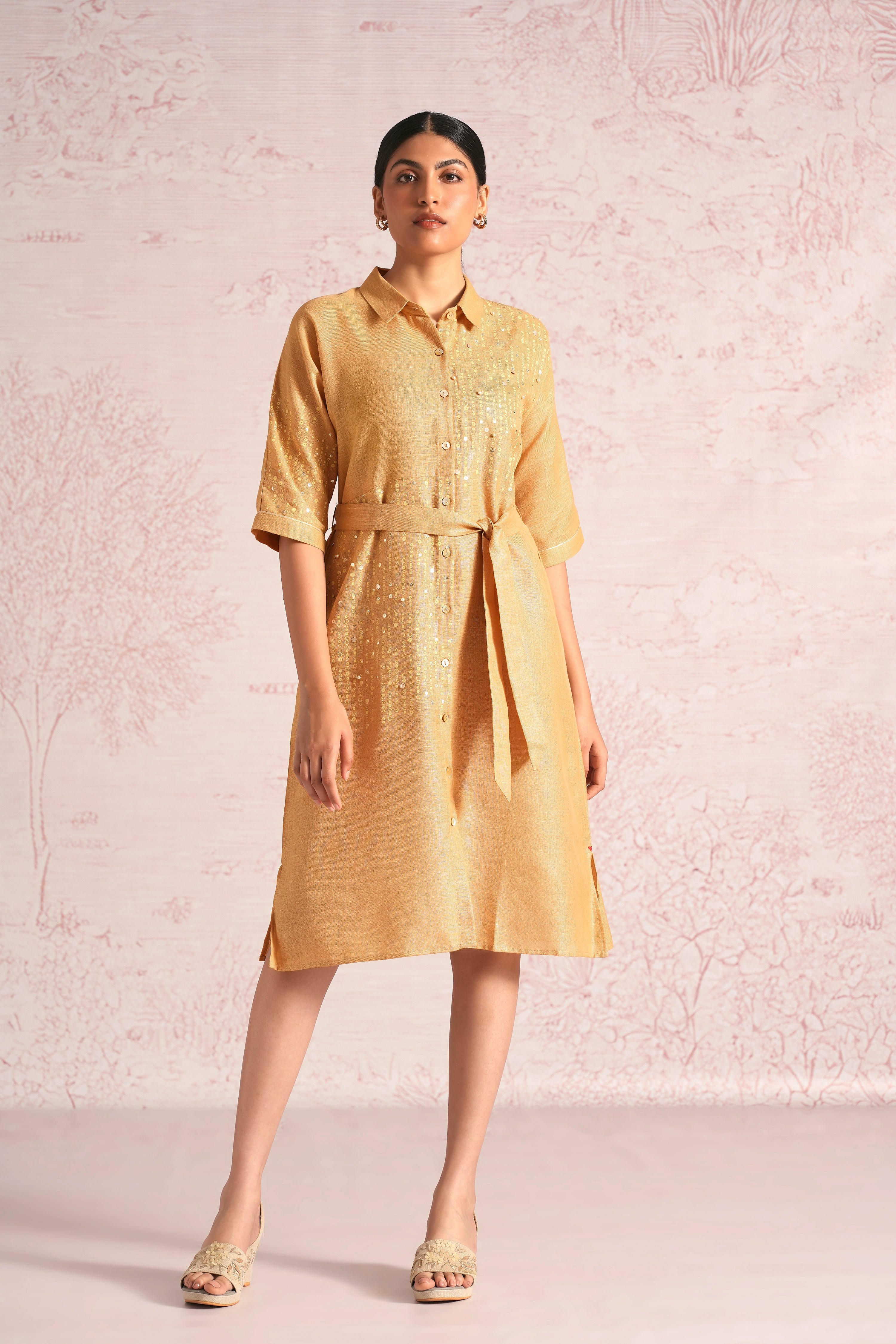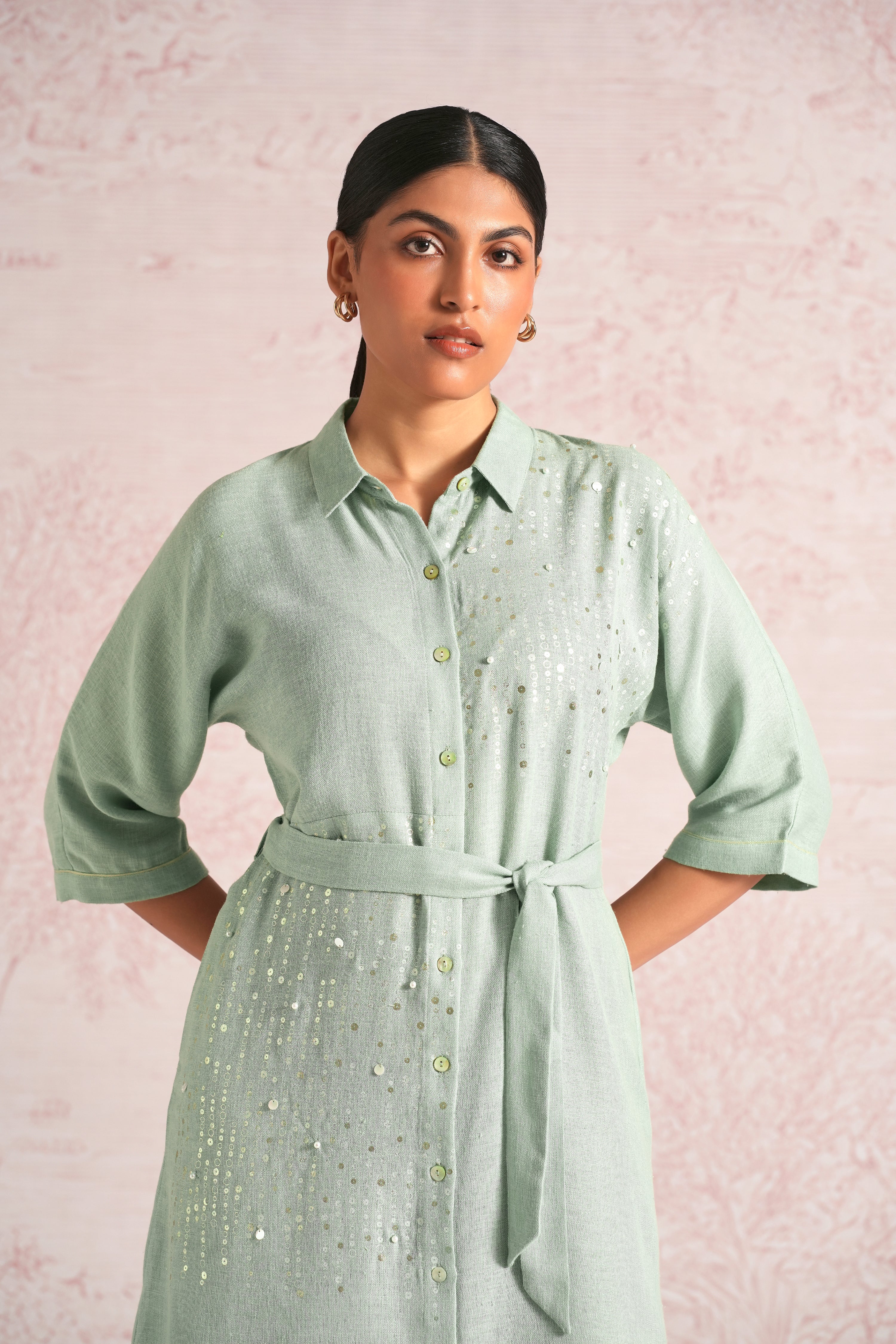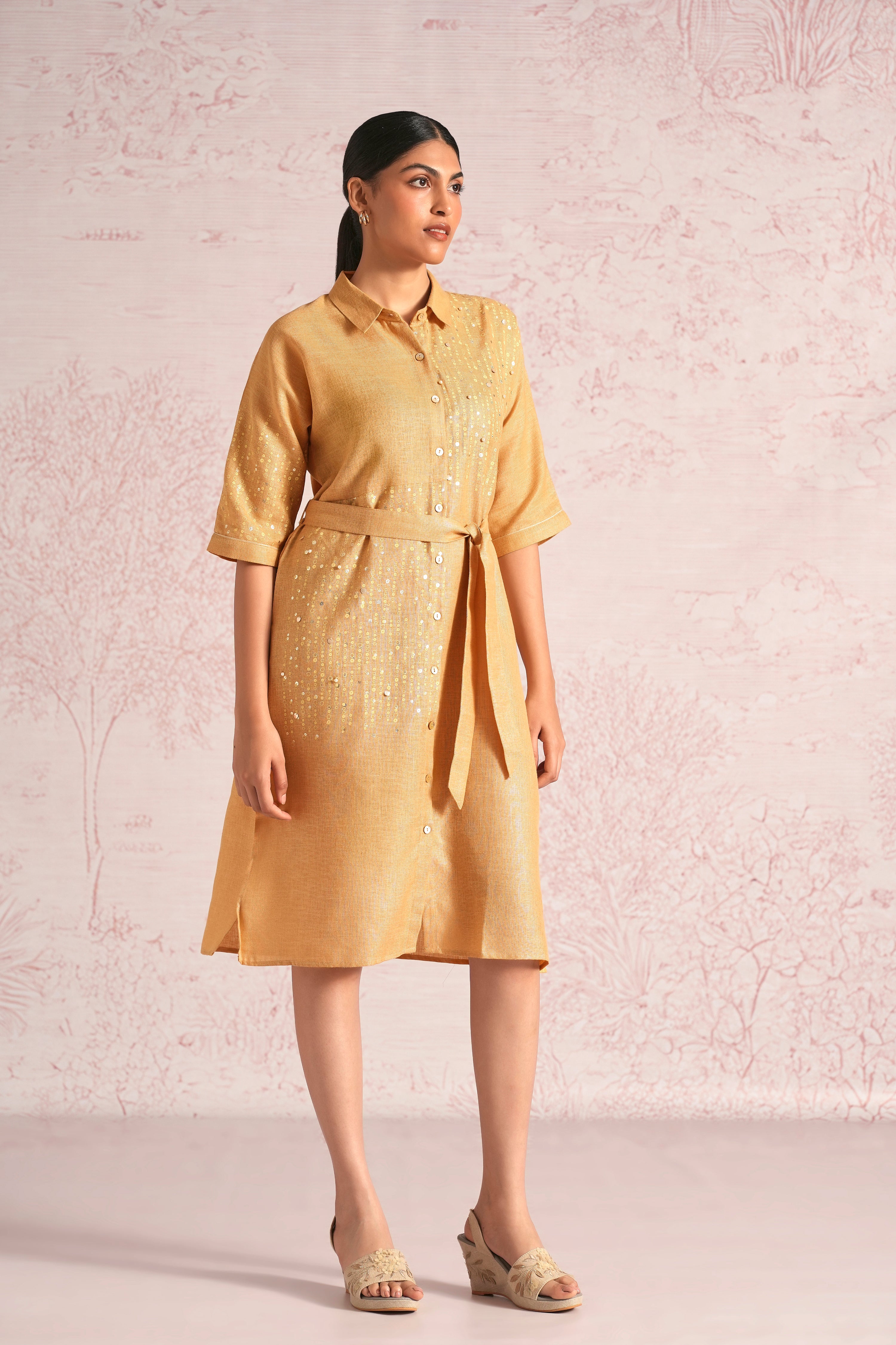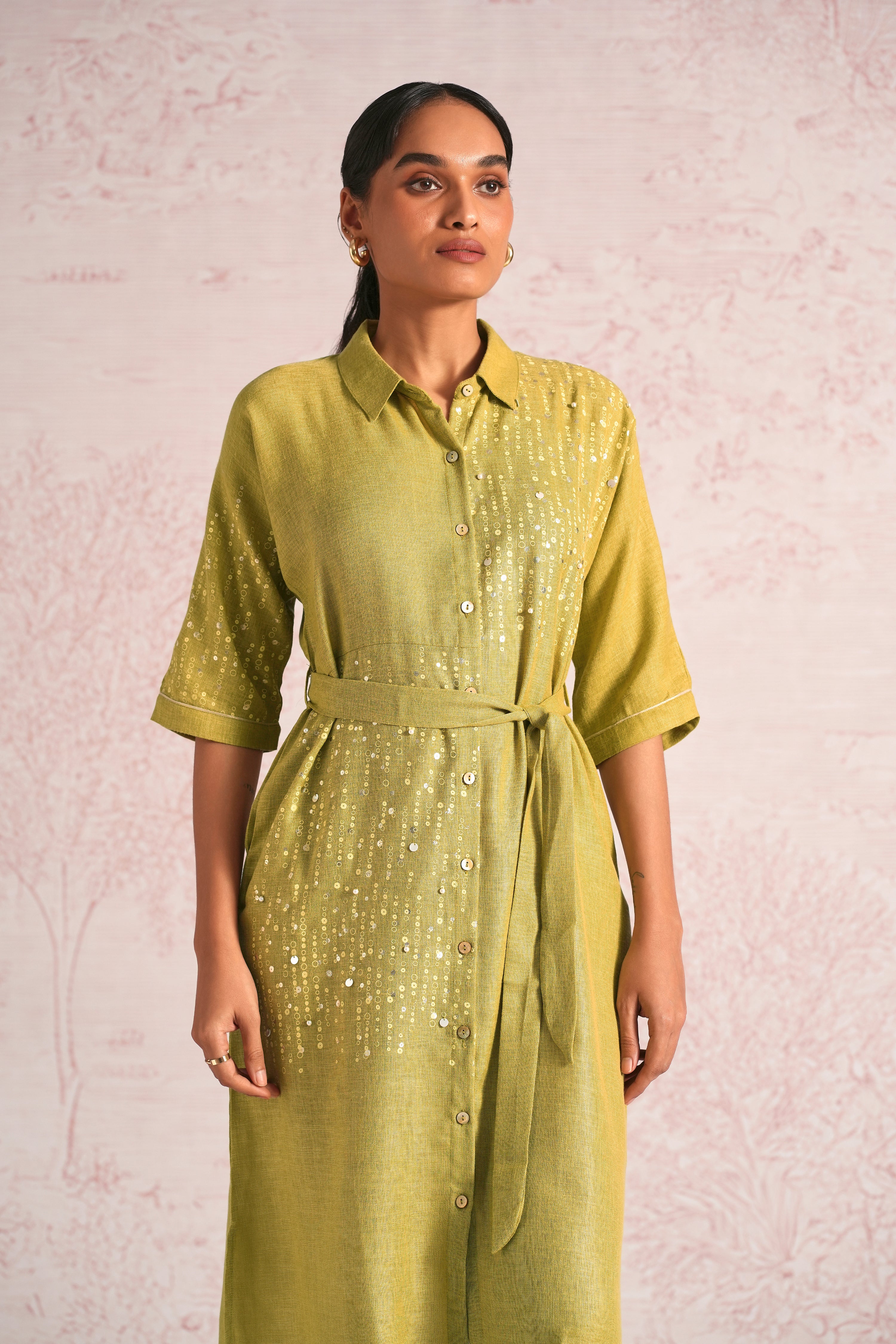Shimmer strings is a quiet celebration of light and movement, where delicate shimmery strings fall like a gentle drizzle across each silhouette. A thoughtful play of prints is layered with subtle sequin and bead embroidery, finished with soft touches of foil to create a beautiful play of light. The harmony of techniques keeps the design effortlessly elegant. The styles are relaxed, easy to wear, and stylish, making them perfect for all occasions. Finished in soft pear and warm cashew tones, Strings of shimmer captures understated glamour with timeless ease.