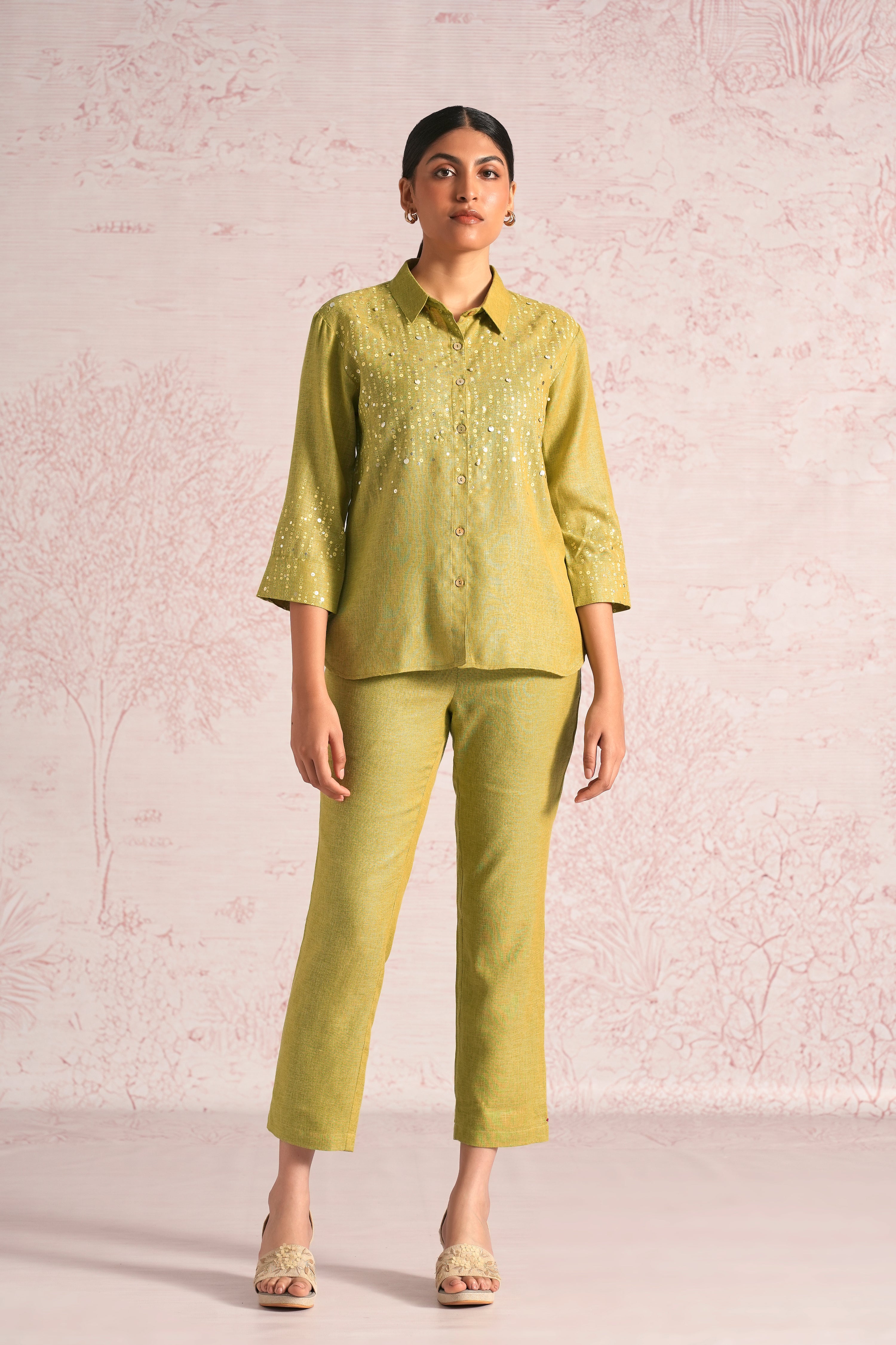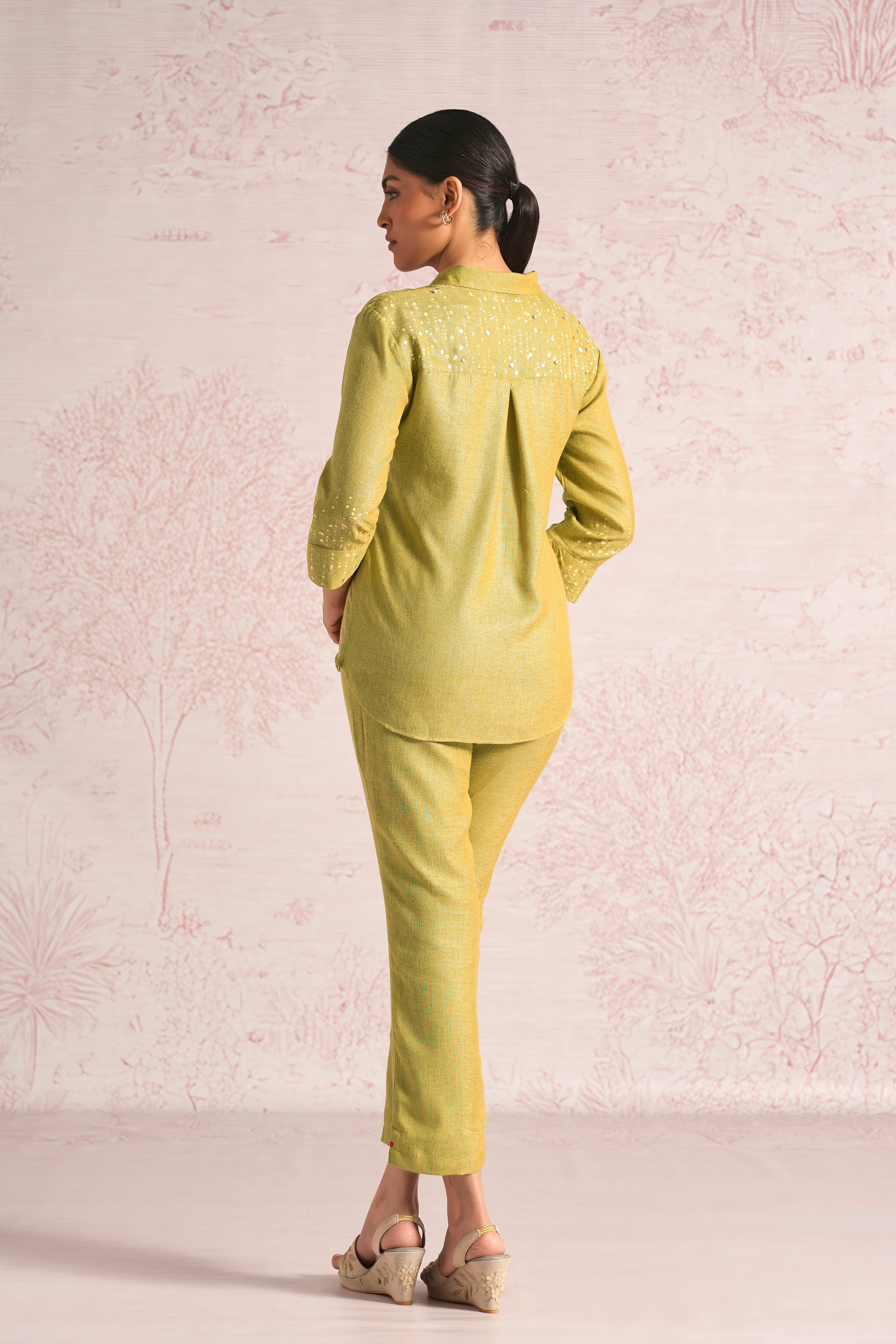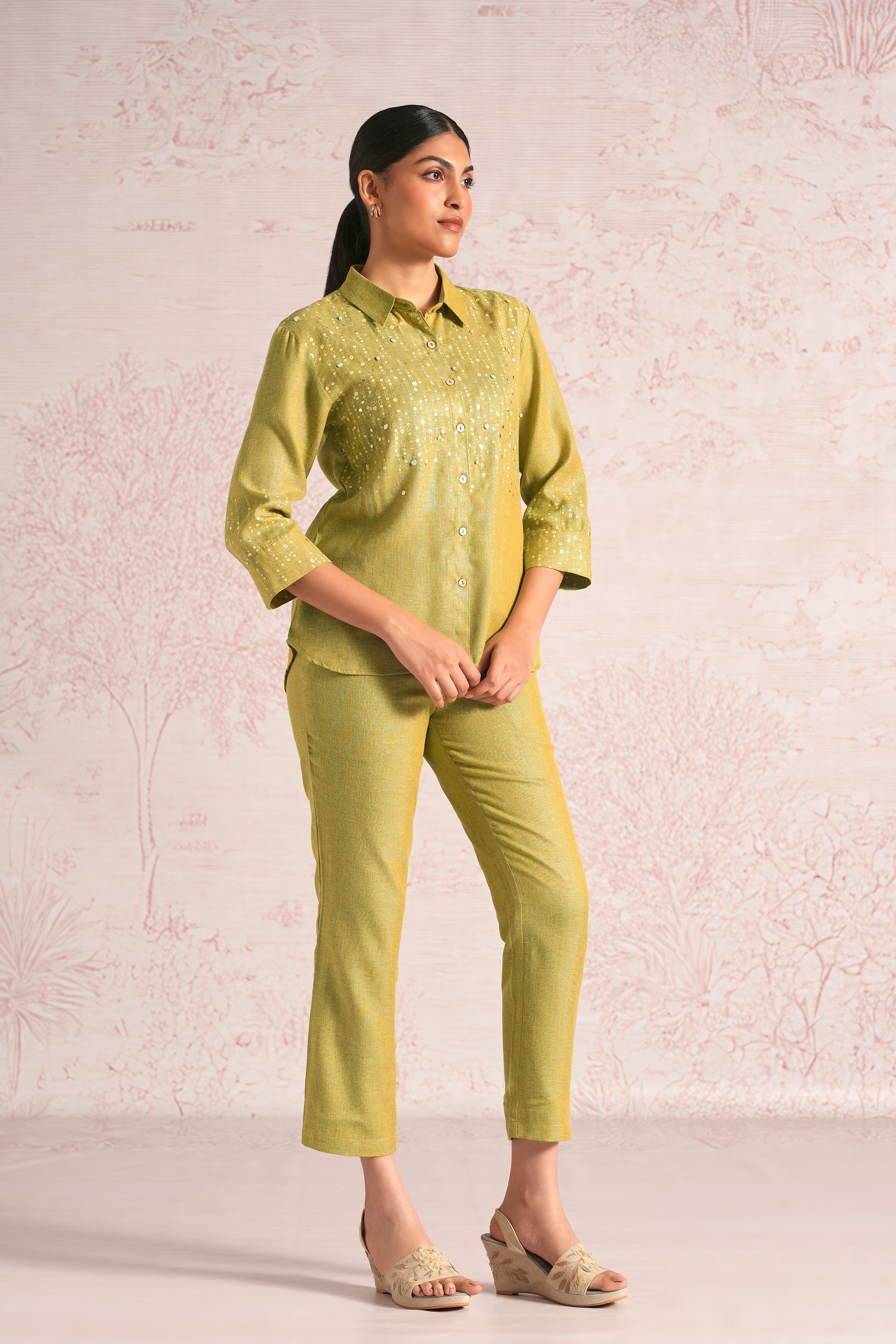 Shimmer strings is a quiet celebration of light and movement, where delicate shimmery strings fall like a gentle drizzle across each silhouette. A thoughtful play of prints is layered with subtle sequin and bead embroidery, finished with soft touches of foil to create a beautiful play of light. The harmony of techniques keeps the design effortlessly elegant. The styles are relaxed, easy to wear, and stylish, making them perfect for all occasions. Finished in soft pear and warm cashew tones, Strings of shimmer captures understated glamour with timeless ease.