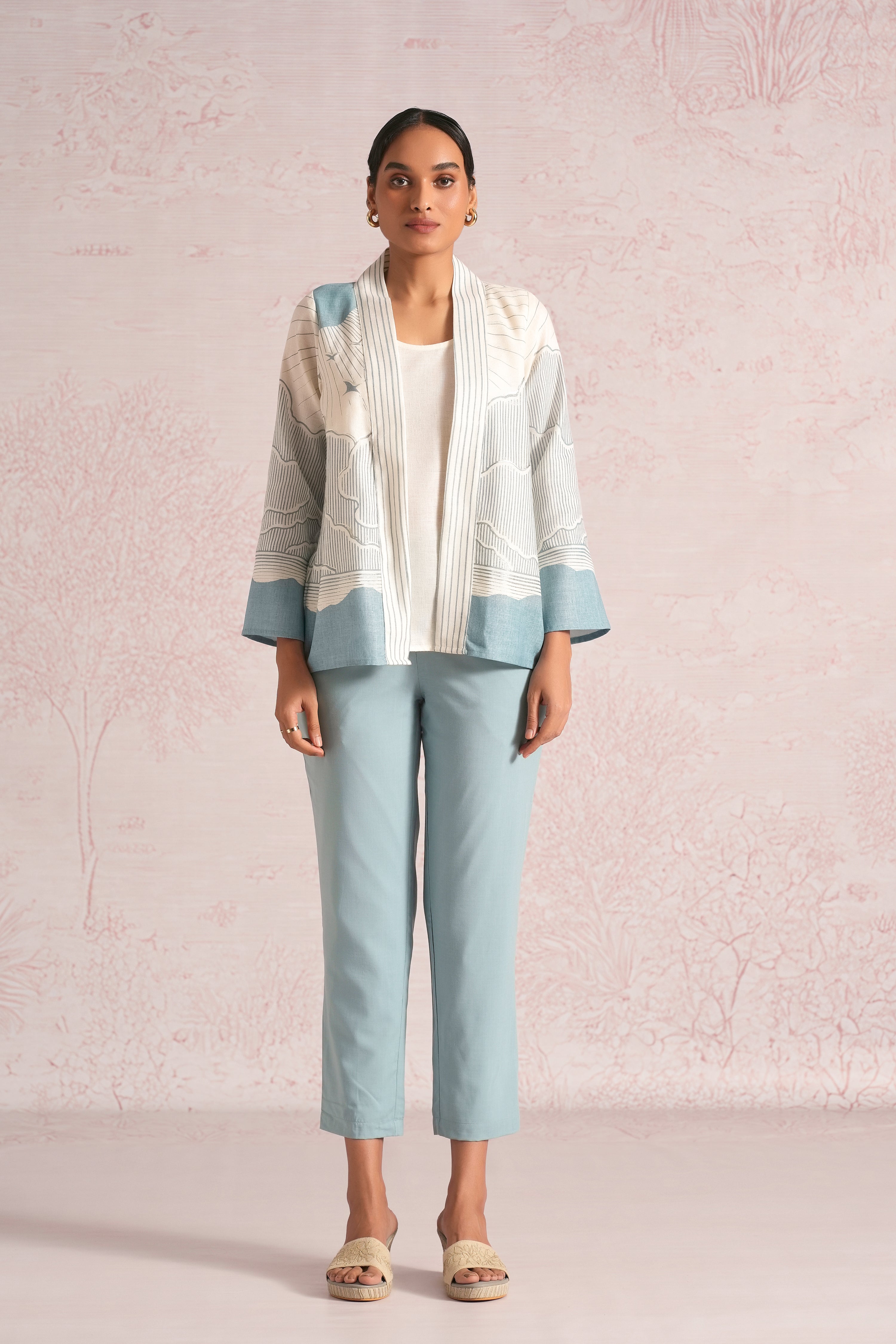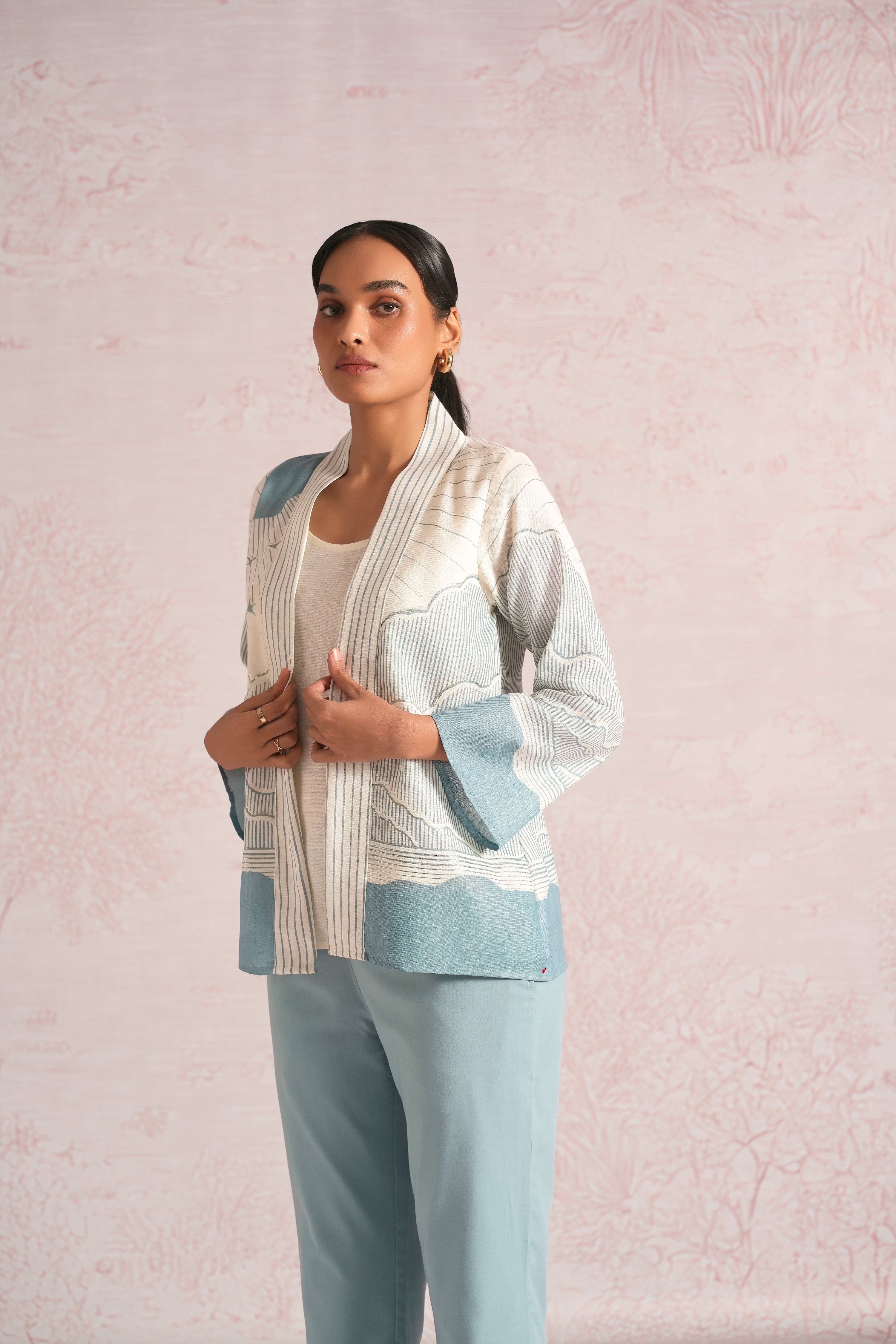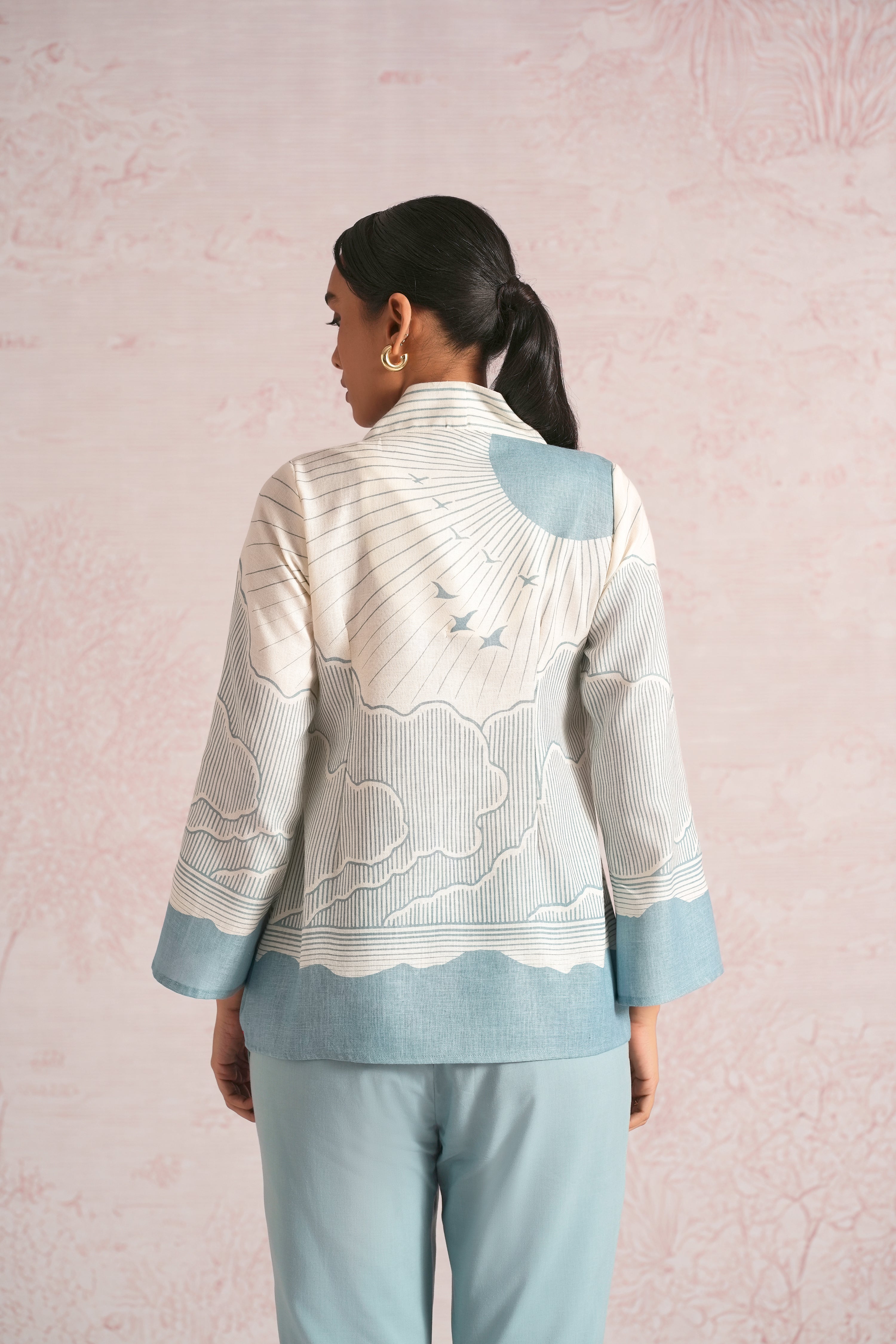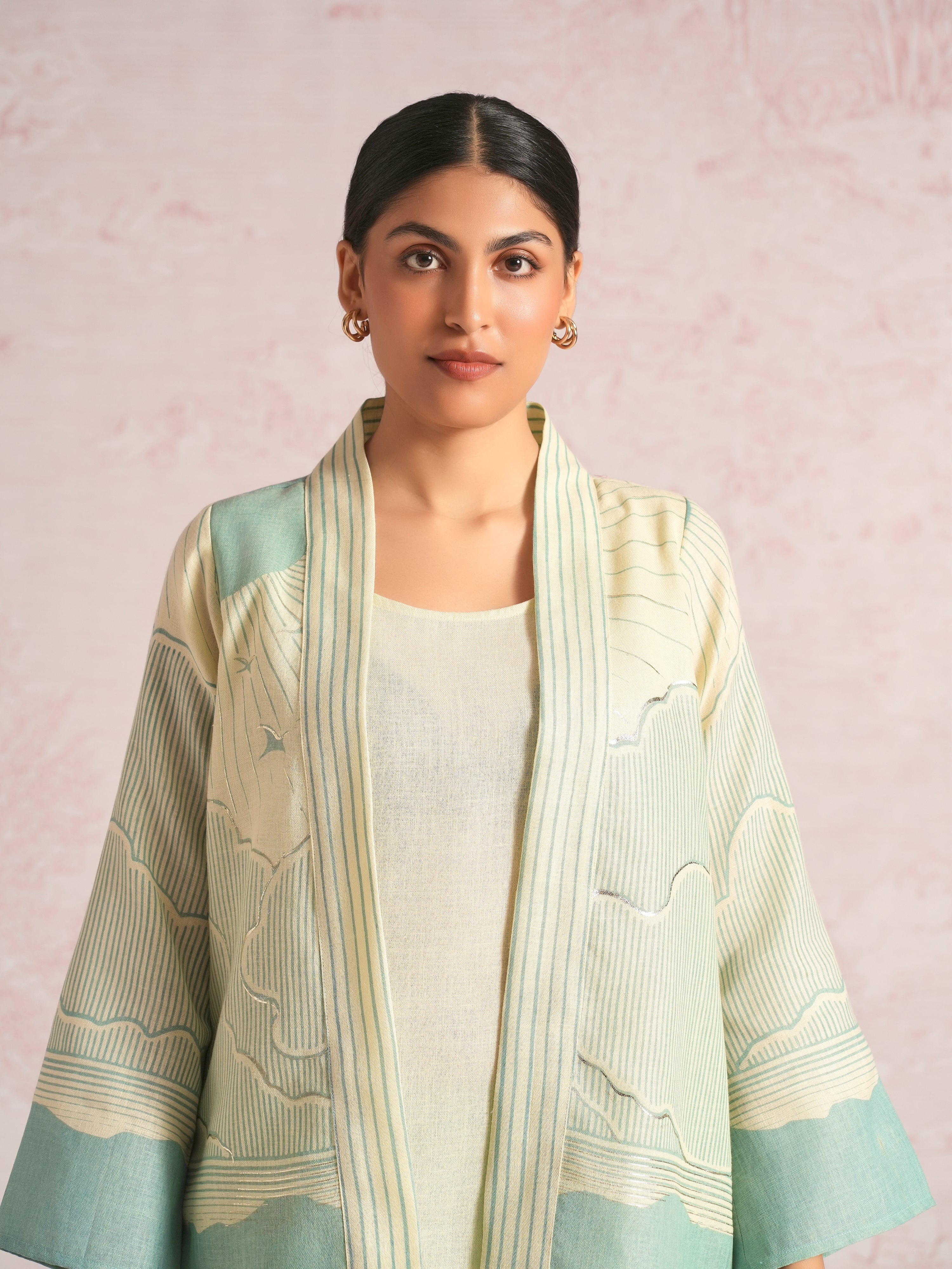 Silver Lining draws from open horizons and the gentle play of light across the landscape. Scenic prints unfold through fluid abstract lines, finished with a soft shimmer of gold foil that feels like sunlight resting on the earth. The colour stories—off-white with blueberry and lane green with sea green—feel fresh, soothing, and effortlessly elegant. Smart yet relaxed, the styles are designed for sunlit days, leisurely brunches, and open-air moments. Silver Lining brings an easy sense of polish to everyday dressing, where comfort meets quiet sophistication.