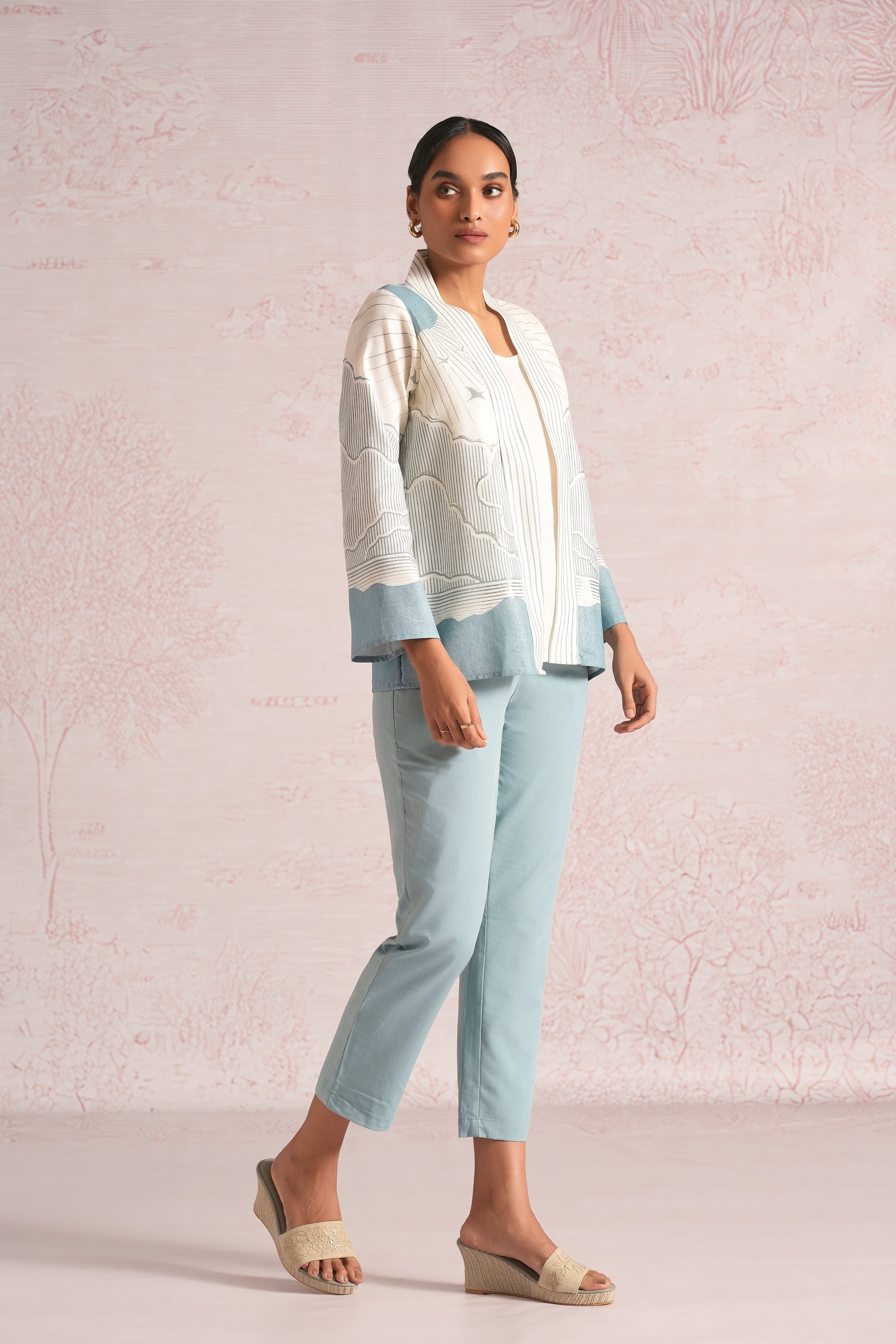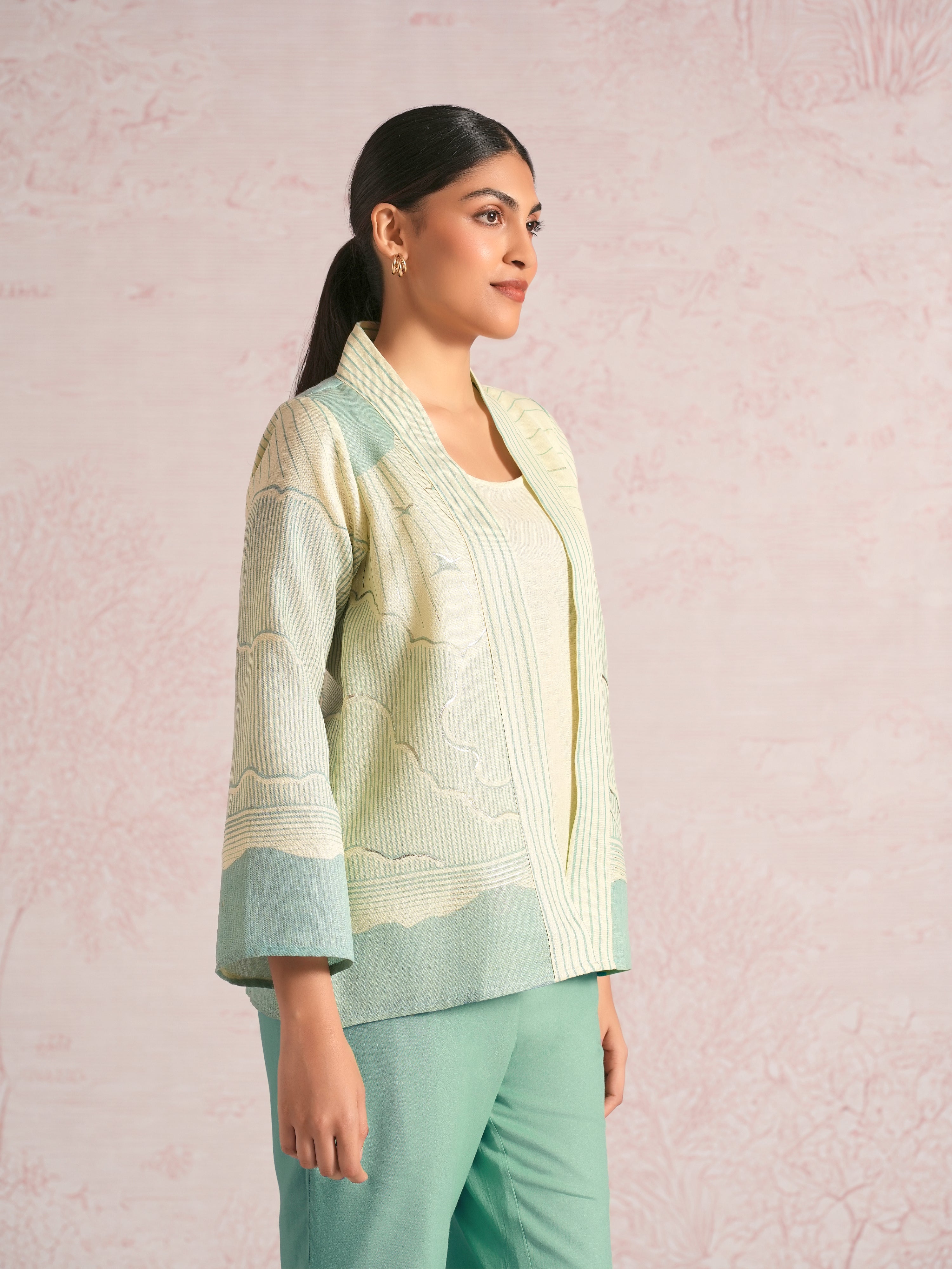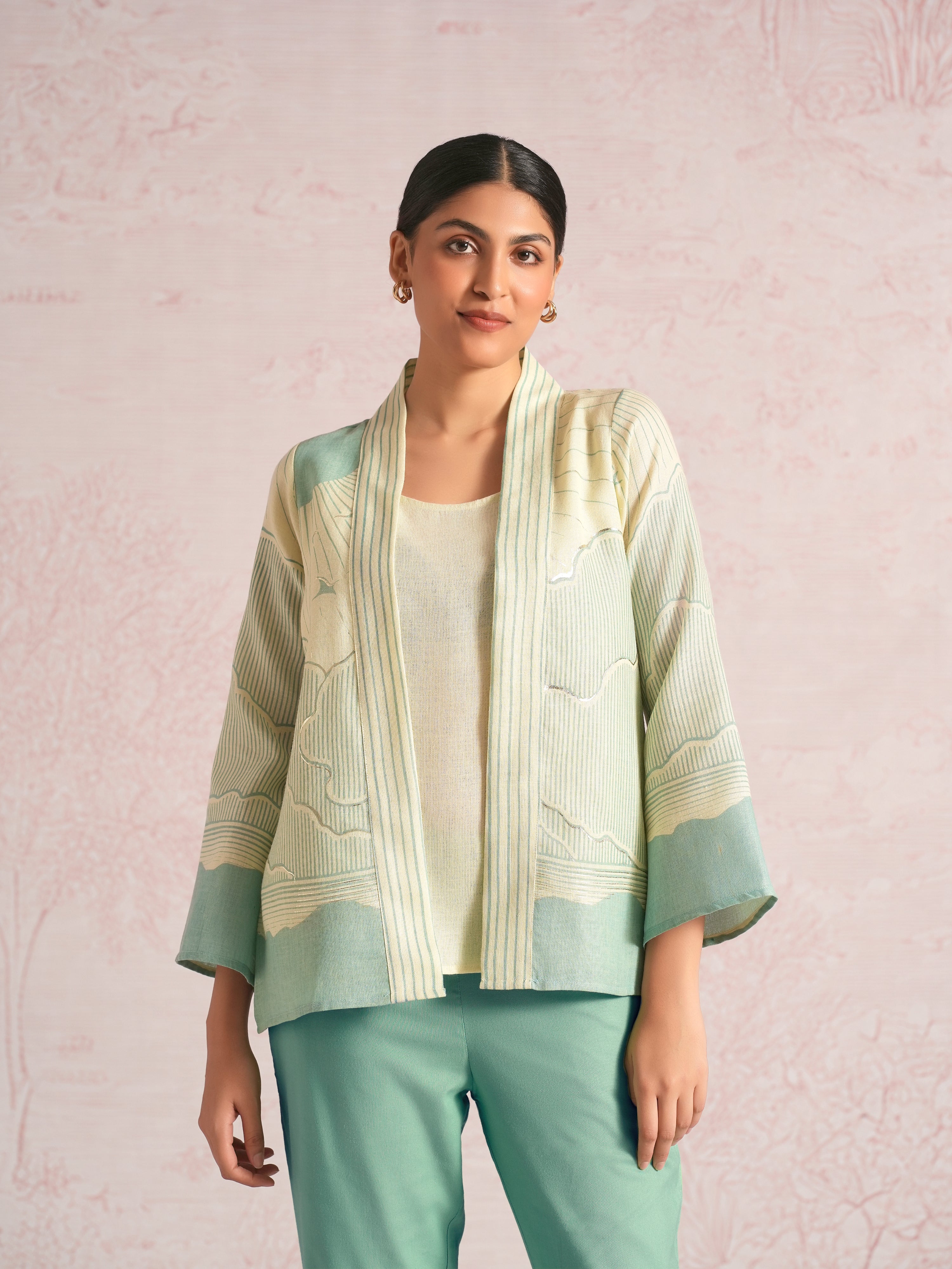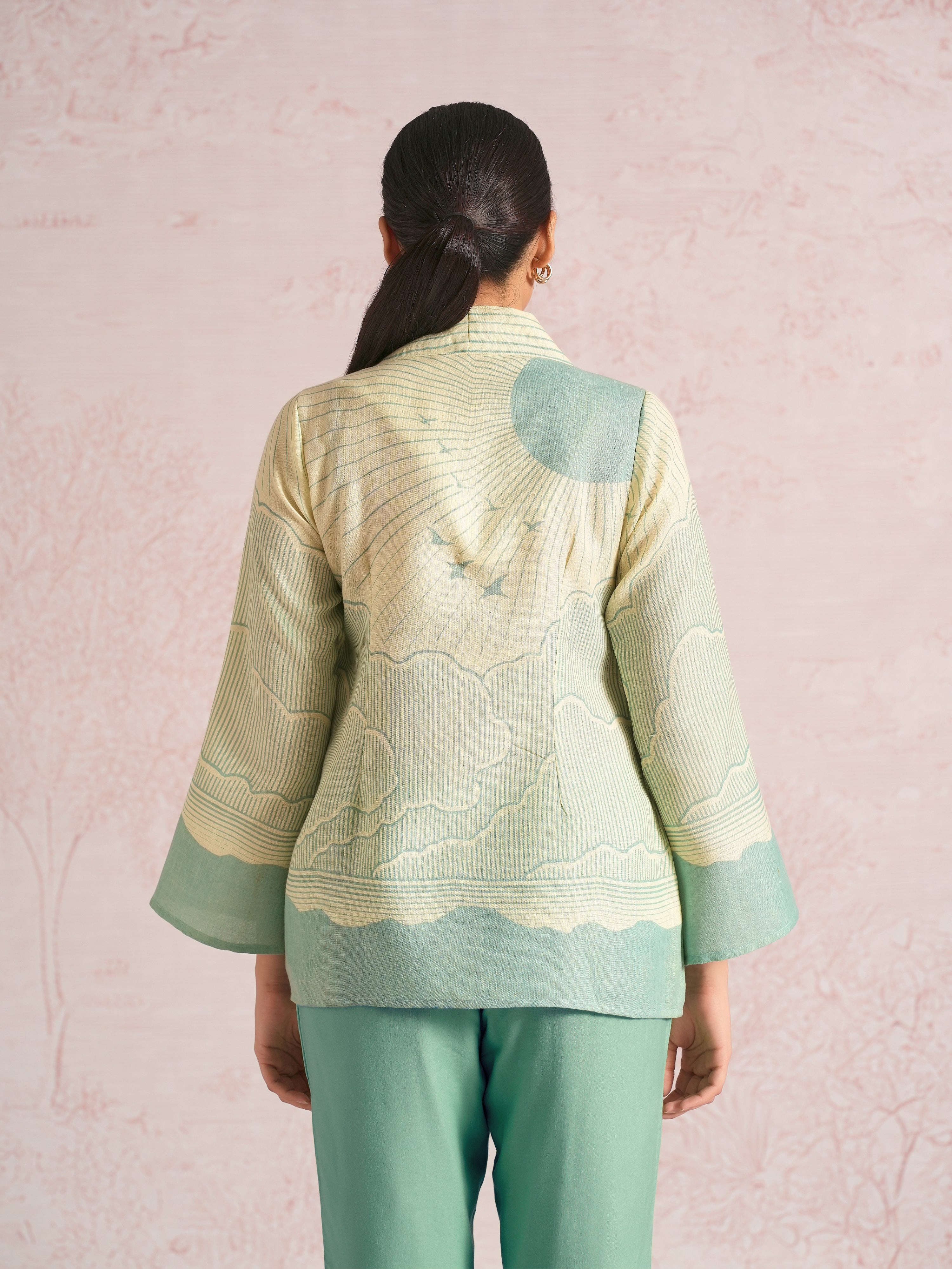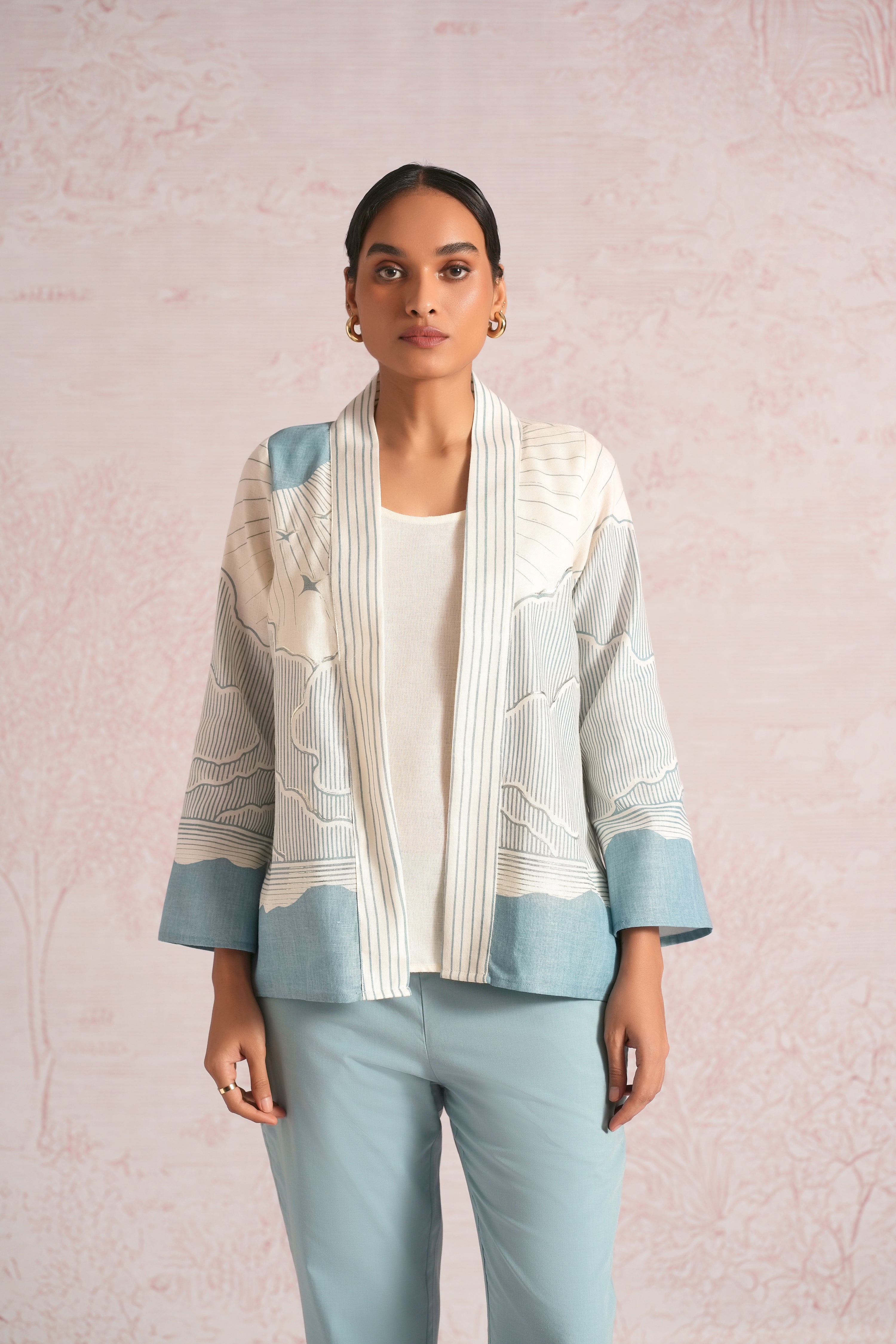 Silver Lining draws from open horizons and the gentle play of light across the landscape. Scenic prints unfold through fluid abstract lines, finished with a soft shimmer of gold foil that feels like sunlight resting on the earth. The colour stories—off-white with blueberry and lane green with sea green—feel fresh, soothing, and effortlessly elegant. Smart yet relaxed, the styles are designed for sunlit days, leisurely brunches, and open-air moments. Silver Lining brings an easy sense of polish to everyday dressing, where comfort meets quiet sophistication.