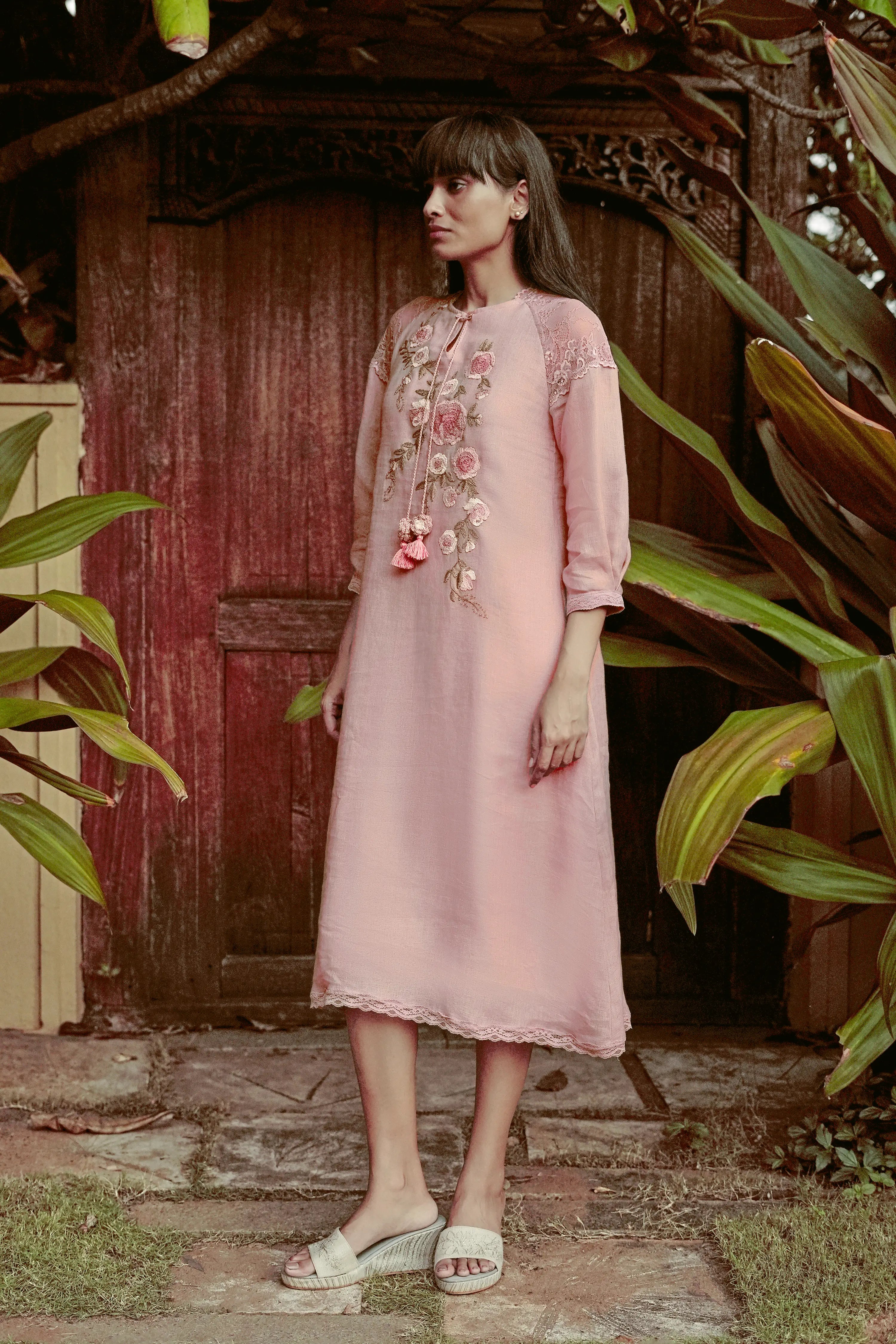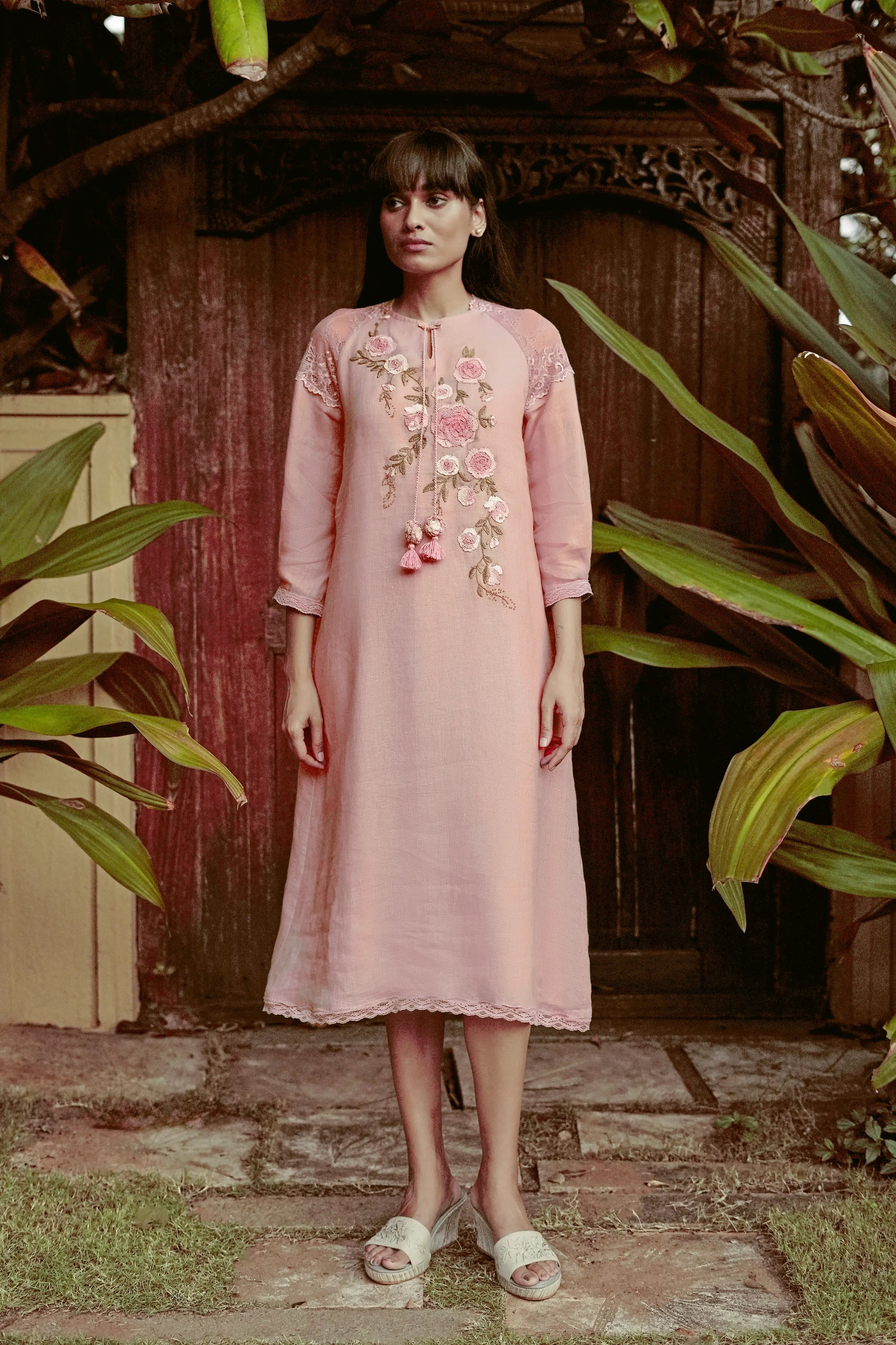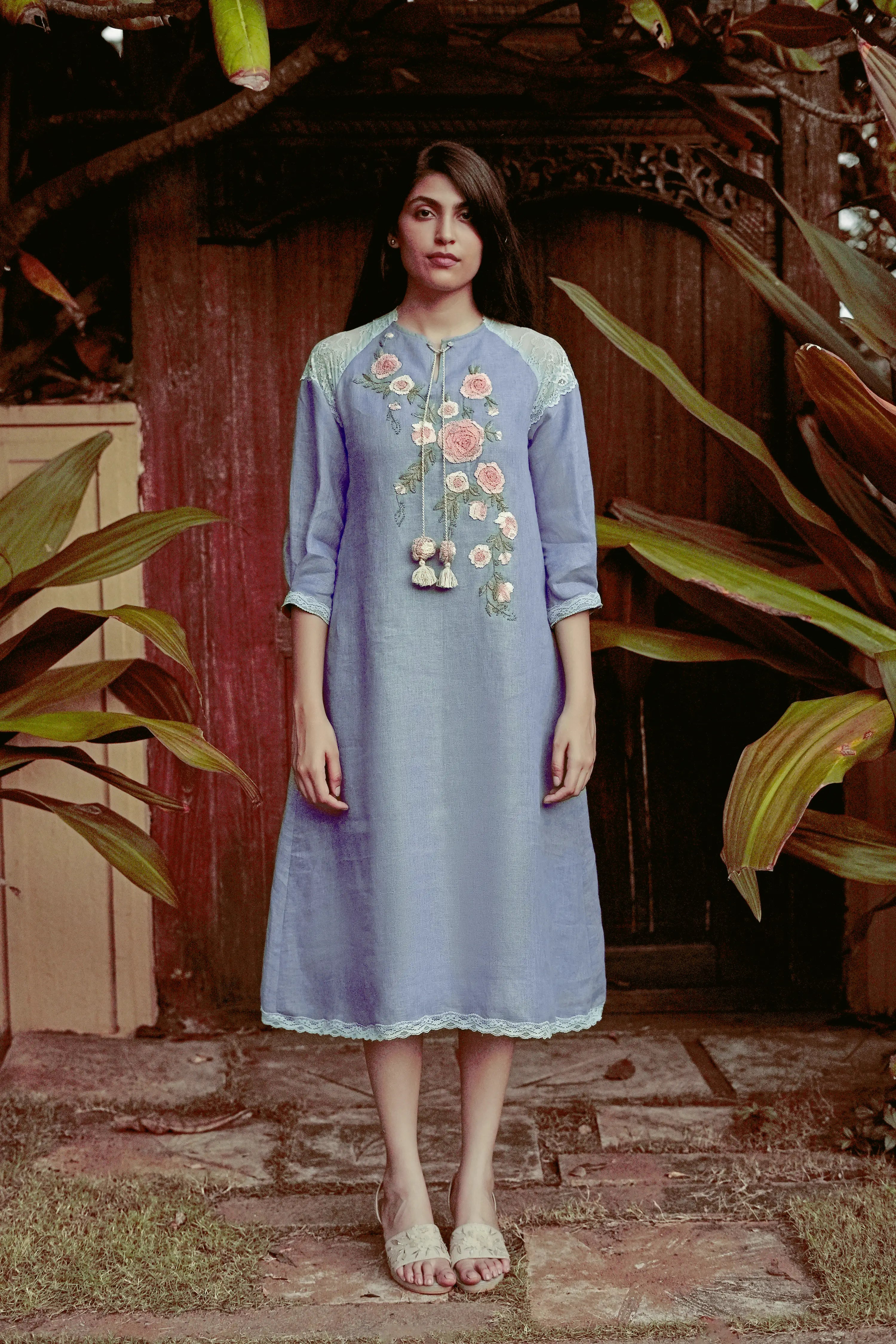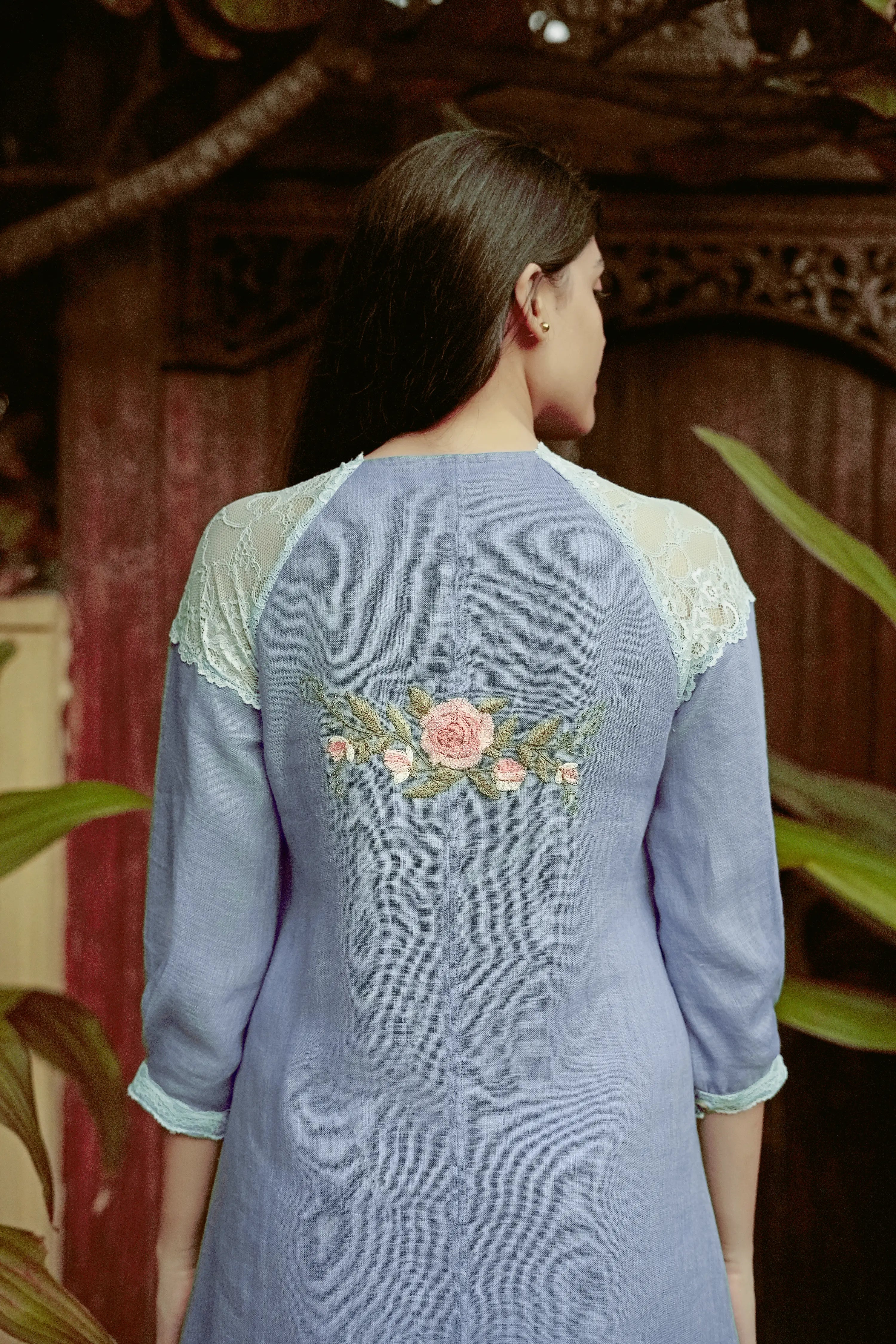 Whimsical Garden is a dreamy escape into a world where art and nature bloom together. Abstract tie-dyed fabrics create a soft, painterly canvas — like skies brushed with colour at golden hour — in two enchanting hues: the tender warmth of Rose Bud and the serene depth of Inkblot. Intricate laces trail across each silhouette like delicate vines, while florals bloom in exquisite embroidery, evoking the romance of a secret garden in full flourish. Sugar beads shimmer like drops of morning dew, lending a luminous texture that dances with light and movement. The neckline is beautifully enhanced with ornate embroidery and finished with charming floral tassels that sway gracefully at the neck and sleeves. Romantic, ethereal, and irresistibly elegant, Whimsical Garden invites you to step into a story where every detail blossoms with beauty.
