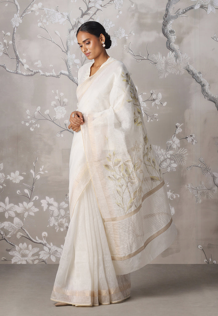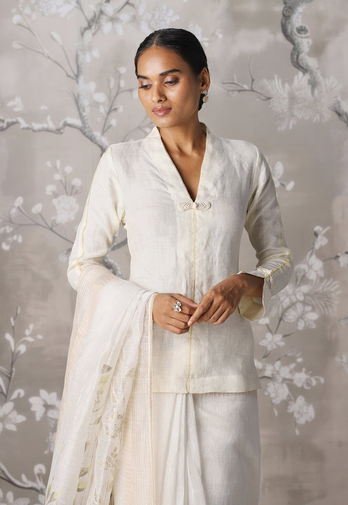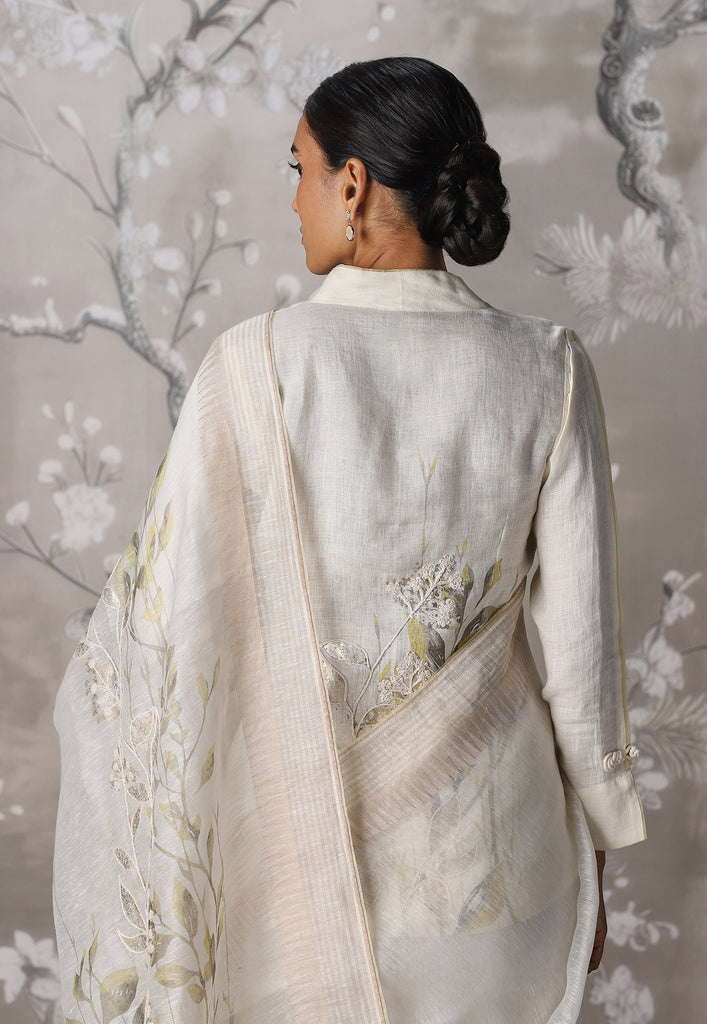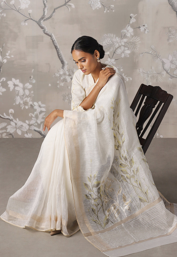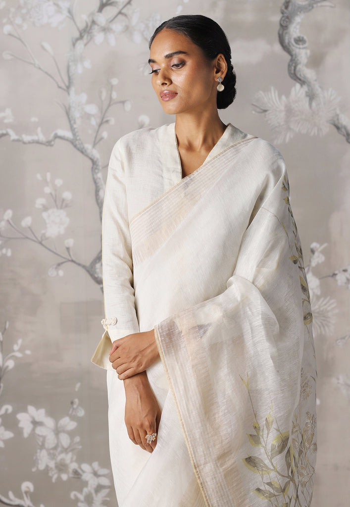Inspired by the woody, ringed culms of the perennial bamboo, this magnificent range that intriguing shadows of these stems overlapping one another by layers of screen - print that is akin to beautiful water colours on fabric. Further elevating the design are intricately hand-embroidered leaves using anchor thread embroidery; stroked with light and dull shades of gold- adding a touch of shimmer with depth while embossing the beauty of the bamboo to the surface on fine linen. This sparkling range also makes for the perfect attire to work on special occasions