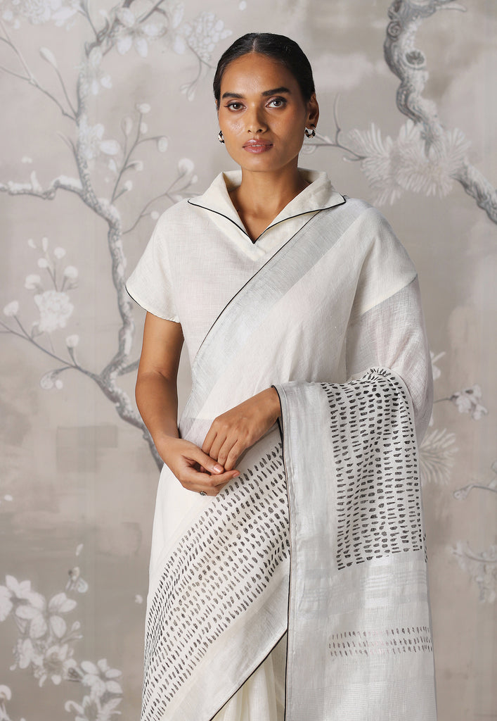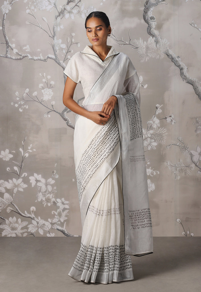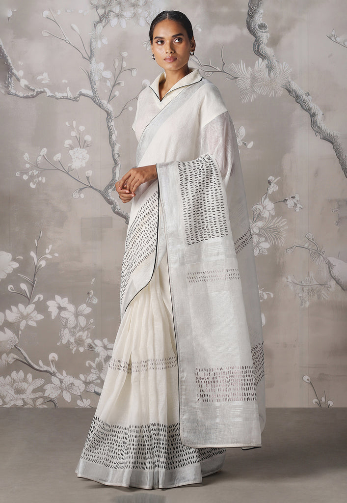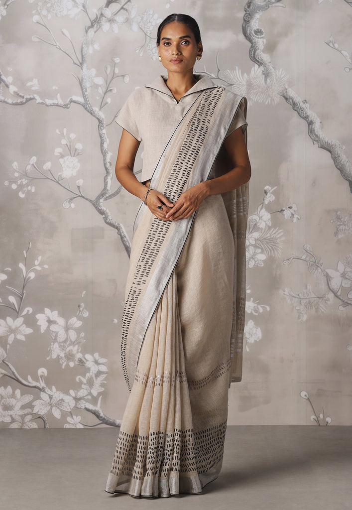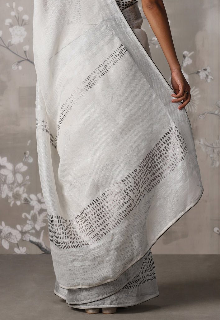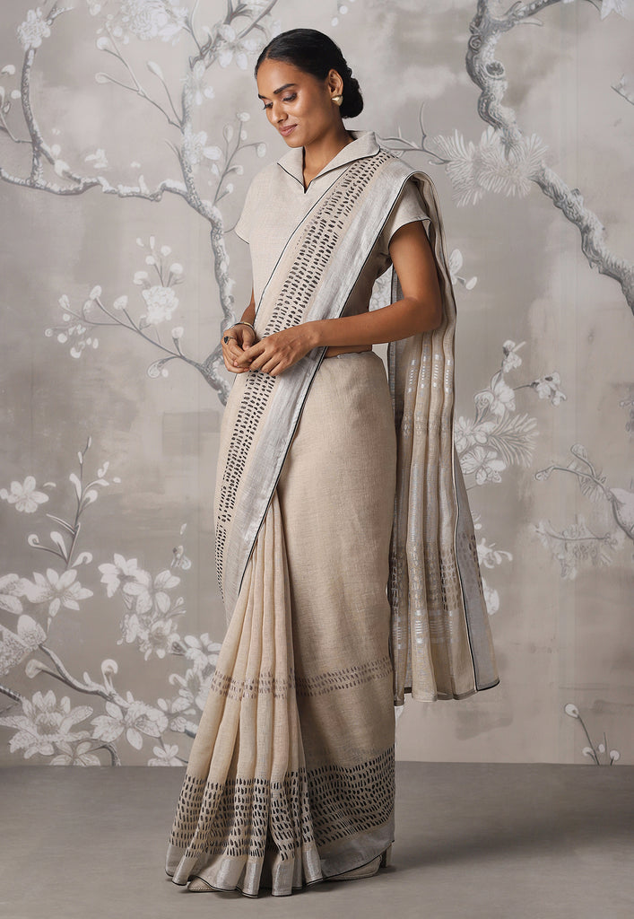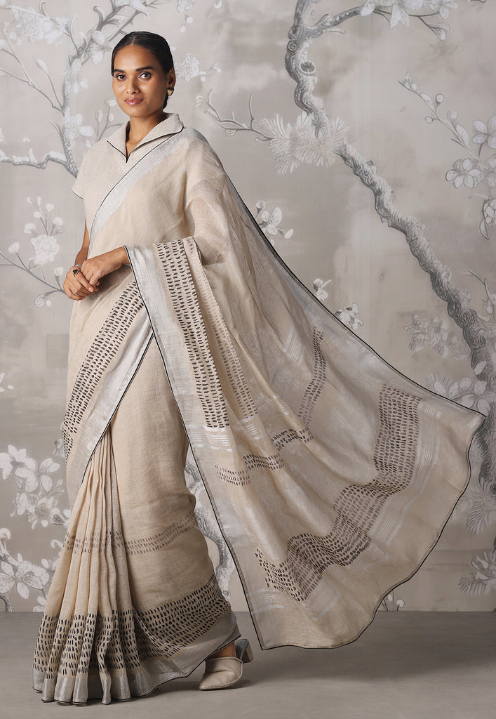 • Classic linen saree, with Hand screen printing and foiling. finished with elegant 1/8th edging.