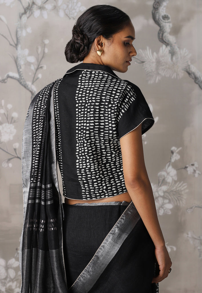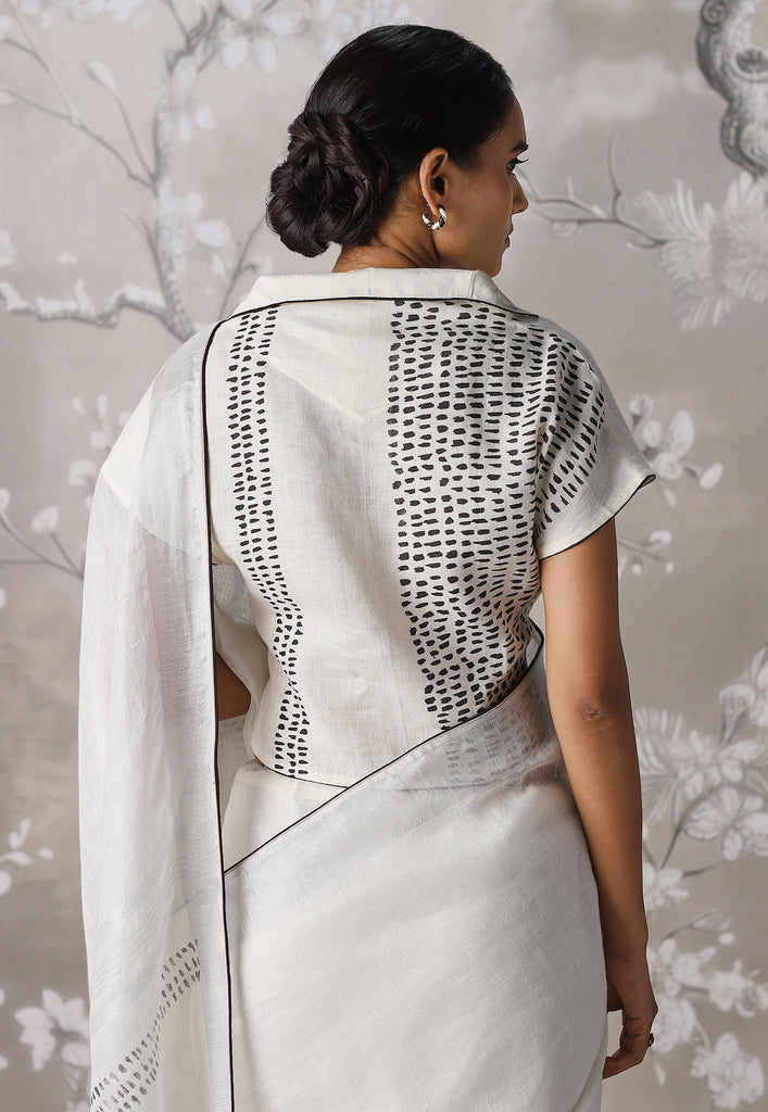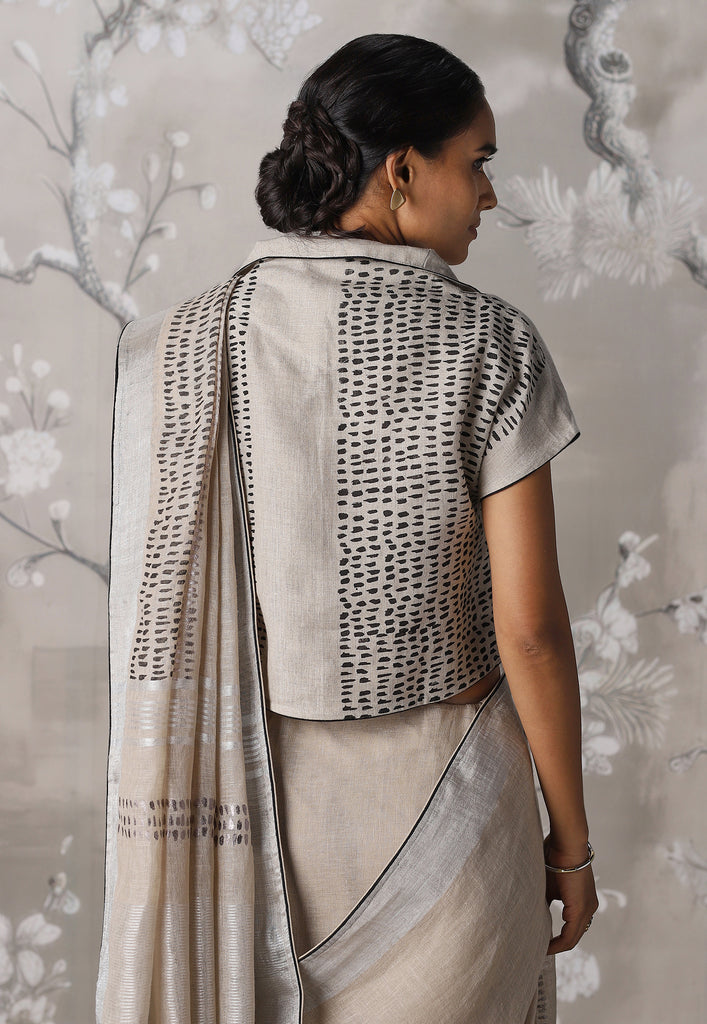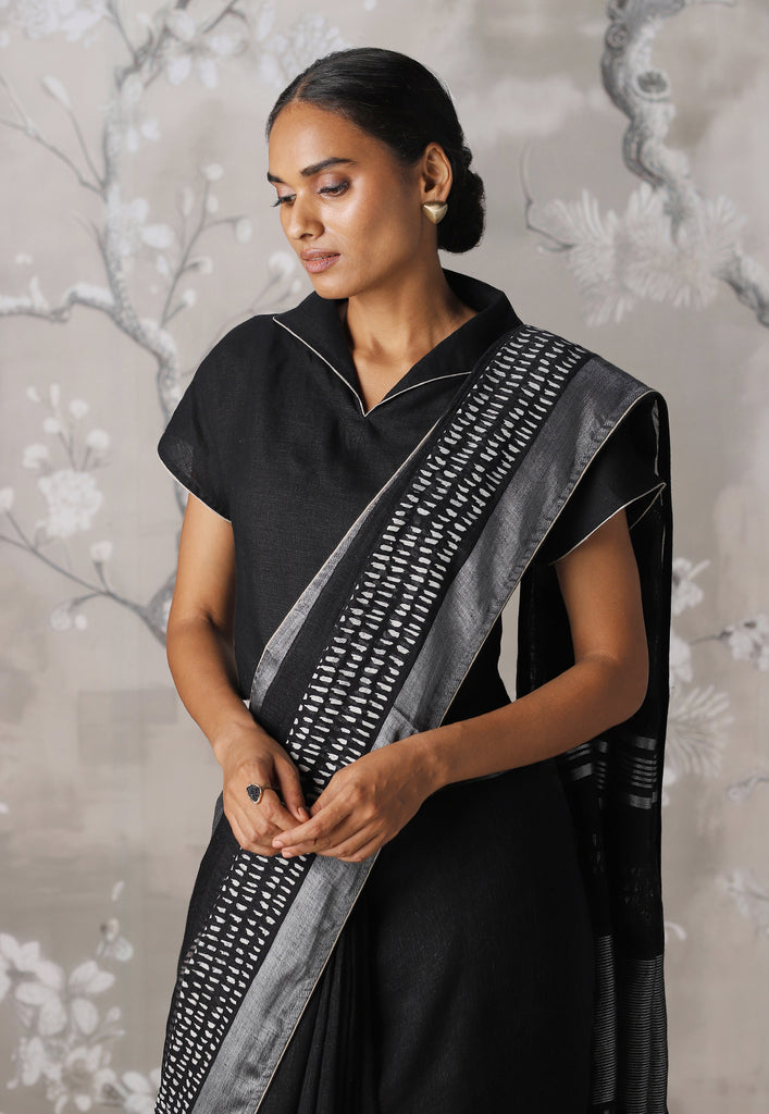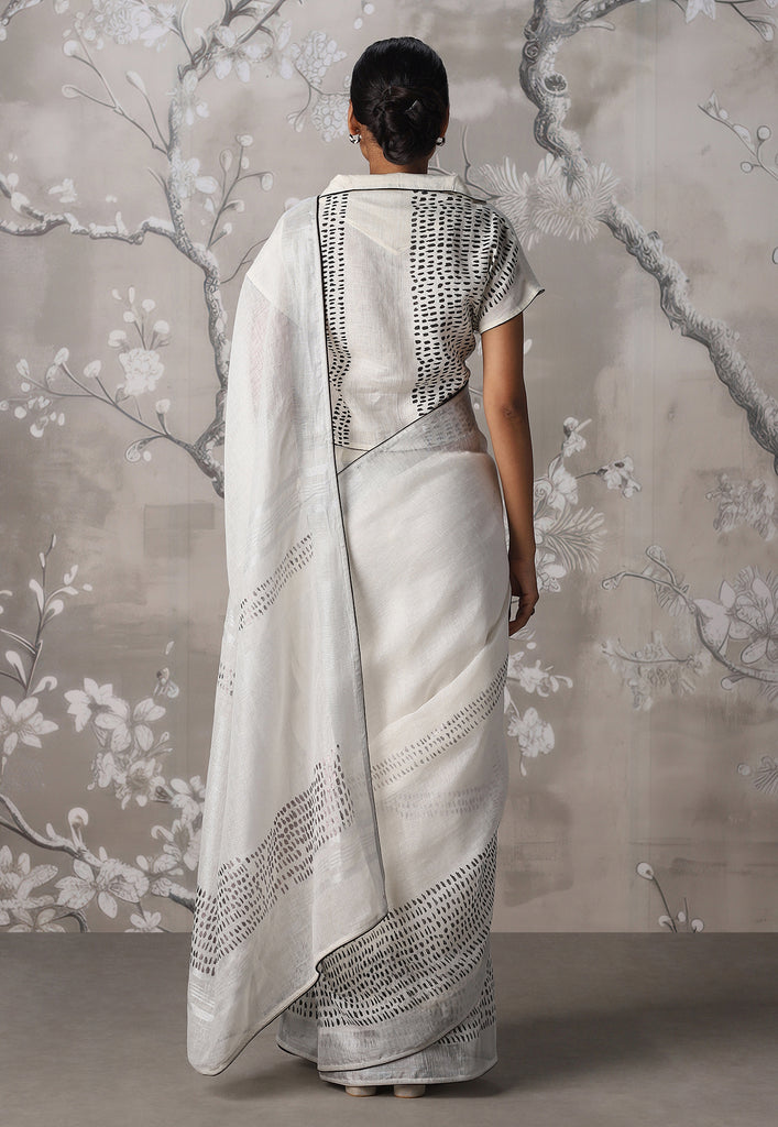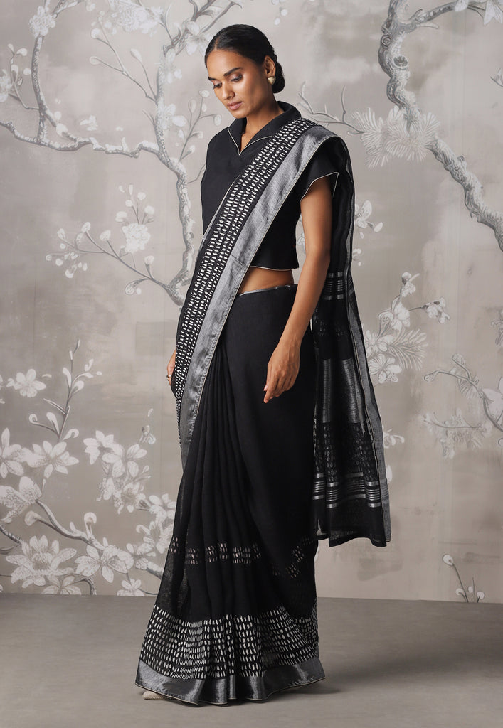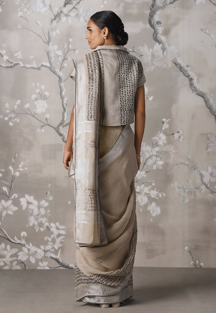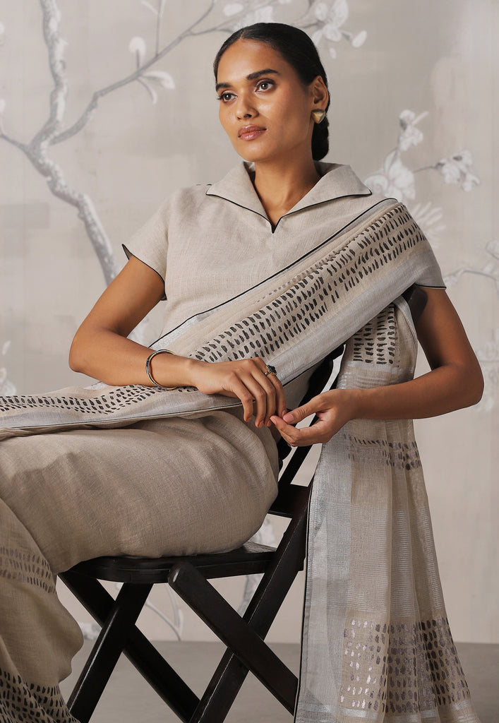 • Classic linen saree, with Hand screen printing and foiling. finished with elegant 1/8th edging.