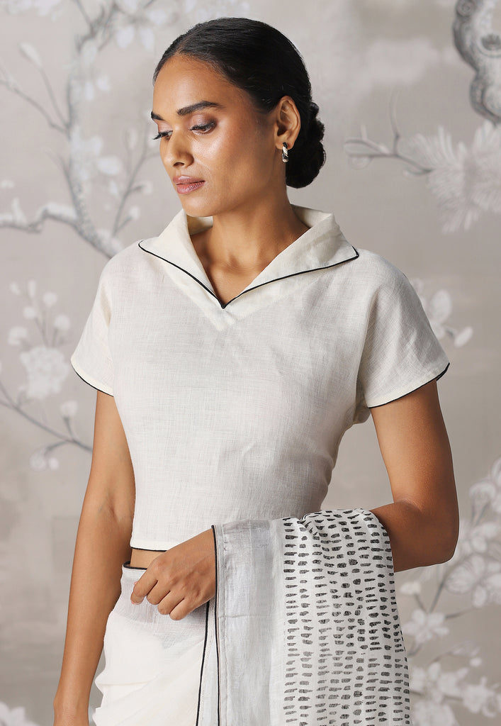 • Collared neck and extended short sleeves blouse with hand screen printing and contrast cord piping