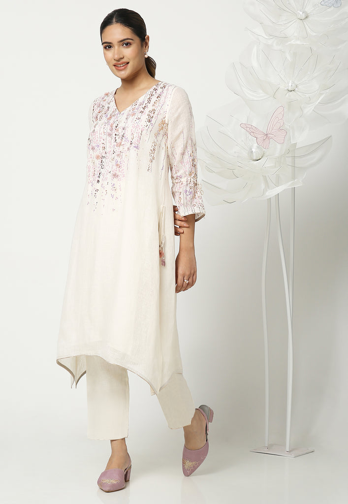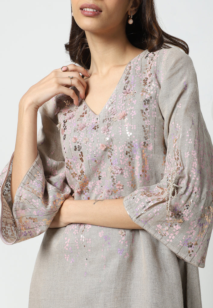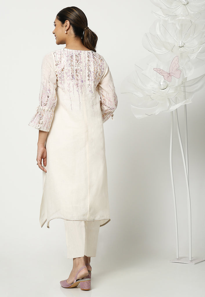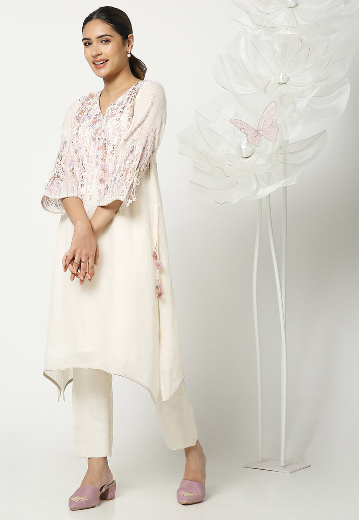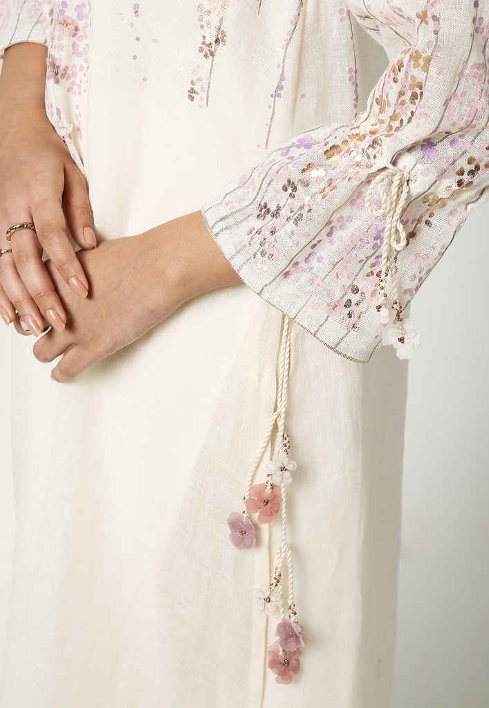 On the crip yet soft linen dyed in the tranquil colors of the season; Off-white, Natural, Star, Macroon, blooms our marigold flowers. The tender stems and garden-fresh marigolds are screen printed with a blend of double-tone serene hues. The gleaming petals of the marigolds were made to bloom using our heat press technique. Then comes our enchanting laser-cut organza flowers blooming in an aesthetically pleasing way appliqued with rosegold zari thread on the garments. Our handcrafted tassels made with hand twisted cords, and delicate laser-cut flowers ameliorate the look.