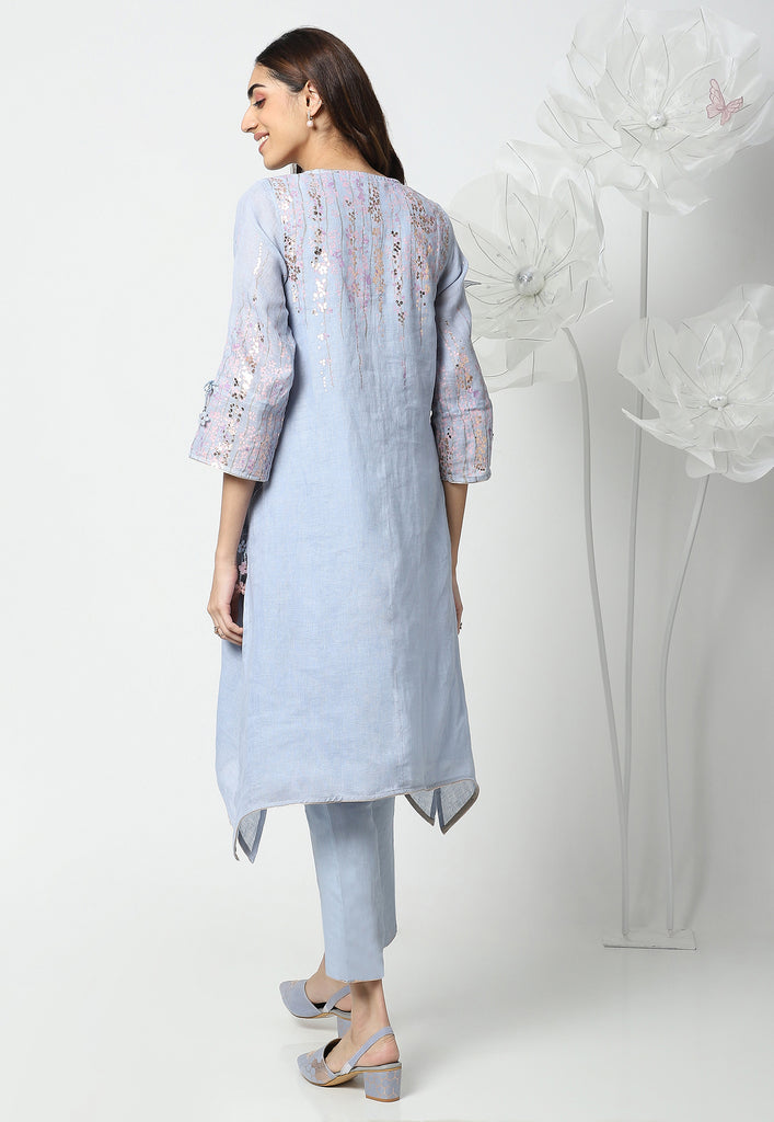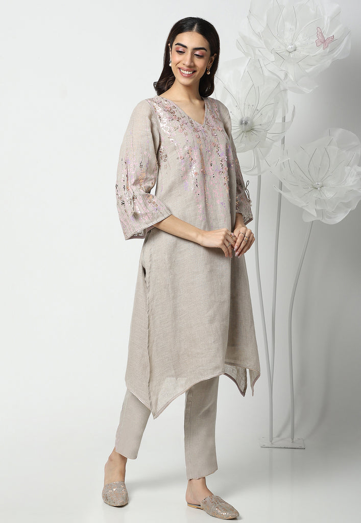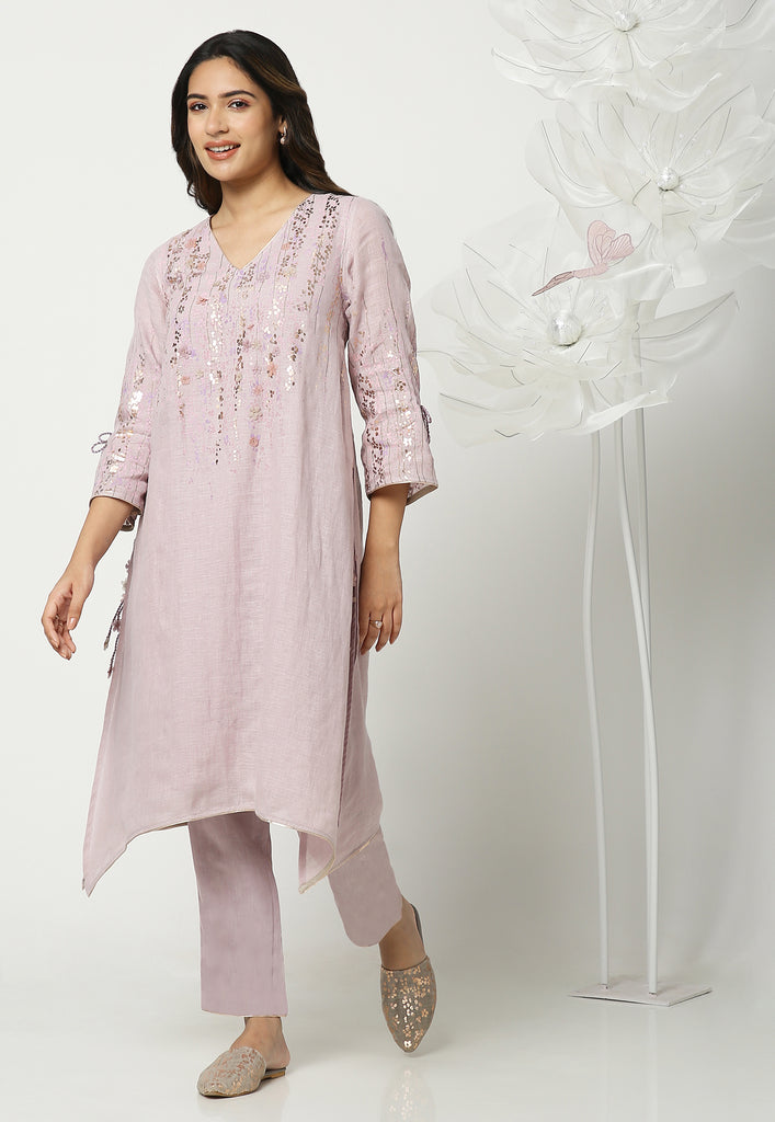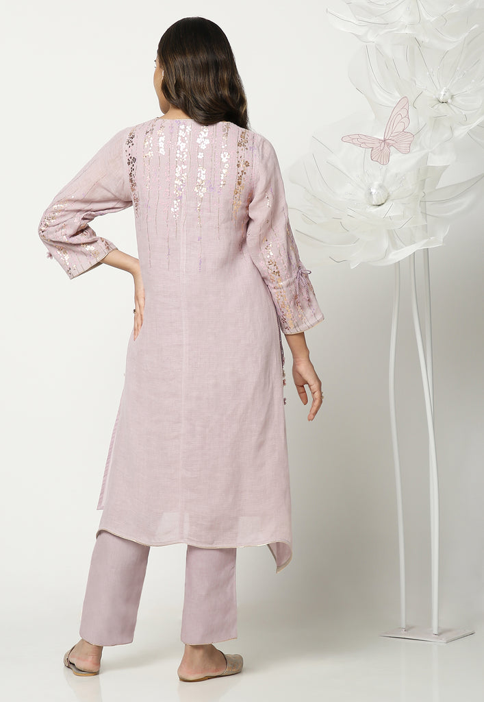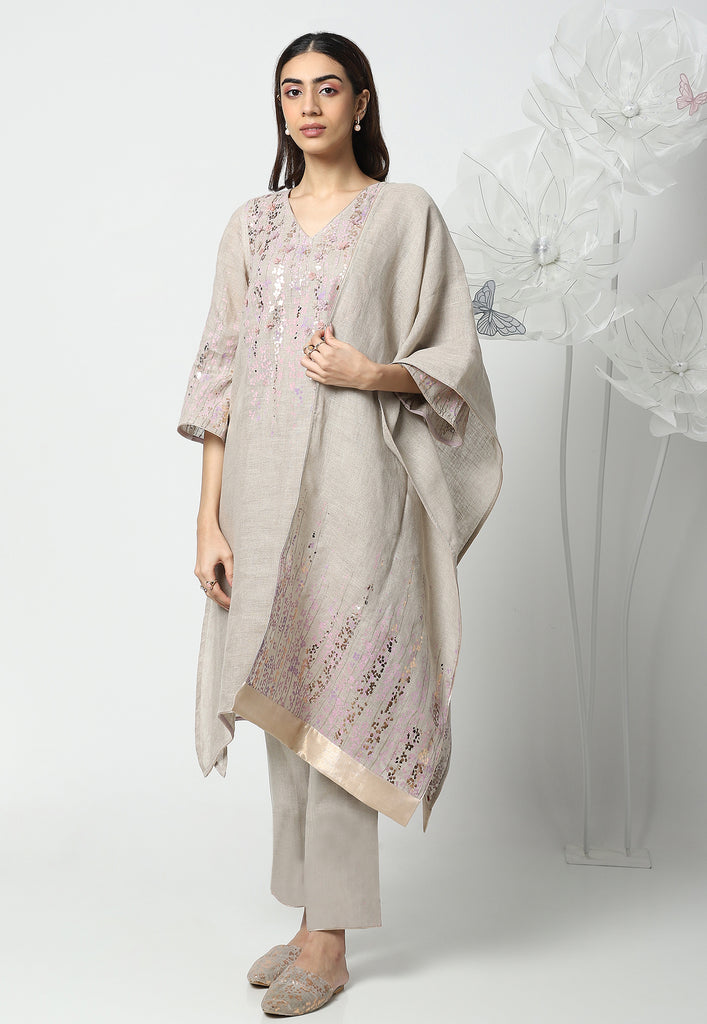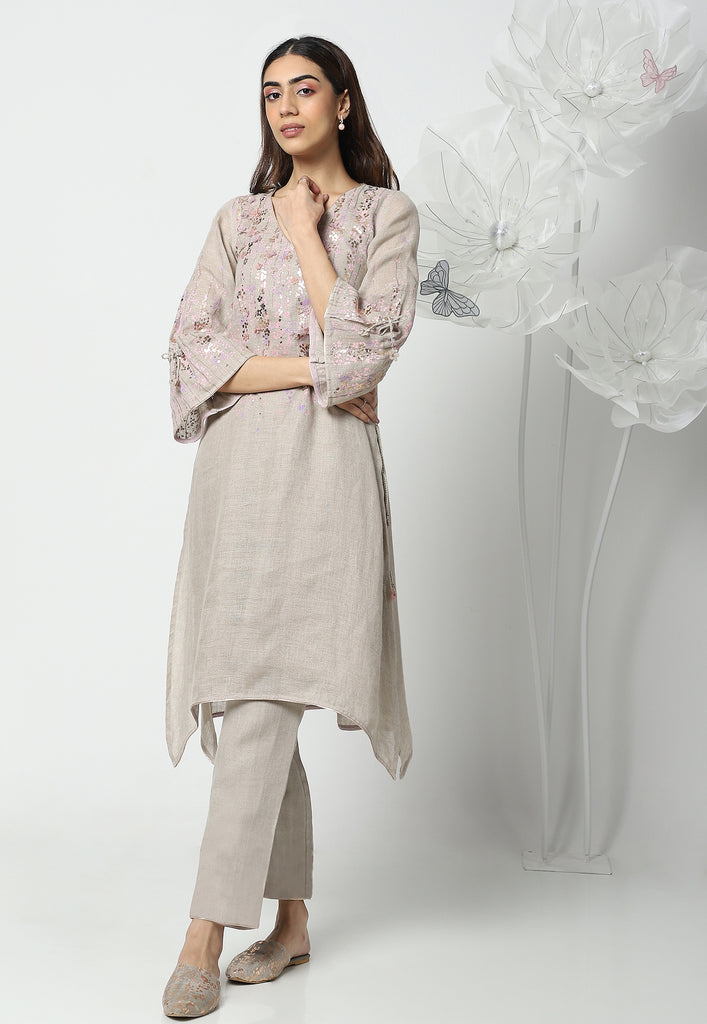 On the crip yet soft linen dyed in the tranquil colors of the season; Off-white, Natural, Star, Macroon, blooms our marigold flowers. The tender stems and garden-fresh marigolds are screen printed with a blend of double-tone serene hues. The gleaming petals of the marigolds were made to bloom using our heat press technique. Then comes our enchanting laser-cut organza flowers blooming in an aesthetically pleasing way appliqued with rosegold zari thread on the garments. Our handcrafted tassels made with hand twisted cords, and delicate laser-cut flowers ameliorate the look.