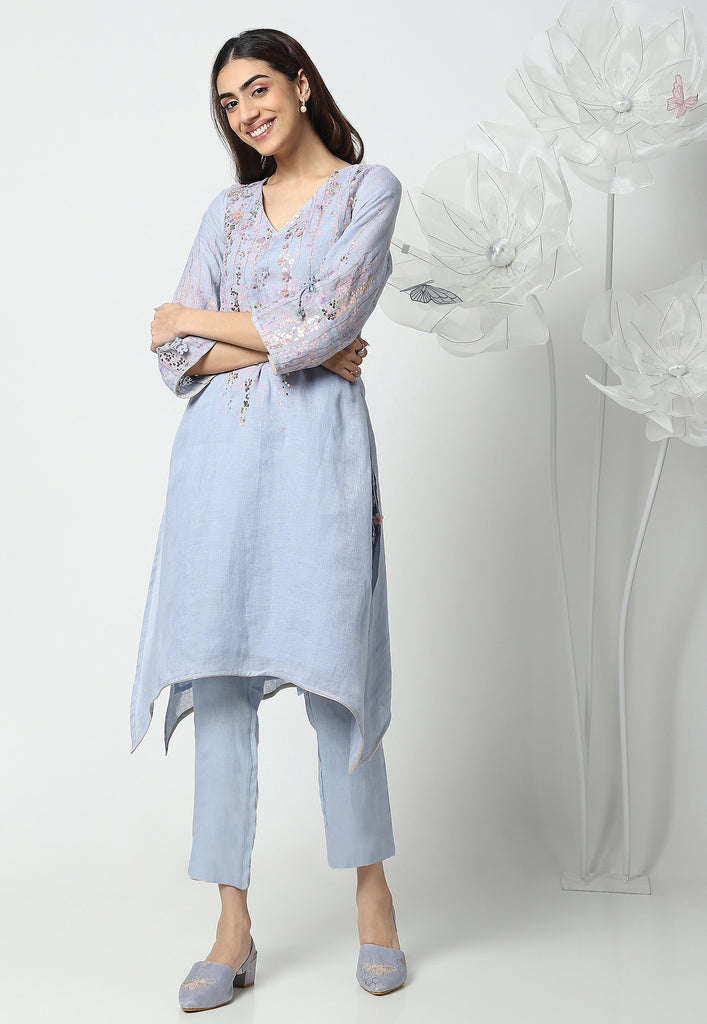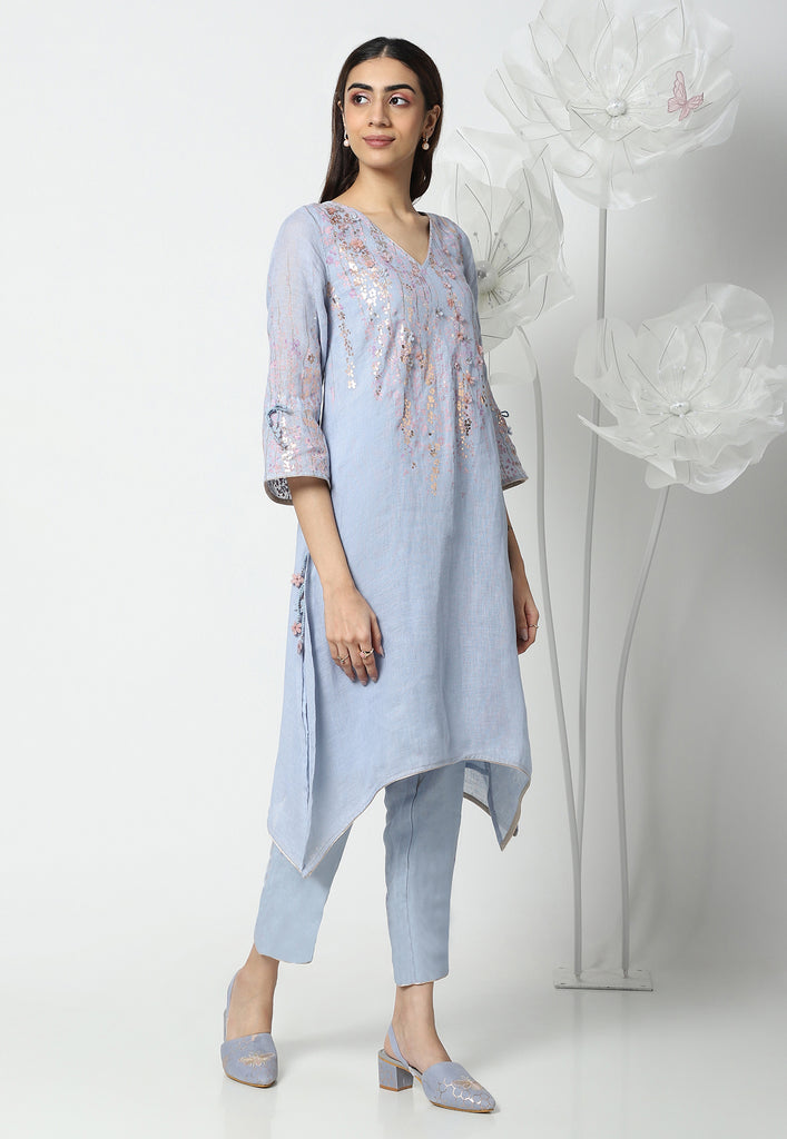 • Our signature style fly-free tunic with marigolds falling down trawling from the shoulder and laser-cut organza flowers popping up in an aesthetic way.
