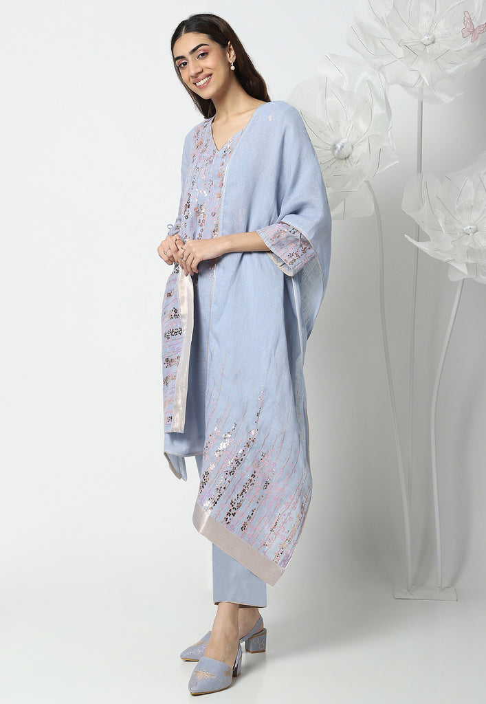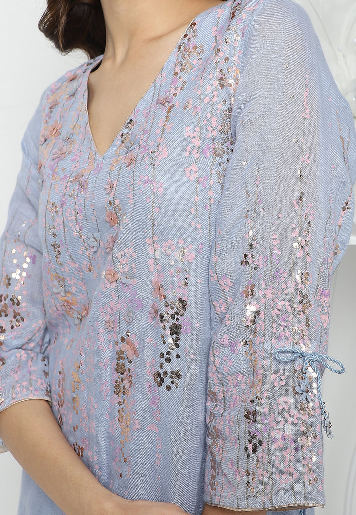 • The look is completed with a dupatta with screen printing and foil on both sides.