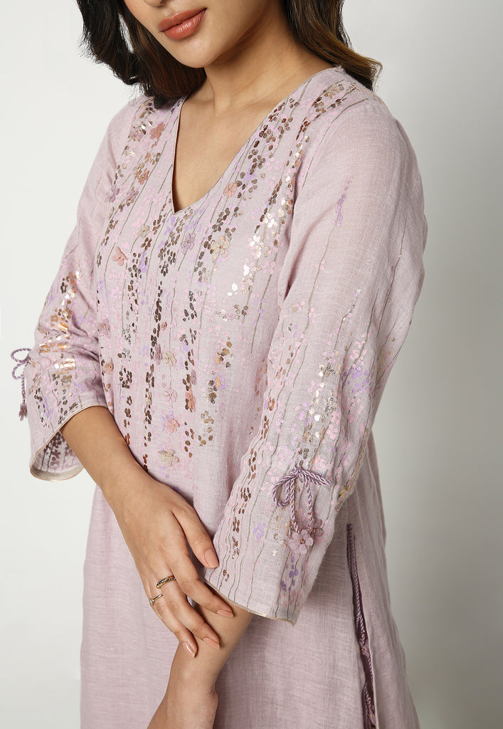 • Linen pants with marigold print and heat-pressed rose gold florets on the hem.