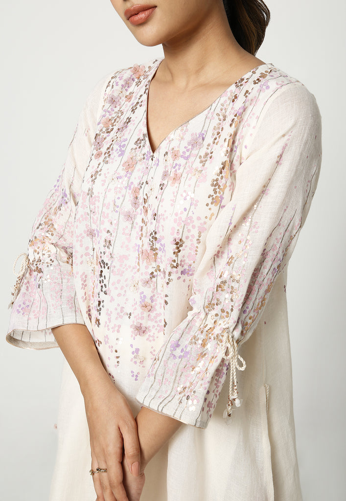 • Handcrafted tassels tie-ups with laser-cut delicate florets at the sleeves and sides of the top