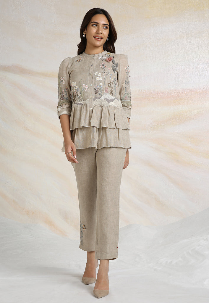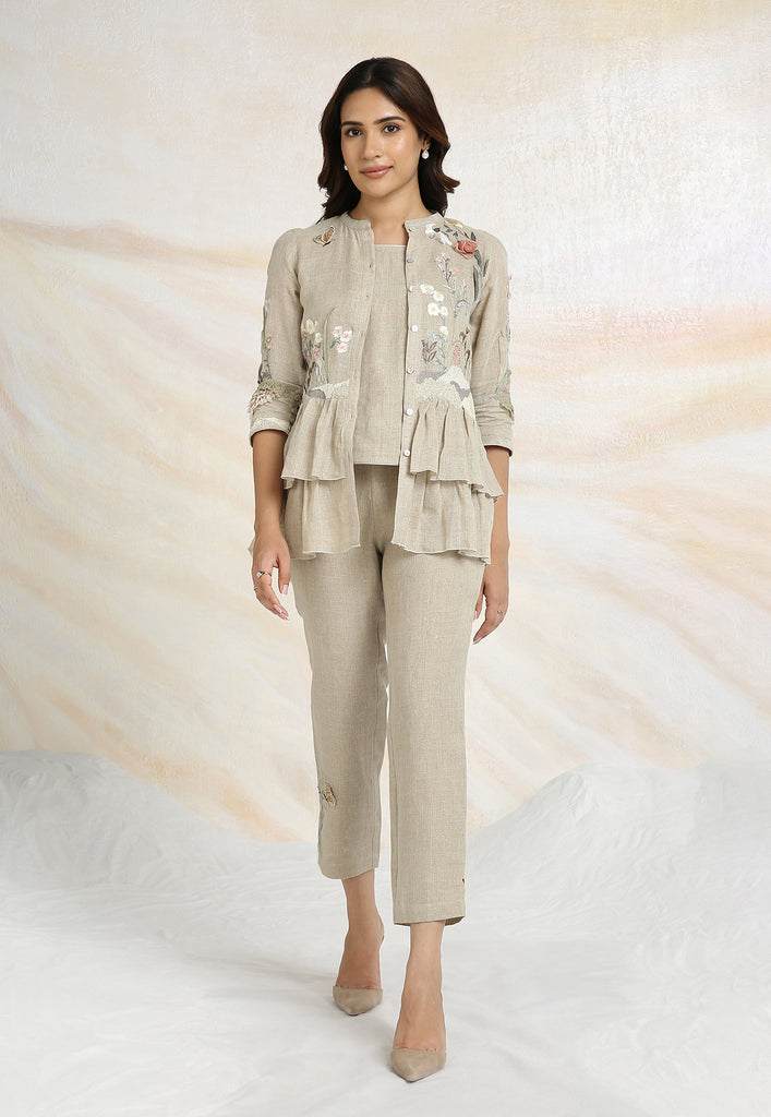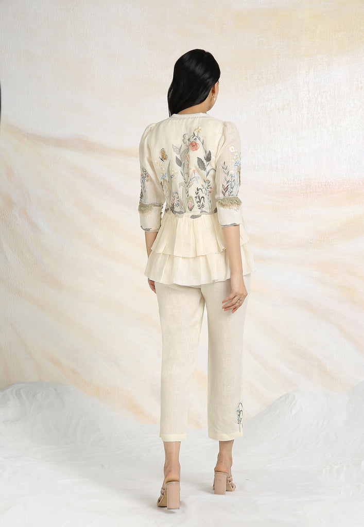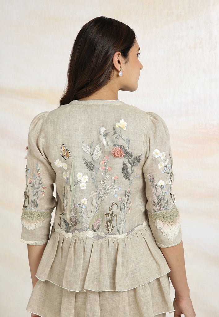 Embrace the charming wonder of the wilderness and stroll into our Prairie. A stunning work of art bringing the likeness of a captivating garden to garment. Each piece is immaculately hand-embroidered and handcrafted utilizing intricate layers of anchor thread and silk thread embroidery; adding depth with dimension to the piece while dainty elements of birds, butterflies and blooms unfurl in the forefront- individually sculpted and delicately appliquéd to the fabric. A final touch of ornate lace edging and handmade tassels finish the piece with panache bringing the outdoors in, just in time for a fresh new season.