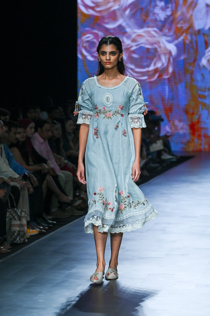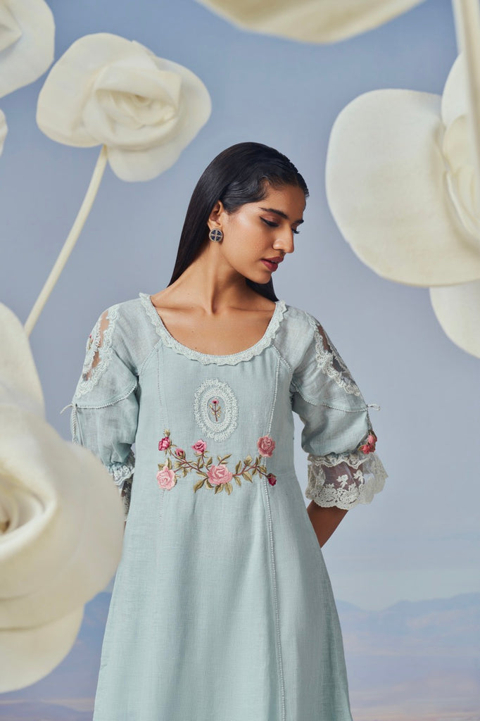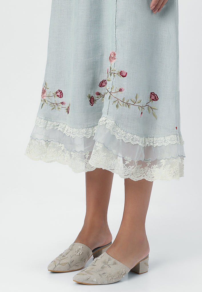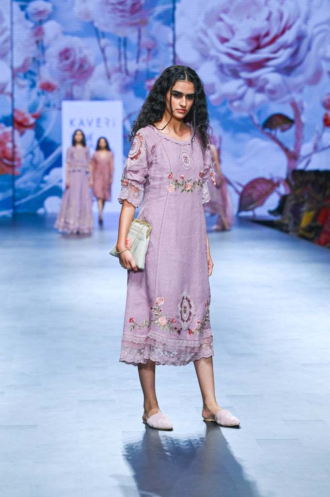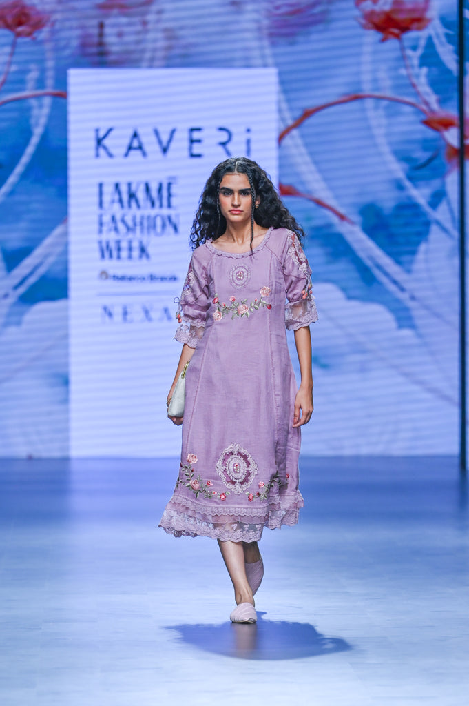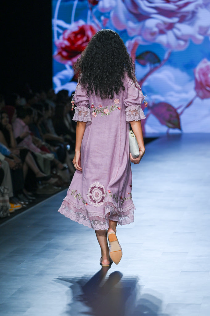 From a Victorian melodrama and into your hearts, gracing your wardrobe this season is one of our most elaborate collections yet with Rosette. Elevating the majesty of glorious linen with intricate needlepoint lace, hand-appliqué and cut work transform the layer from within with a subtle touch of transparency. A bouquet of hand-embroidered roses garland gracefully around the lace frame for a pop of colour; scalloped, hand-cut layers of lace and organza gather around the edges for a dramatic flair; elegantly embellished with pearl lace lining and delicate rosebud tassels- all culminating into a timeless piece reimagined for you in true Kaveri style. Available in captivating shades of ice, orchid and cement.