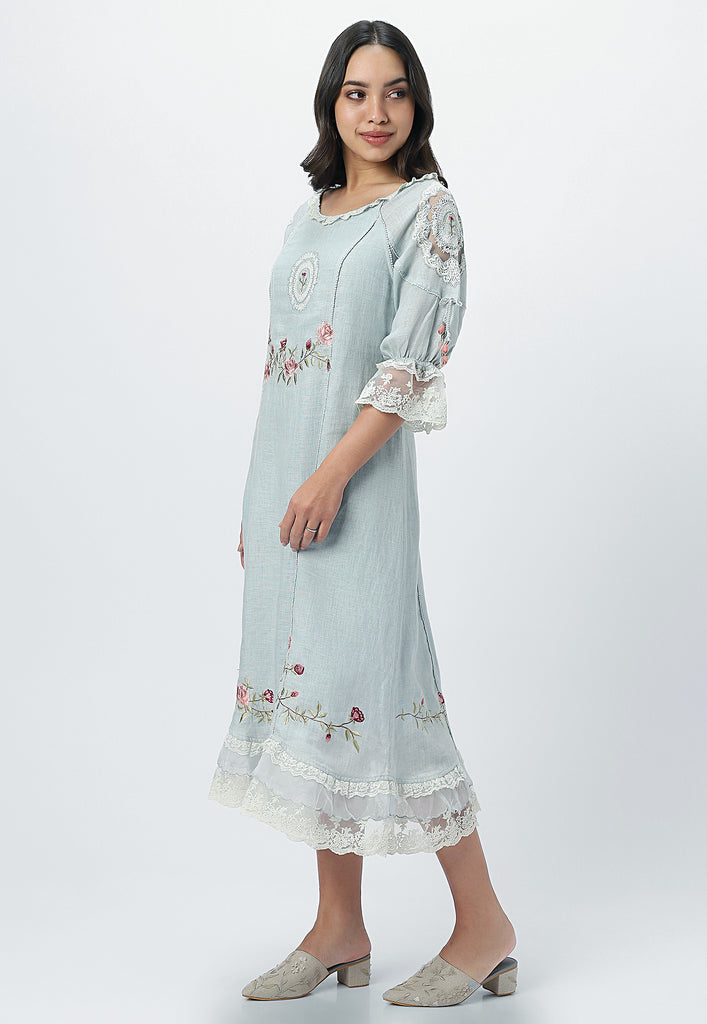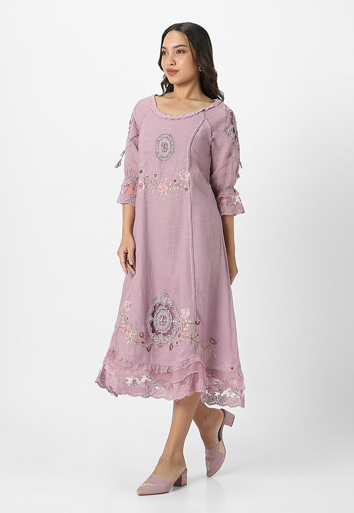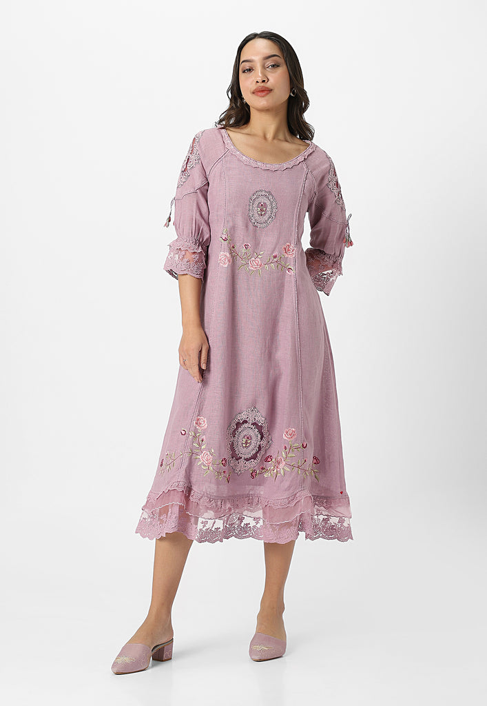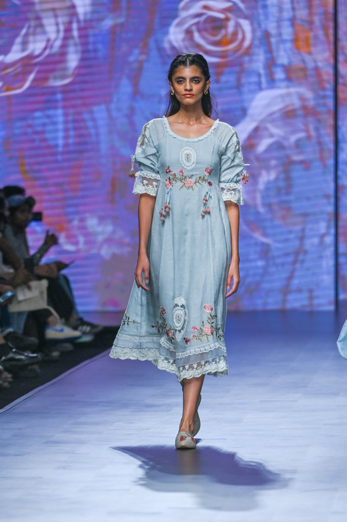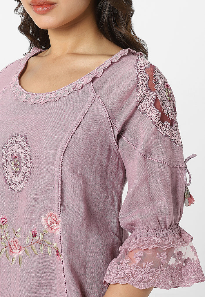 From a Victorian melodrama and into your hearts, gracing your wardrobe this season is one of our most elaborate collections yet with Rosette. Elevating the majesty of glorious linen with intricate needlepoint lace, hand-appliqué and cut work transform the layer from within with a subtle touch of transparency. A bouquet of hand-embroidered roses garland gracefully around the lace frame for a pop of colour; scalloped, hand-cut layers of lace and organza gather around the edges for a dramatic flair; elegantly embellished with pearl lace lining and delicate rosebud tassels- all culminating into a timeless piece reimagined for you in true Kaveri style. Available in captivating shades of ice, orchid and cement.
