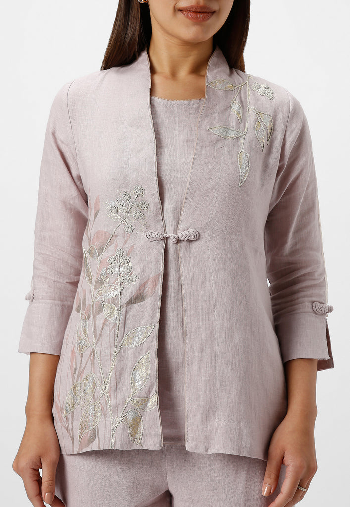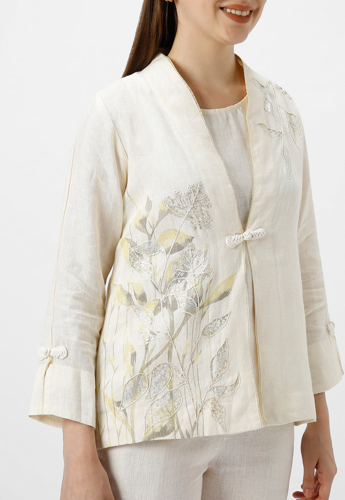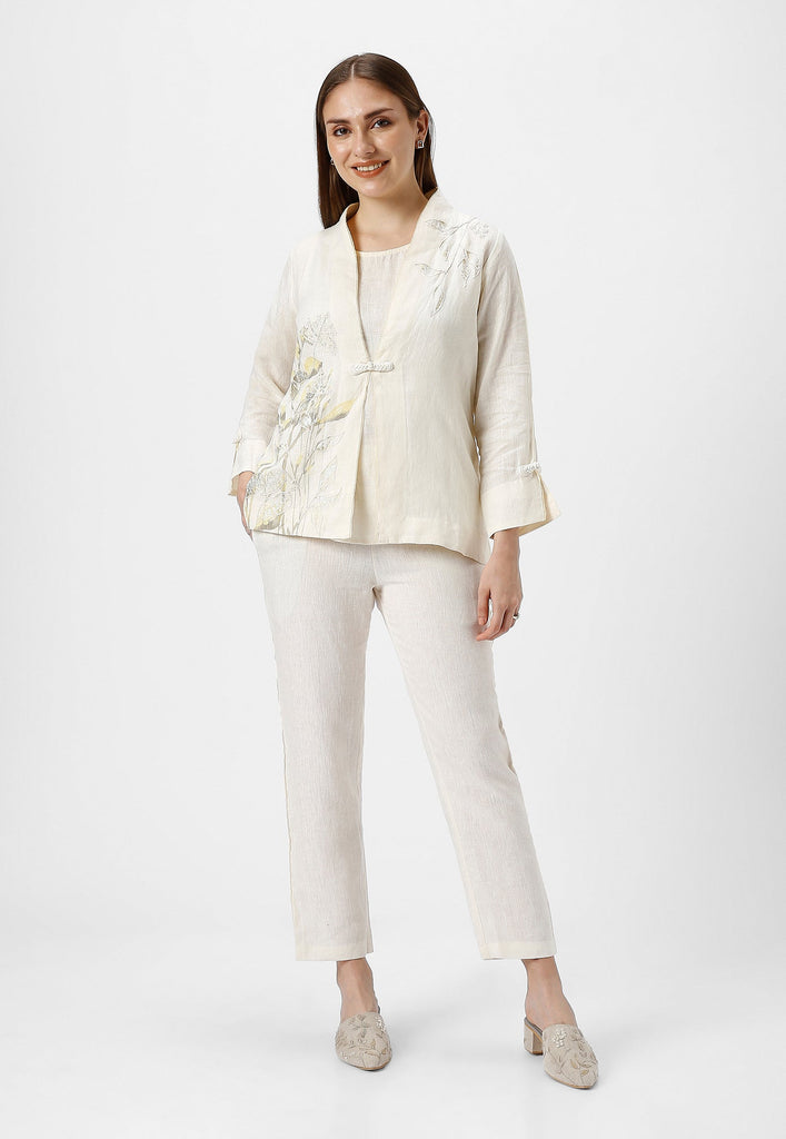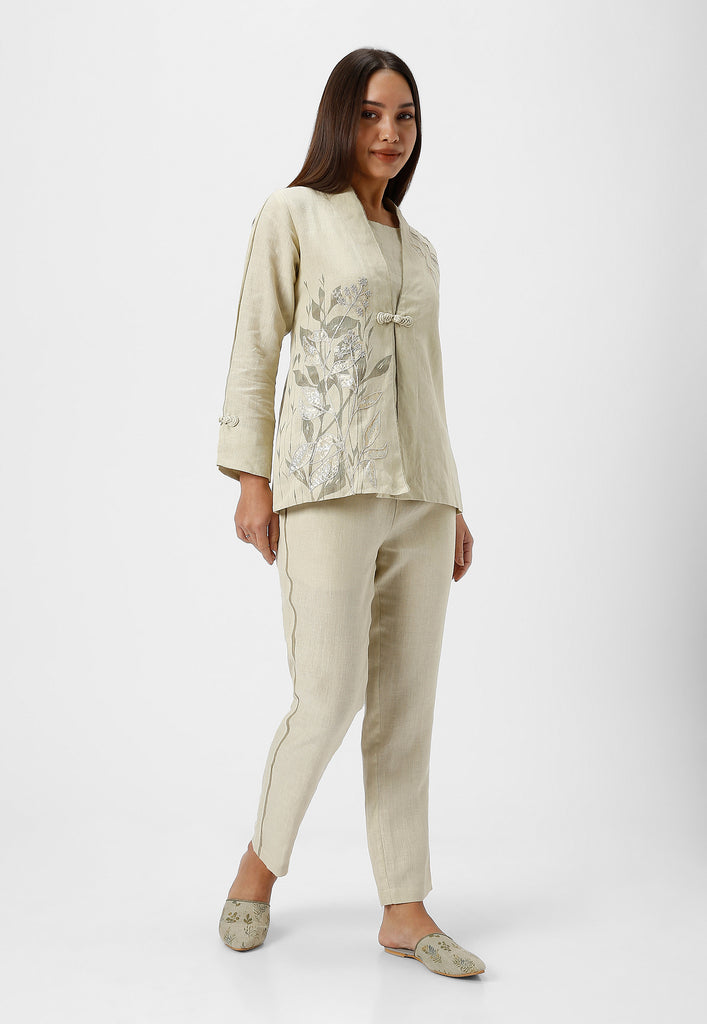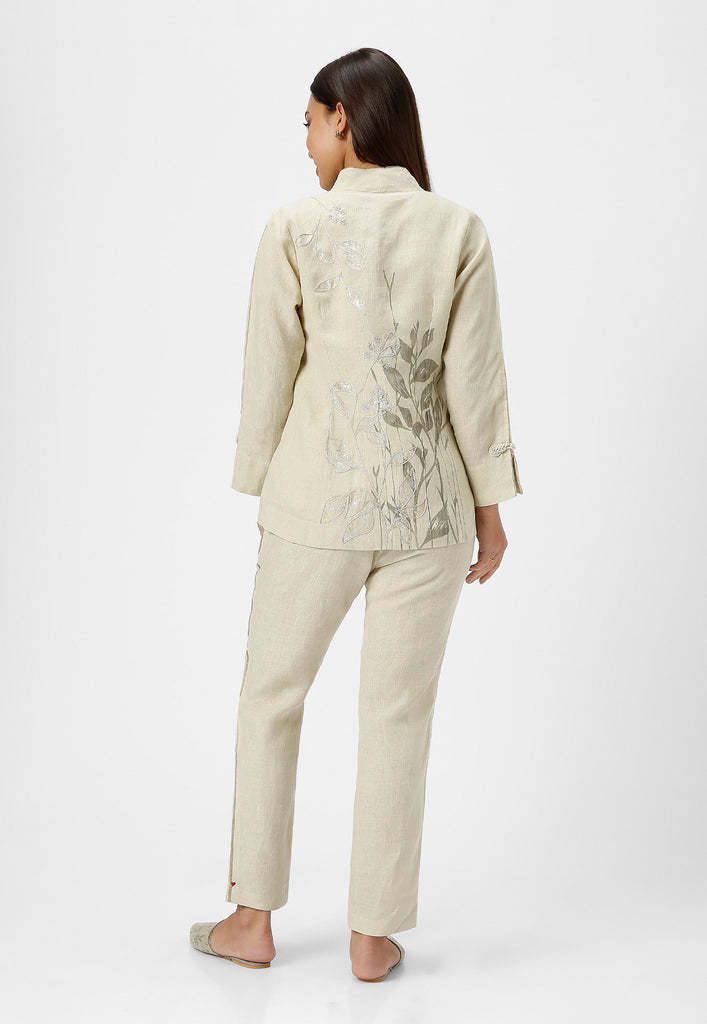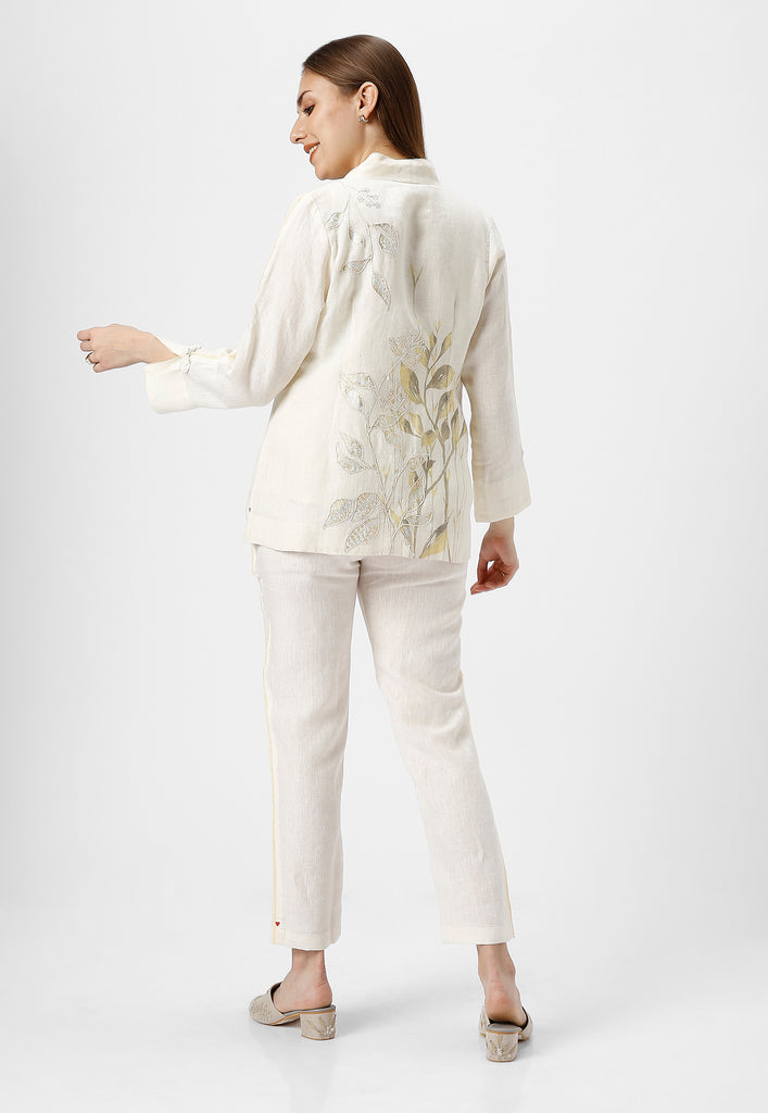 • A collar neck Jacket combines heat press foil craft and hand drawn abstract design along a line-art in cotton thread embroidery.