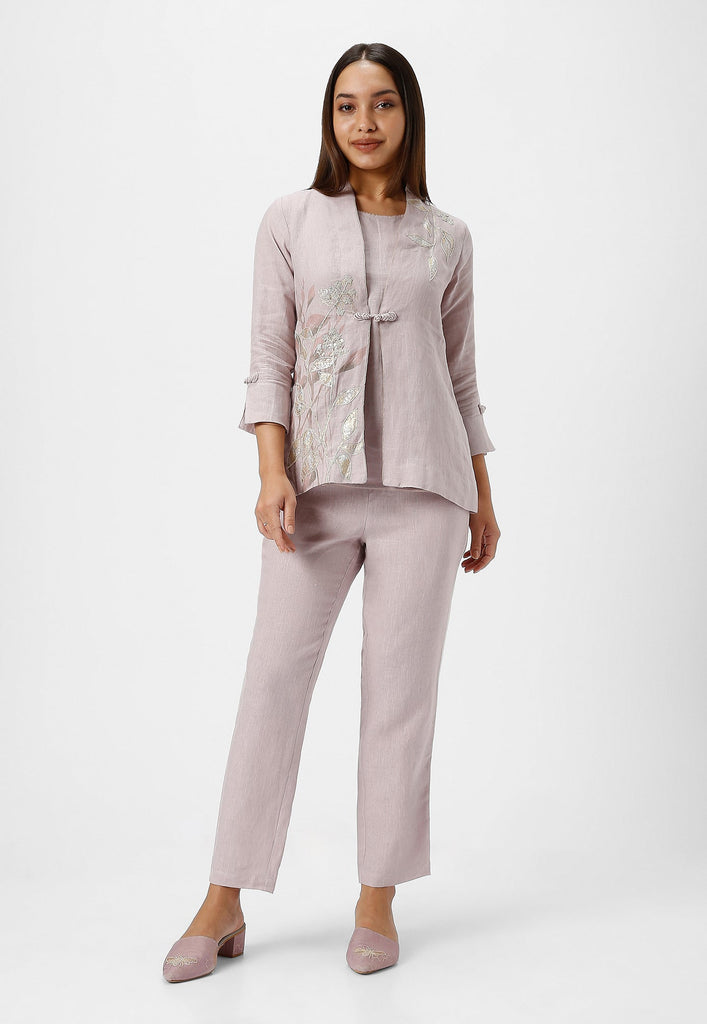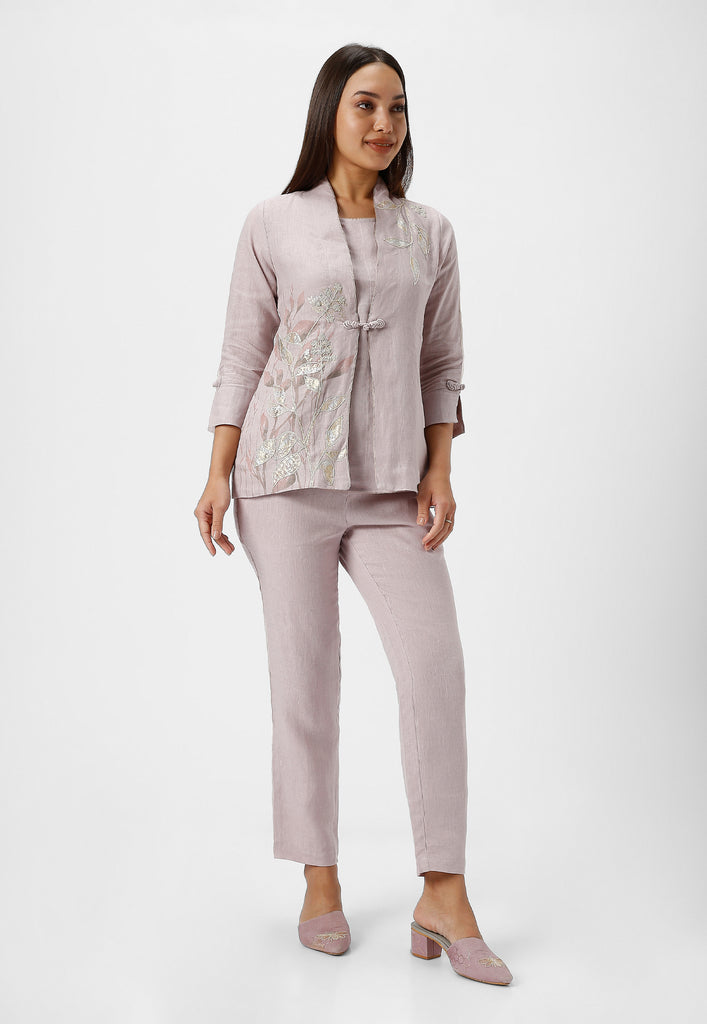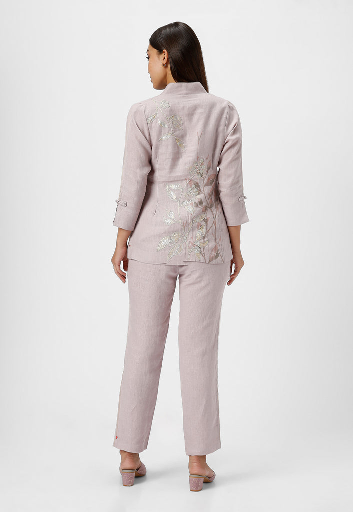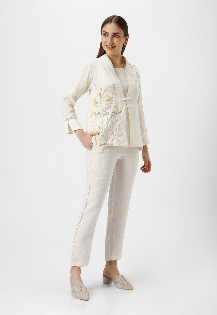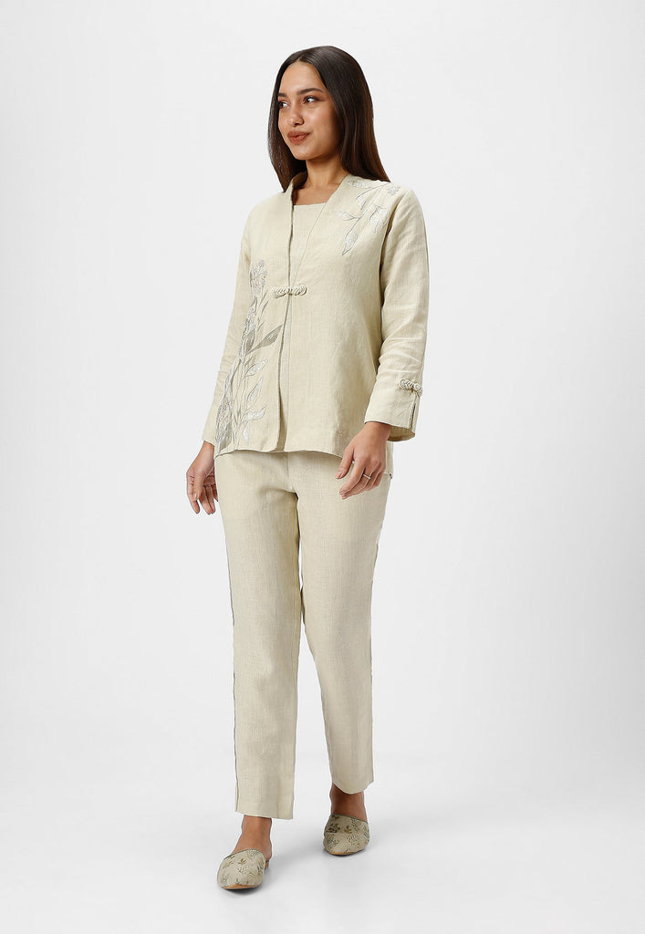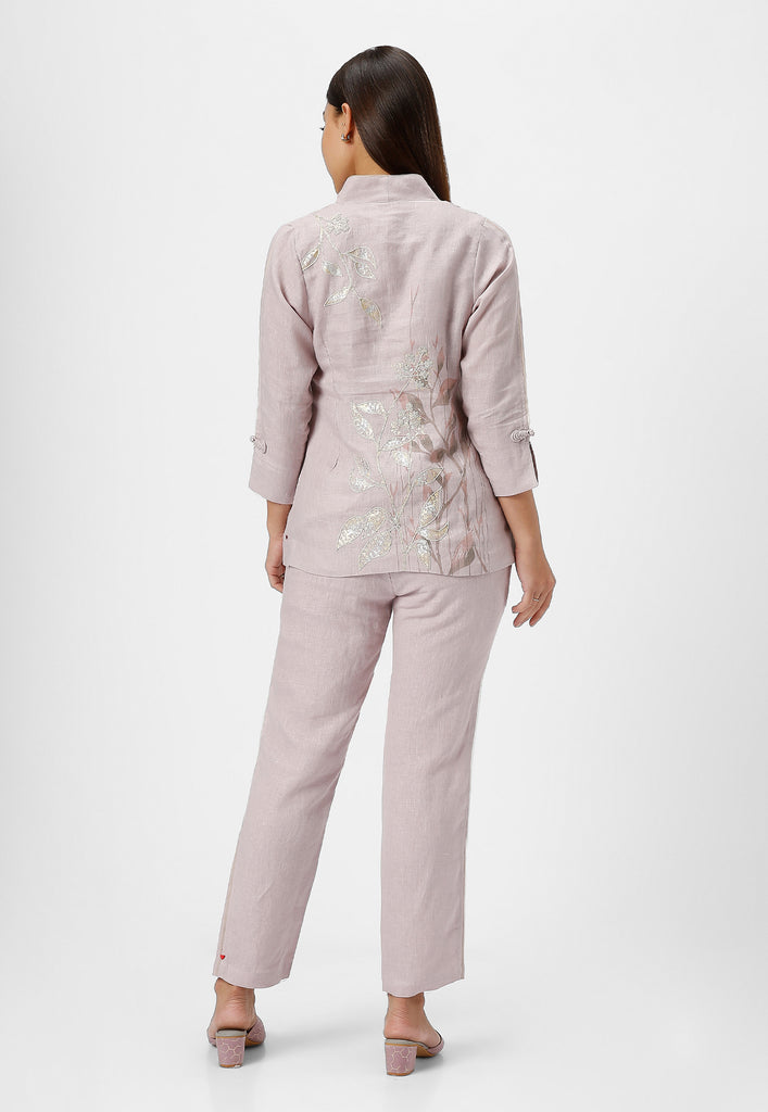 • A collar neck Jacket combines heat press foil craft and hand drawn abstract design along a line-art in cotton thread embroidery.