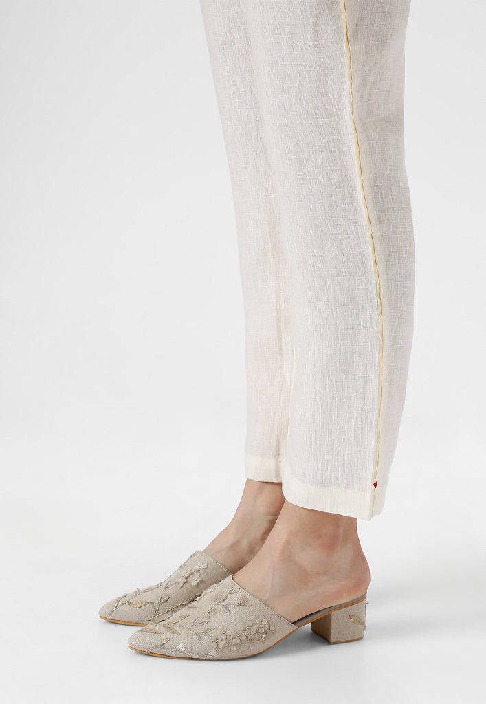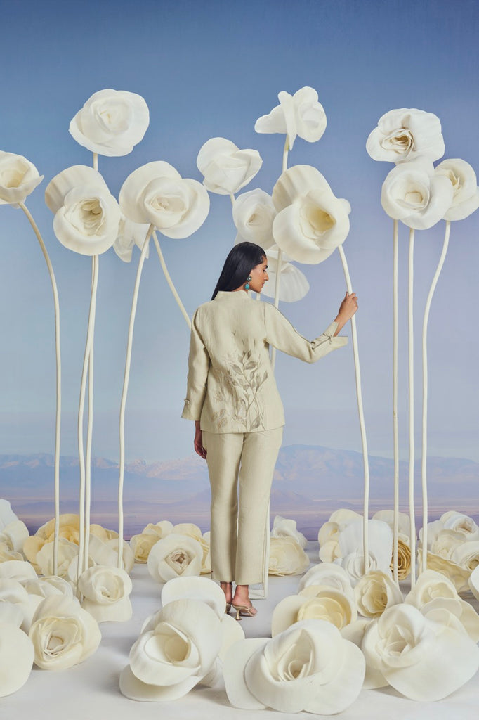 Inspired by the woody, ringed culms of the perennial bamboo, this magnificent range dons the intriguing shadows of these stems overlapping one another by virtue of a three-screen printing technique that is akin to beautiful water colours on fabric. Further elevating the design are intricately hand-embroidered leaves using anchor thread embroidery; stroked with light and dull shades of gold- adding a touch of shimmer with depth while embossing the beauty of the bamboo to the surface on fine linen. This sparkling range also makes for the perfect attire to work on special occasions. Available in stunning shades of off-white, macroon and green tea.