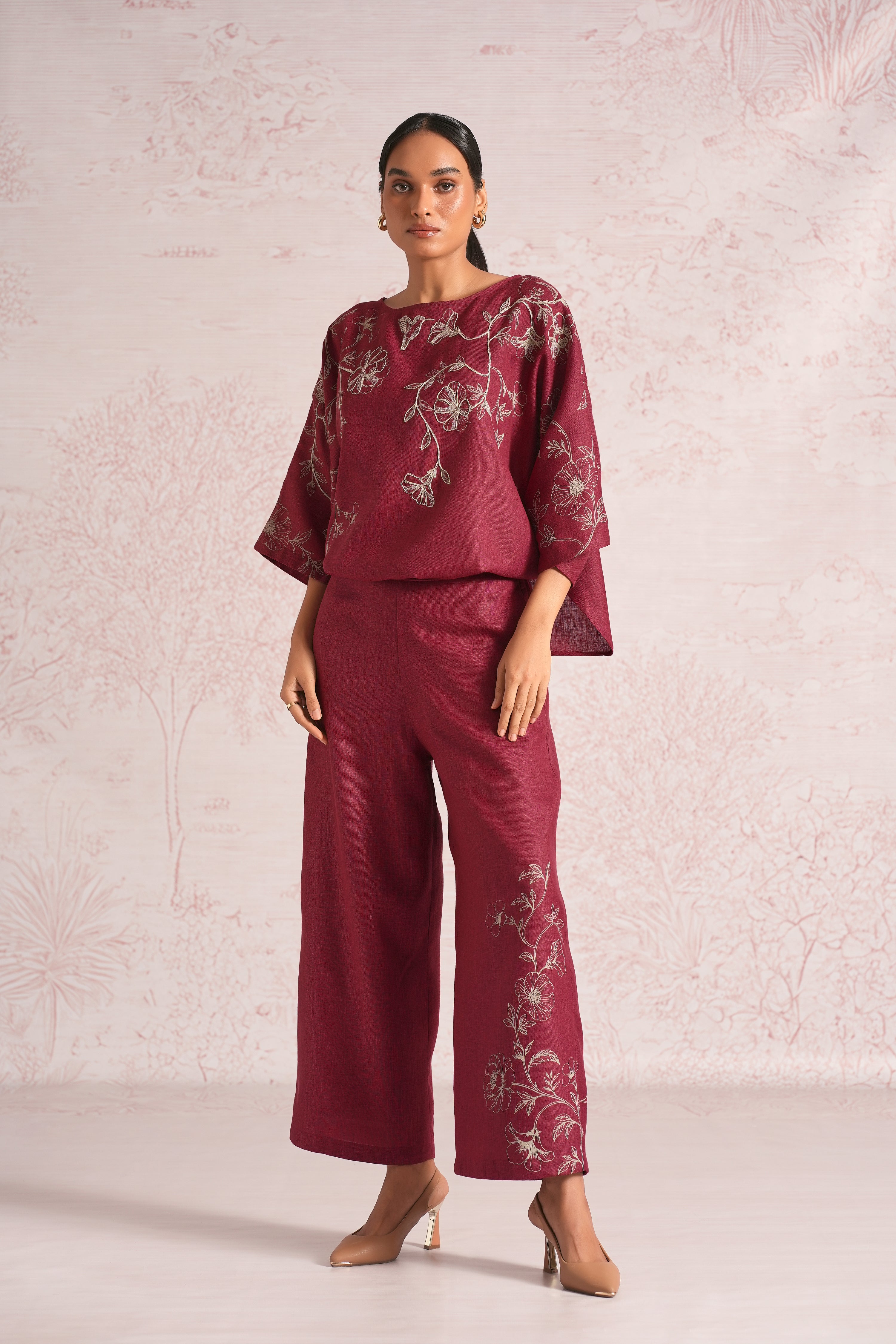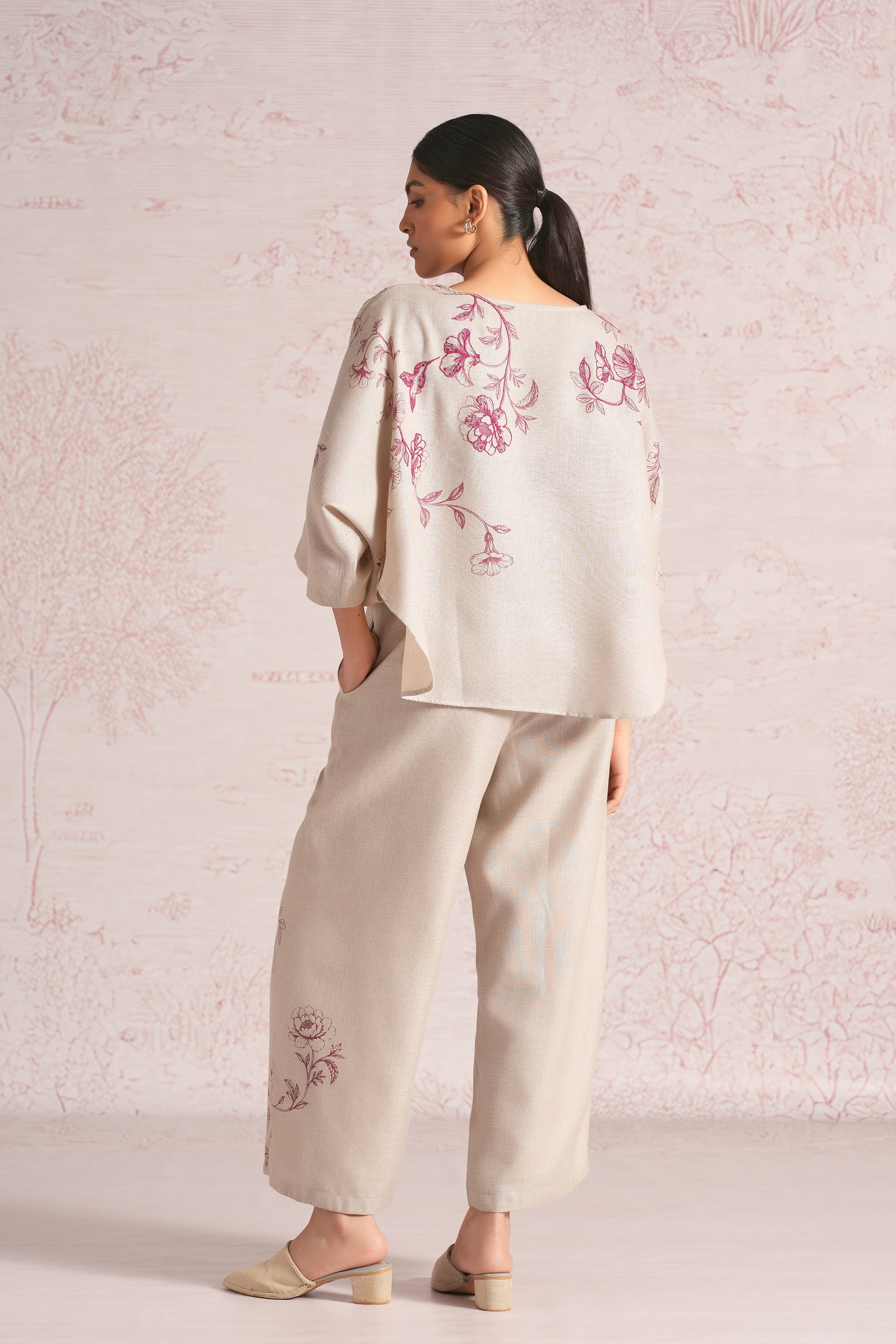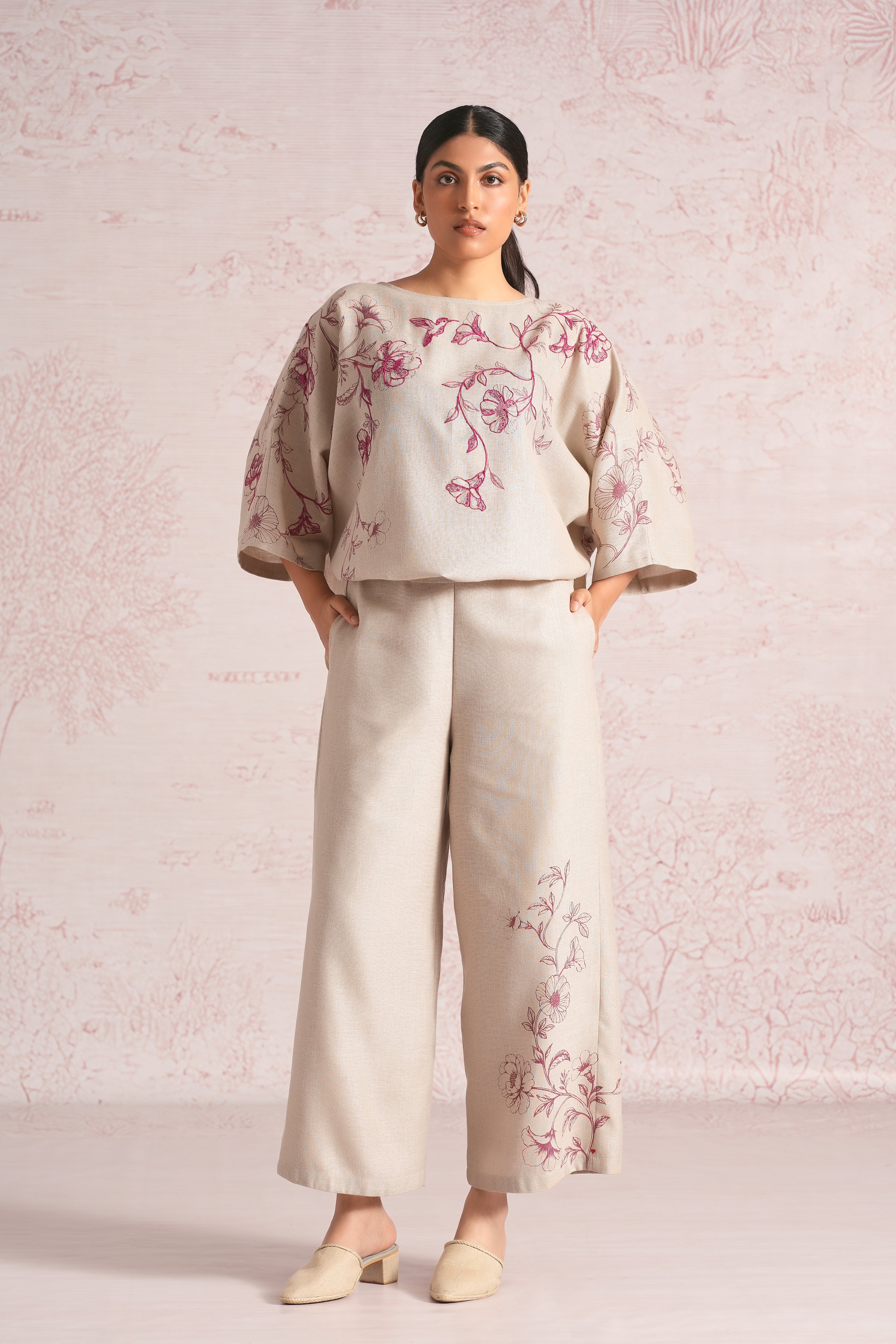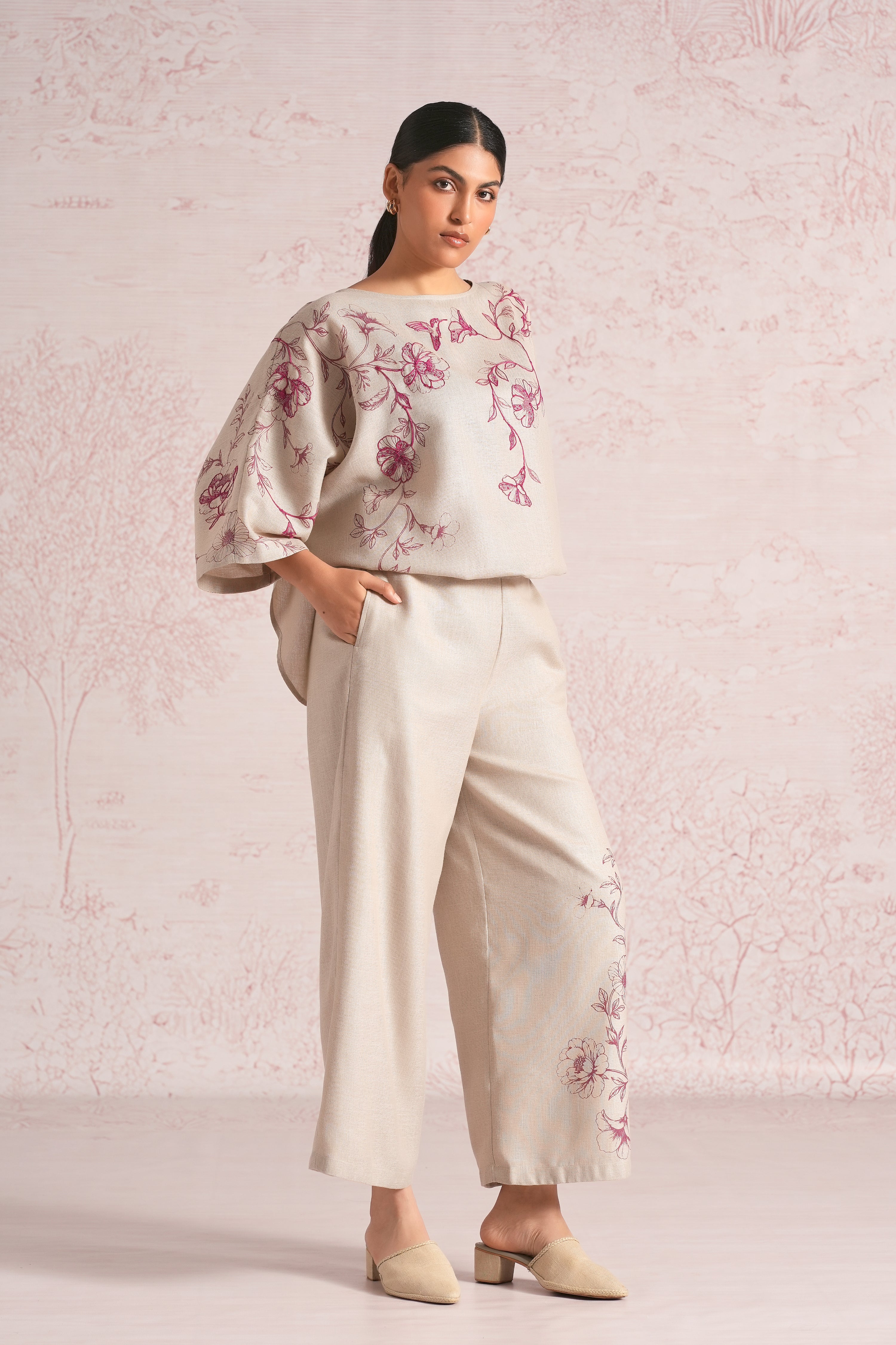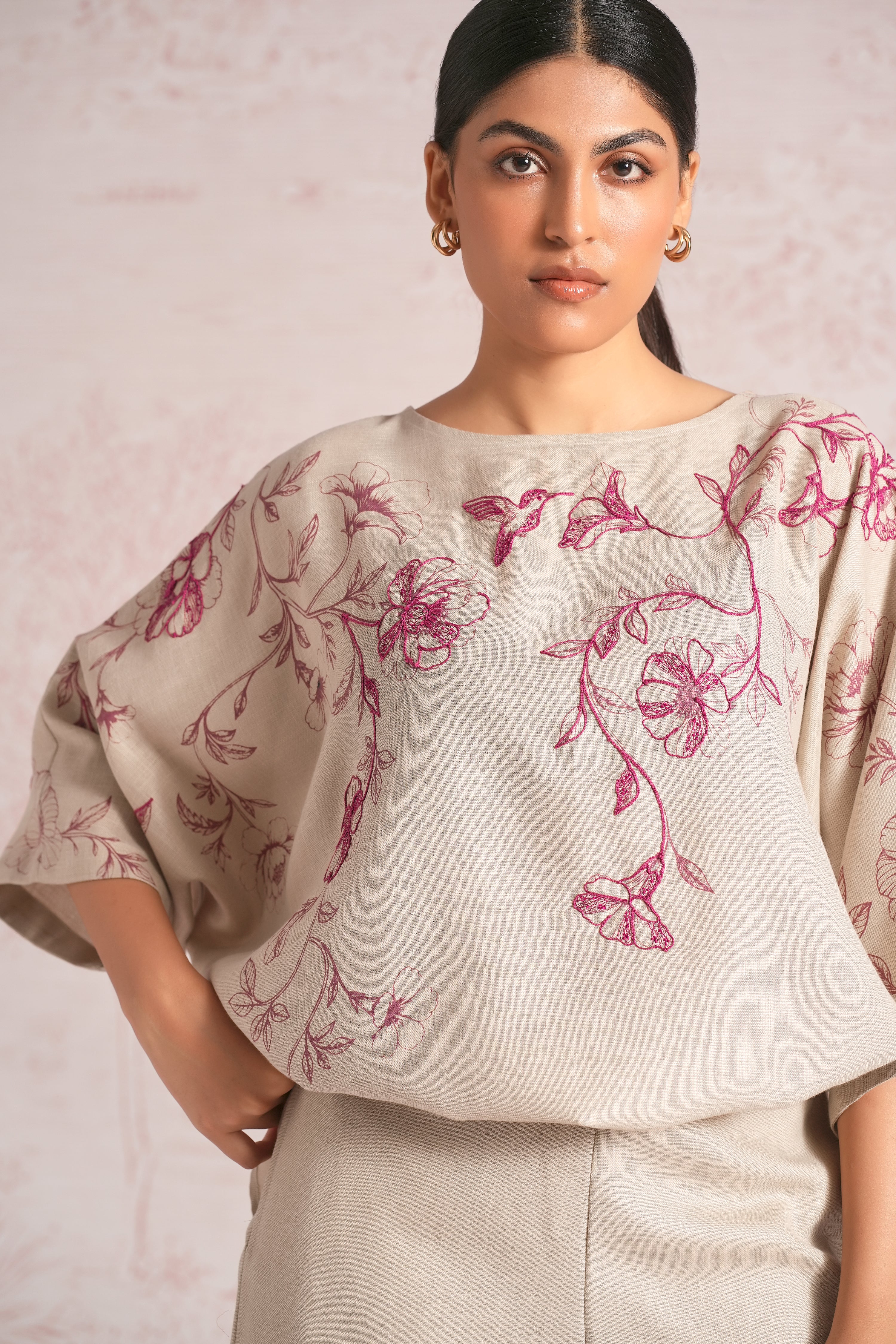 Bloomscapes is a poetic expression of nature in motion, portraying a blooming landscape animated by florals and charming birds that unfold fluidly across the silhouette with graceful, layered depth. Rendered in refined hues of natural and merlot, the collection balances softness with depth, creating a quietly luxurious mood. Thoughtfully designed styles—from an elegant cinched dress to a relaxed tie-up top—offer effortless versatility. Each piece moves seamlessly from day to evening, making it easy to dress up or down. Rooted in timeless elegance and gentle artistry, Bloomscapes celebrates femininity with ease and sophistication.