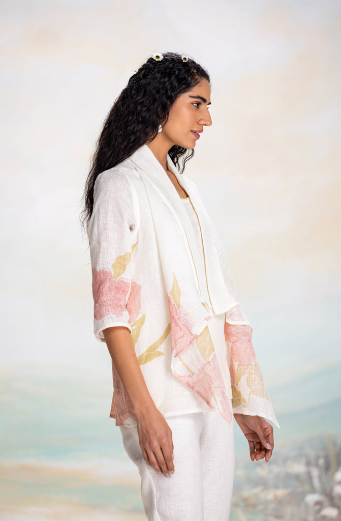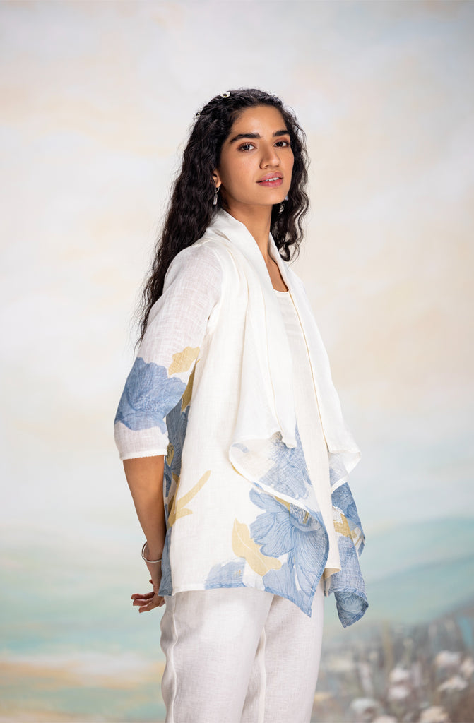 • A stylish jacket top featuring a cascading shawl collar and 3/4 sleeves.