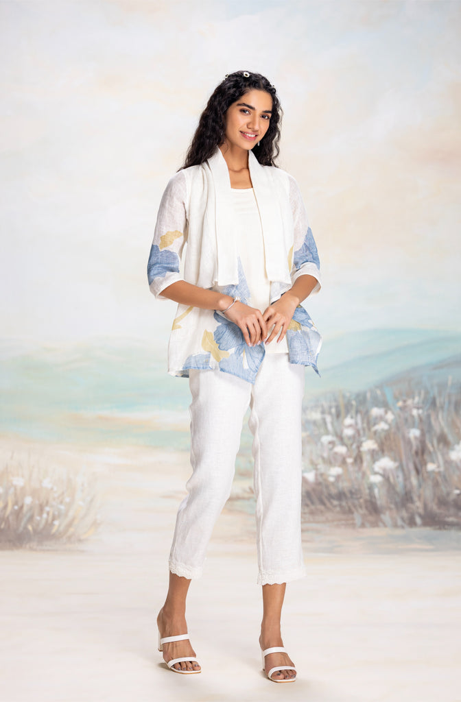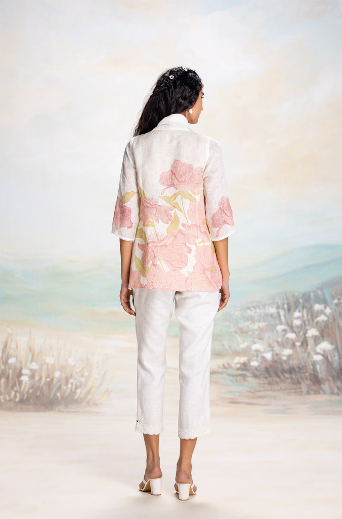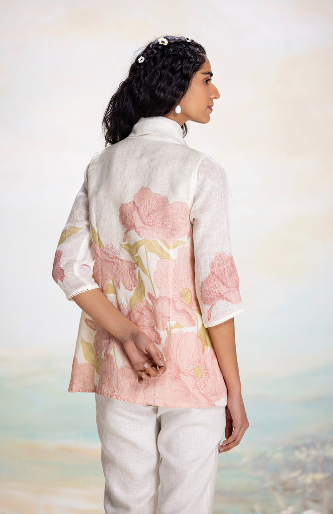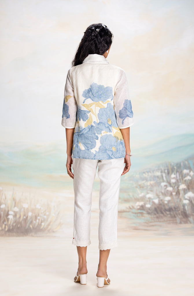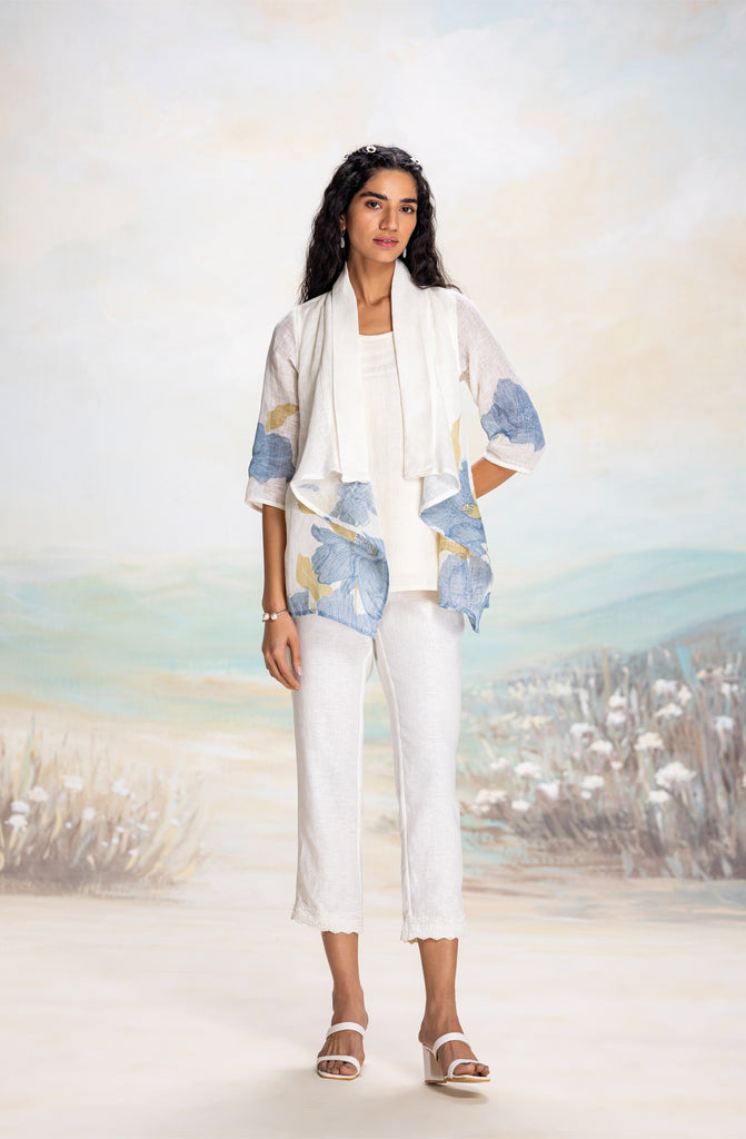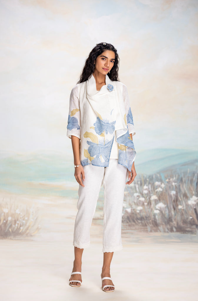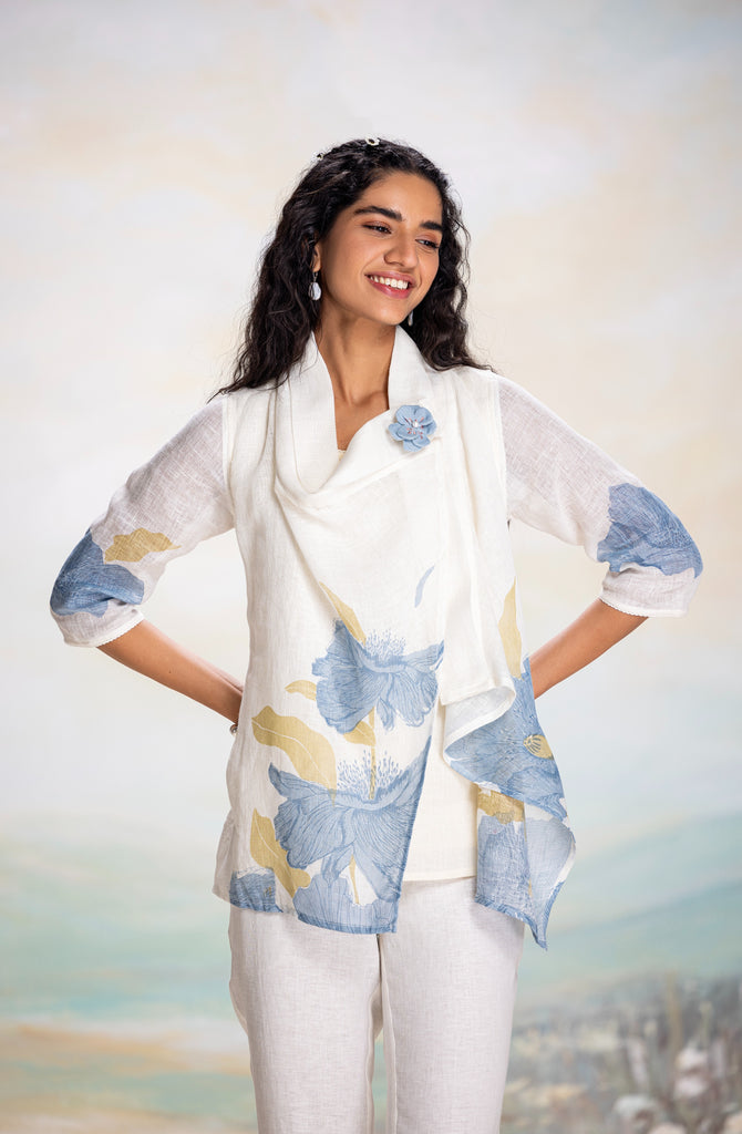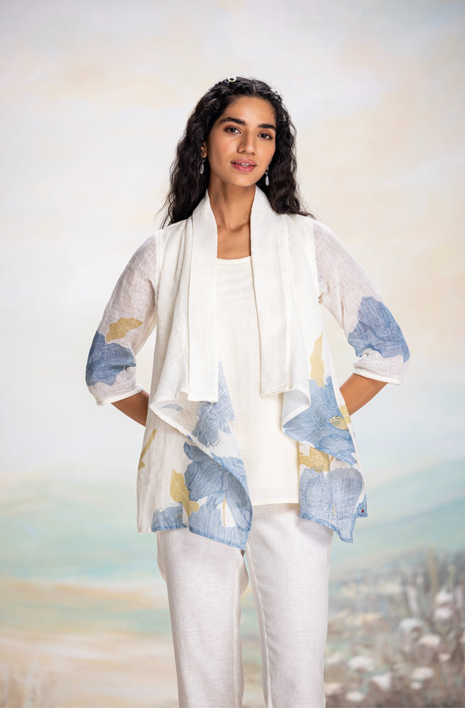 • Hand Screen printed with blobs of paint forming a artist elegance of abstract floral that flows all along the hem and sleeves, in the hues of blue and pink.