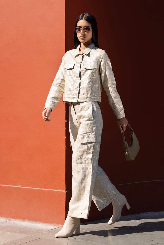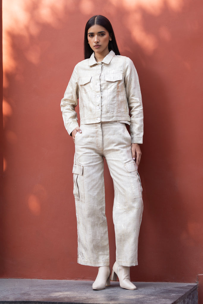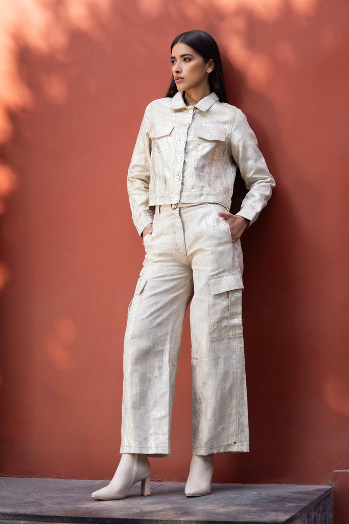 • Cargo pants inspired by denim, featuring gold foil brush strokes. The relaxed fit, utility pockets, and shimmering gold details combine casual style with artistic luxury.