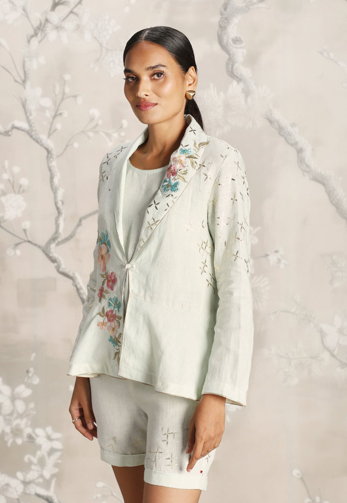 Inspired by the emblem of ceremonial festivities and the beauty that surrounds us, the resplendent range of Corsage on luxurious linen springs to life with delicate blooms embedded through intricate silk thread embroidery and finished with a repetitive motif layer of gold that gleams to the light-elevating style with an elegance that you richly deserve.