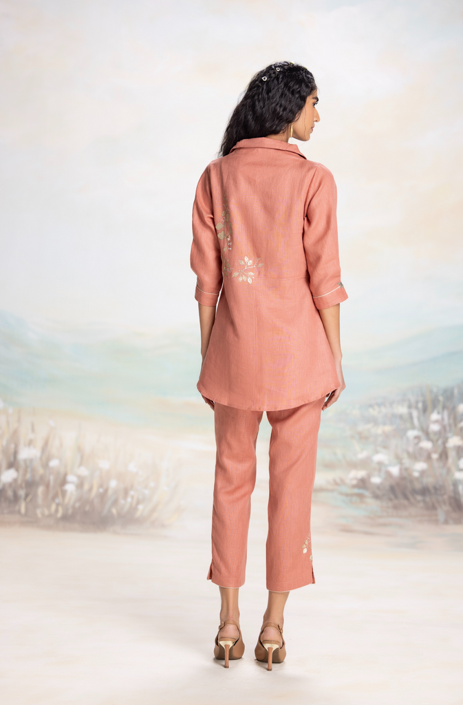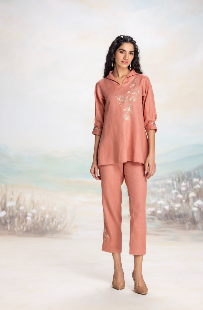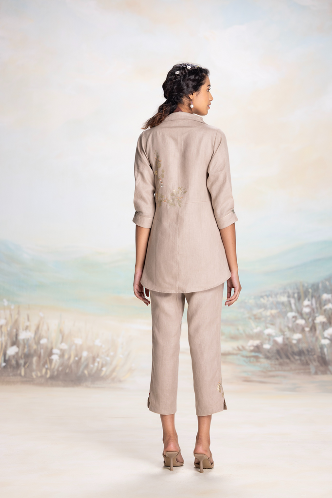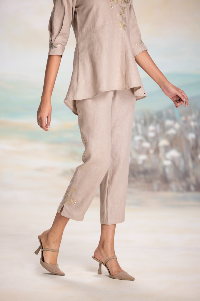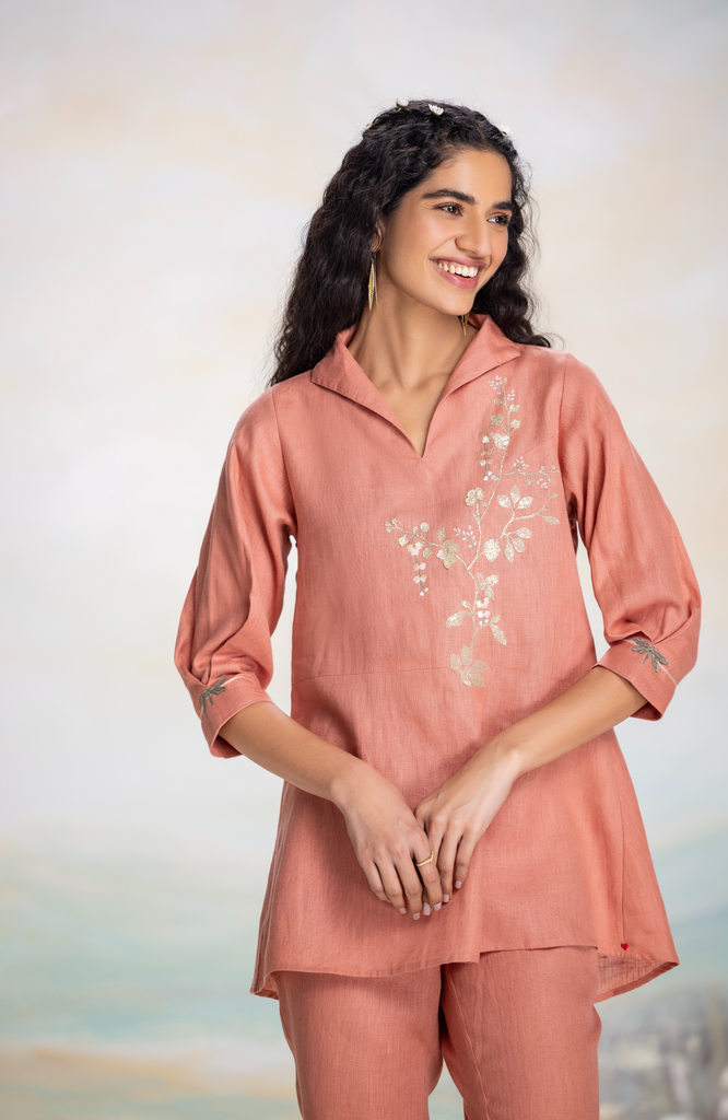 Taking a page from gold imprints on leather-bound books is a gleaming interpretation of Mother Nature on luxurious linen, handcrafted with Golden Leaves. Each organza leaf is touched with a generous coat of gold, laser-cut and hand-appliqued on the fabric accompanied by intricate silk-thread embroidery for added detailing, depth and definition. This layer is further emboldened with a pop of colour from hand-embroidered blooms in silk thread, letting your style shine with a regal grace this season. Available in splendid hues of Cement and Peach.