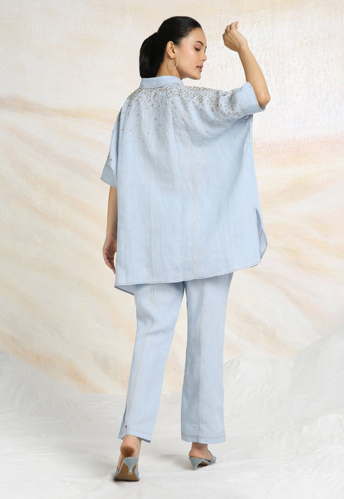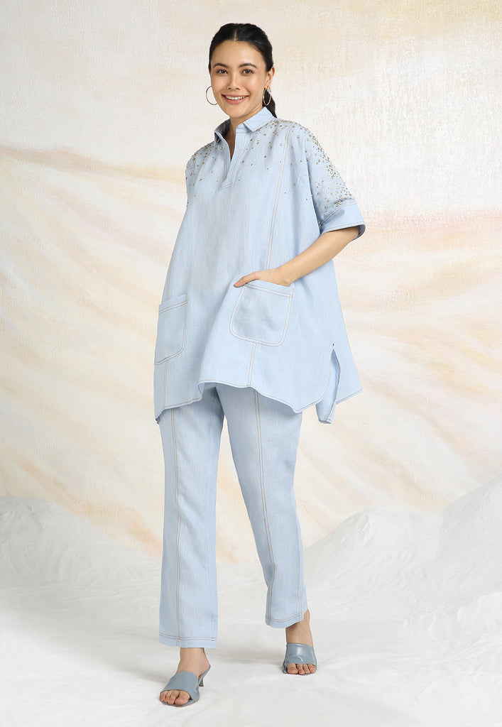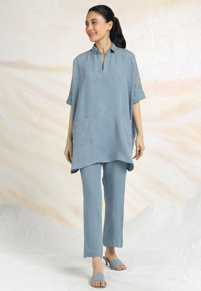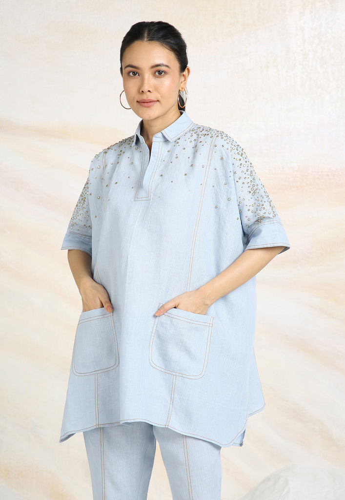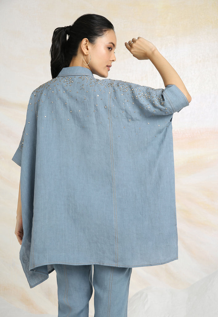 • Collared neck with continuous placket and half sleeves that come with a cuff.