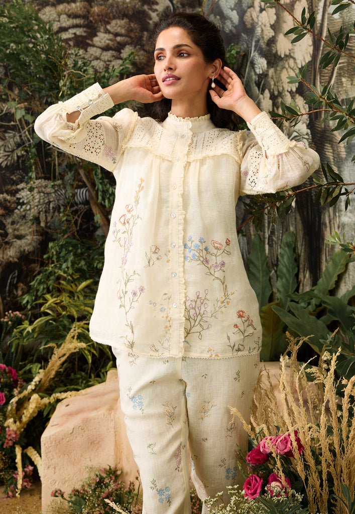 • An elegant shirt with ruffled mandarin collar and slightly puffed sleeves followed by delicate Hakuba lace cuff. The shirt is paired with a set of floral straight pants.