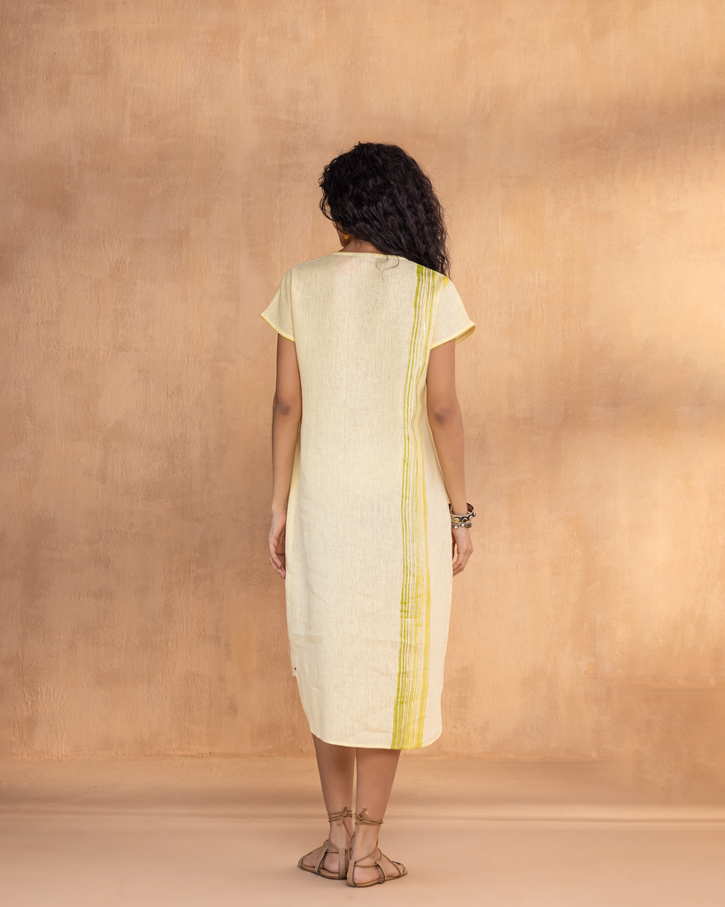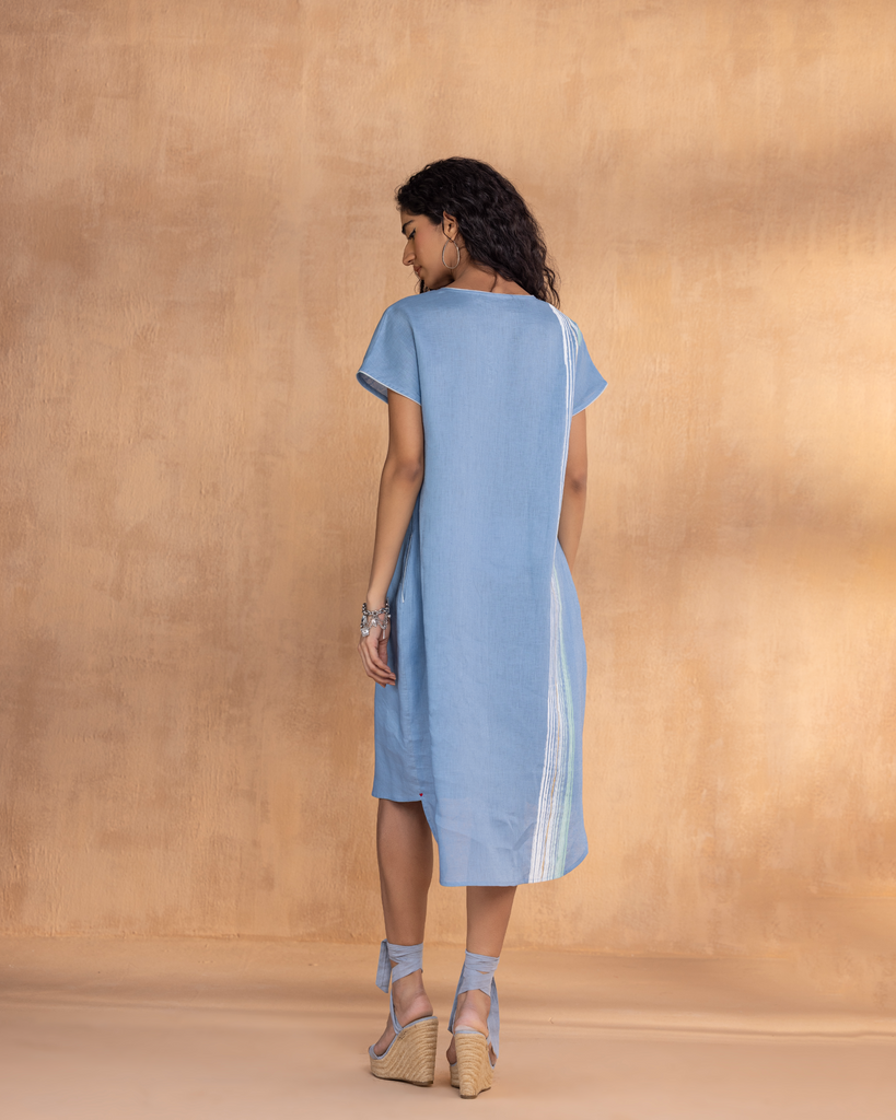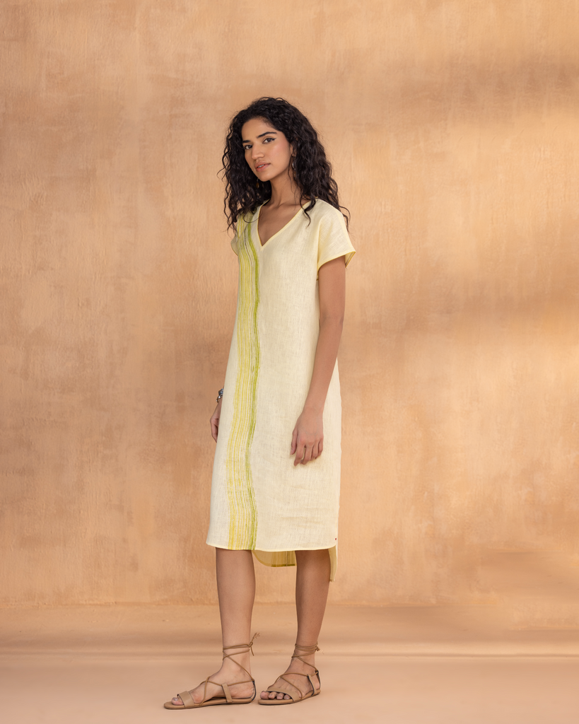• Featuring a classic V-neckline that elongates the neck, the dress is balanced by extended sleeves that drape gently for a relaxed yet refined look. Perfect for both day and evening wear, this piece transitions seamlessly from casual outings to elevated occasions.
