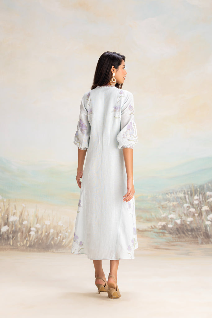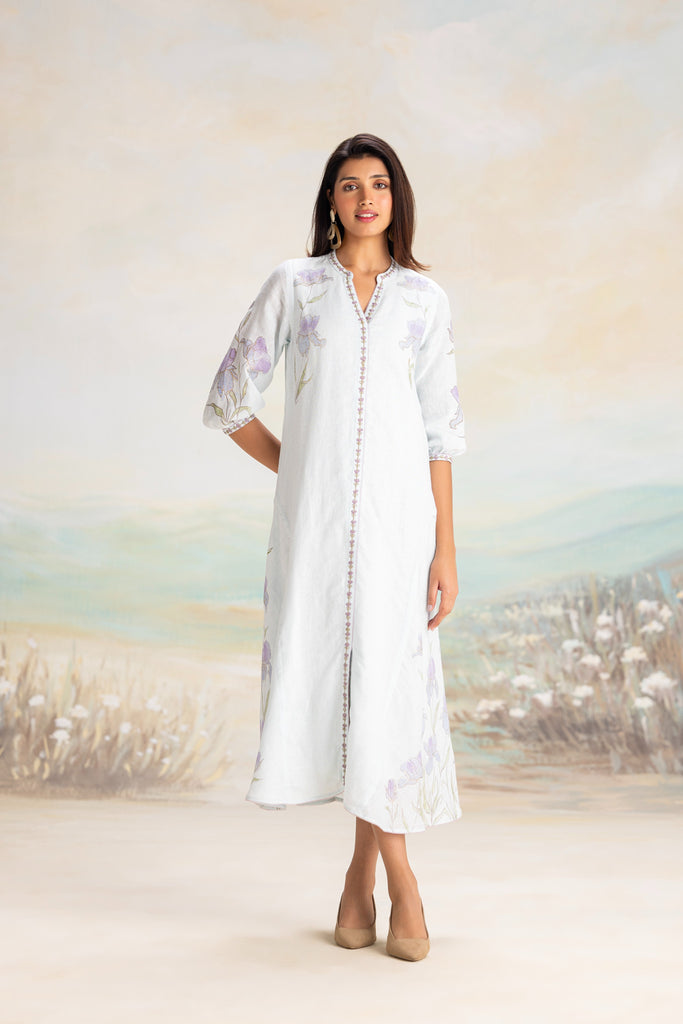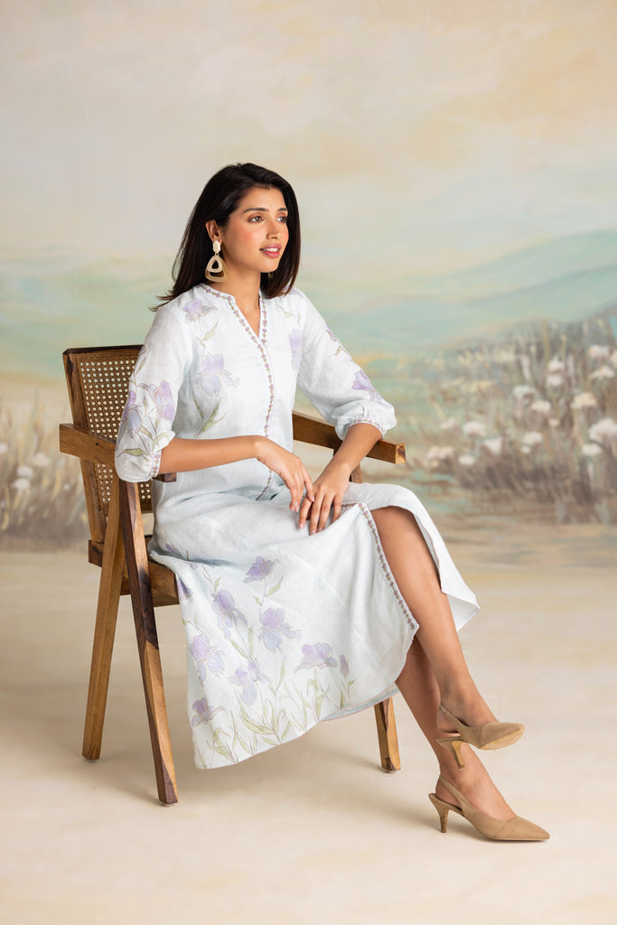 Inspired by the delicate purple iris that graces the English countryside, this collection embodies timeless beauty and is a testament to exquisite craftsmanship. Hand-sketched in the style of vintage botanical illustrations, the floral motifs are meticulously hand screen-printed on luxurious linen- their soft strokes akin to watercolours on paper. Thoughtfully placed, these blooms unfold with graceful femininity, further enhanced by shimmering gold foil artwork that shines with your every move. The elegance of each piece is elevated by our beloved hand-embroidered tassels.