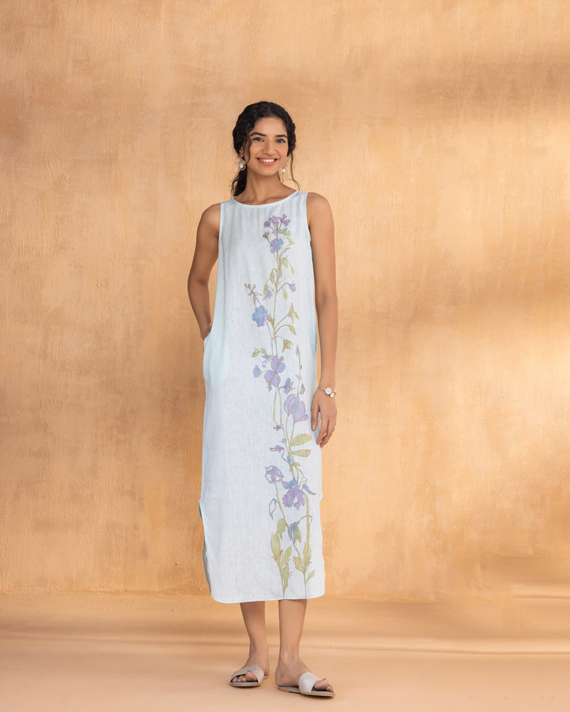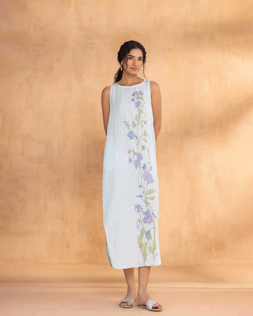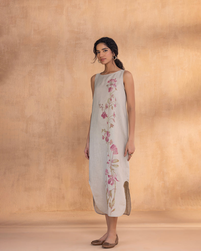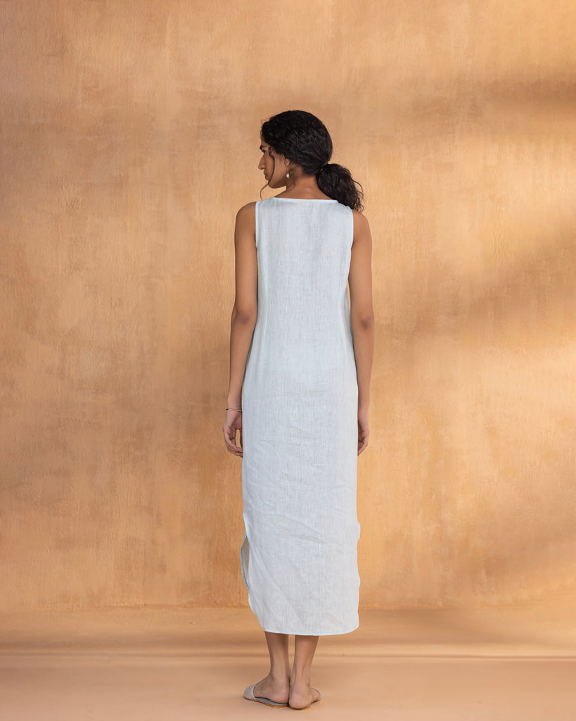 • A Sleeveless Boat Neck Dress with curved hem at the bottom and a small slit.