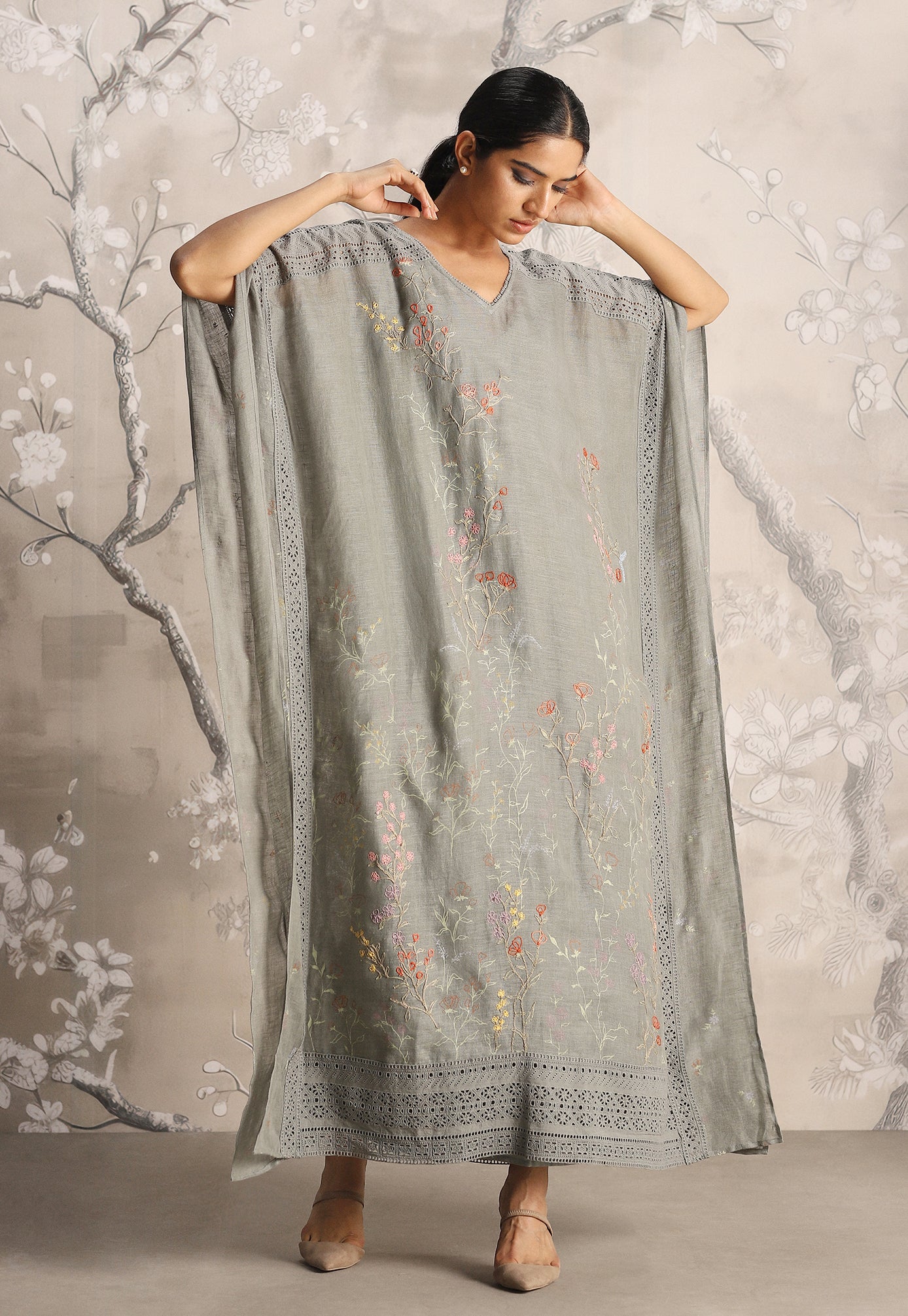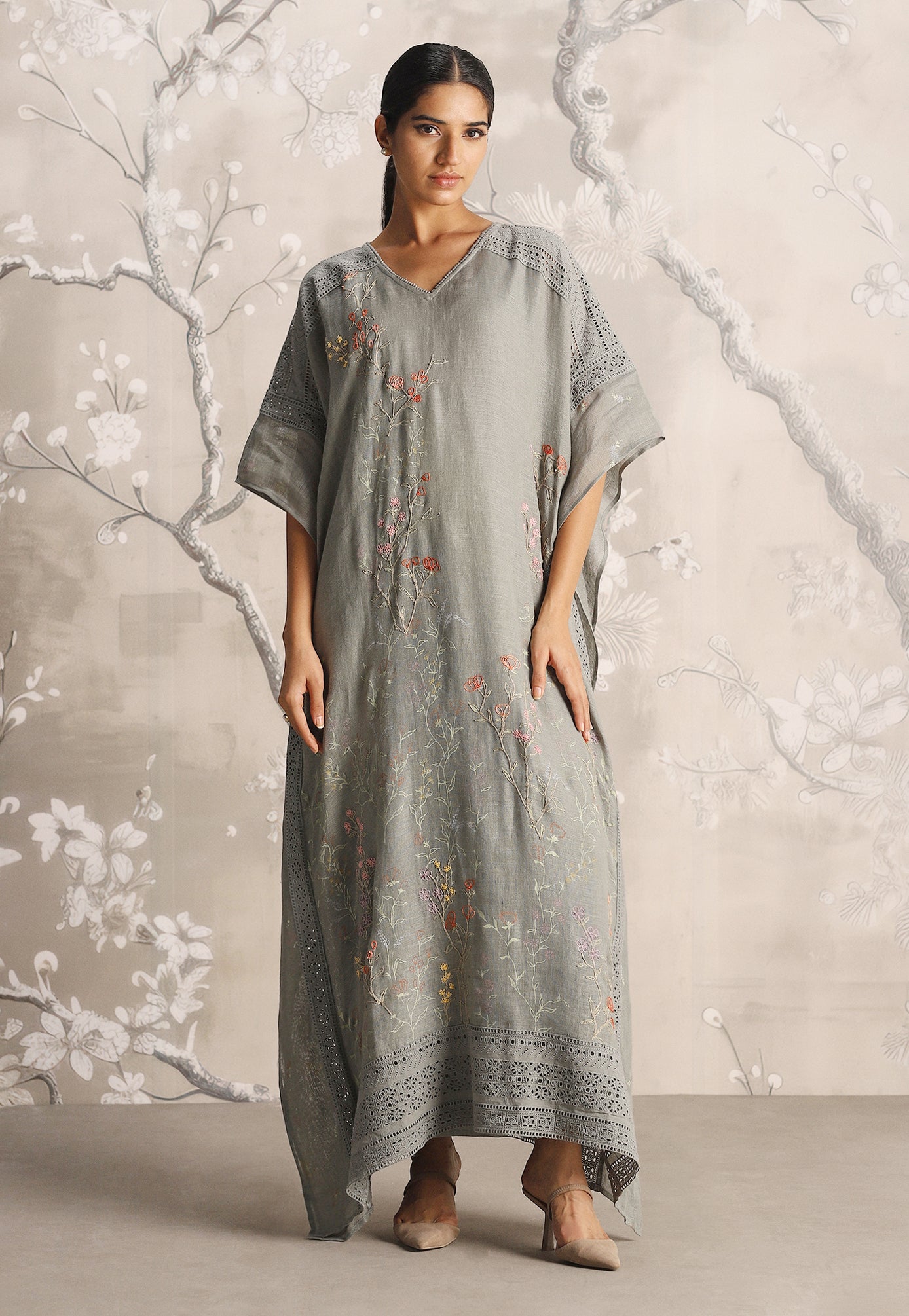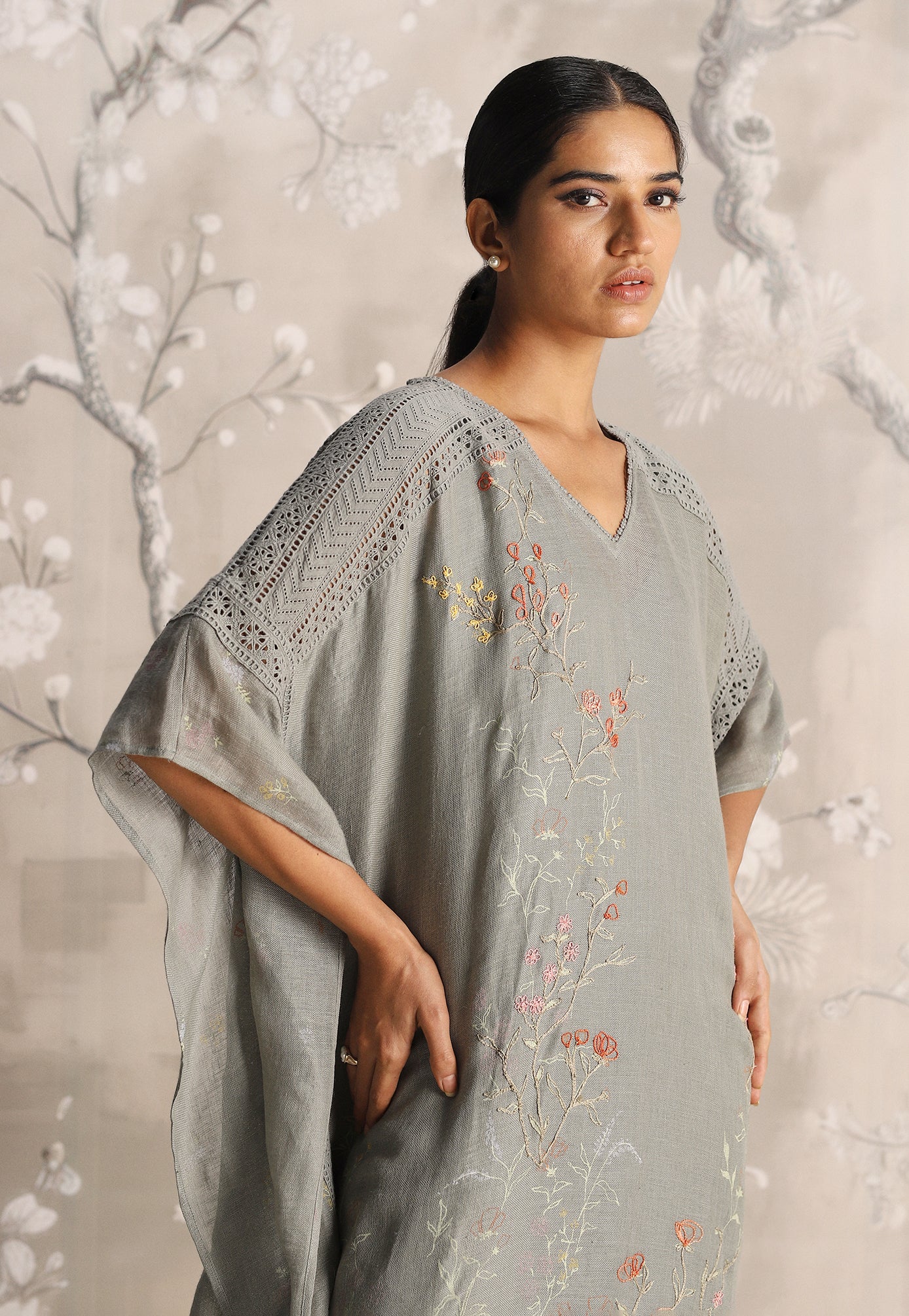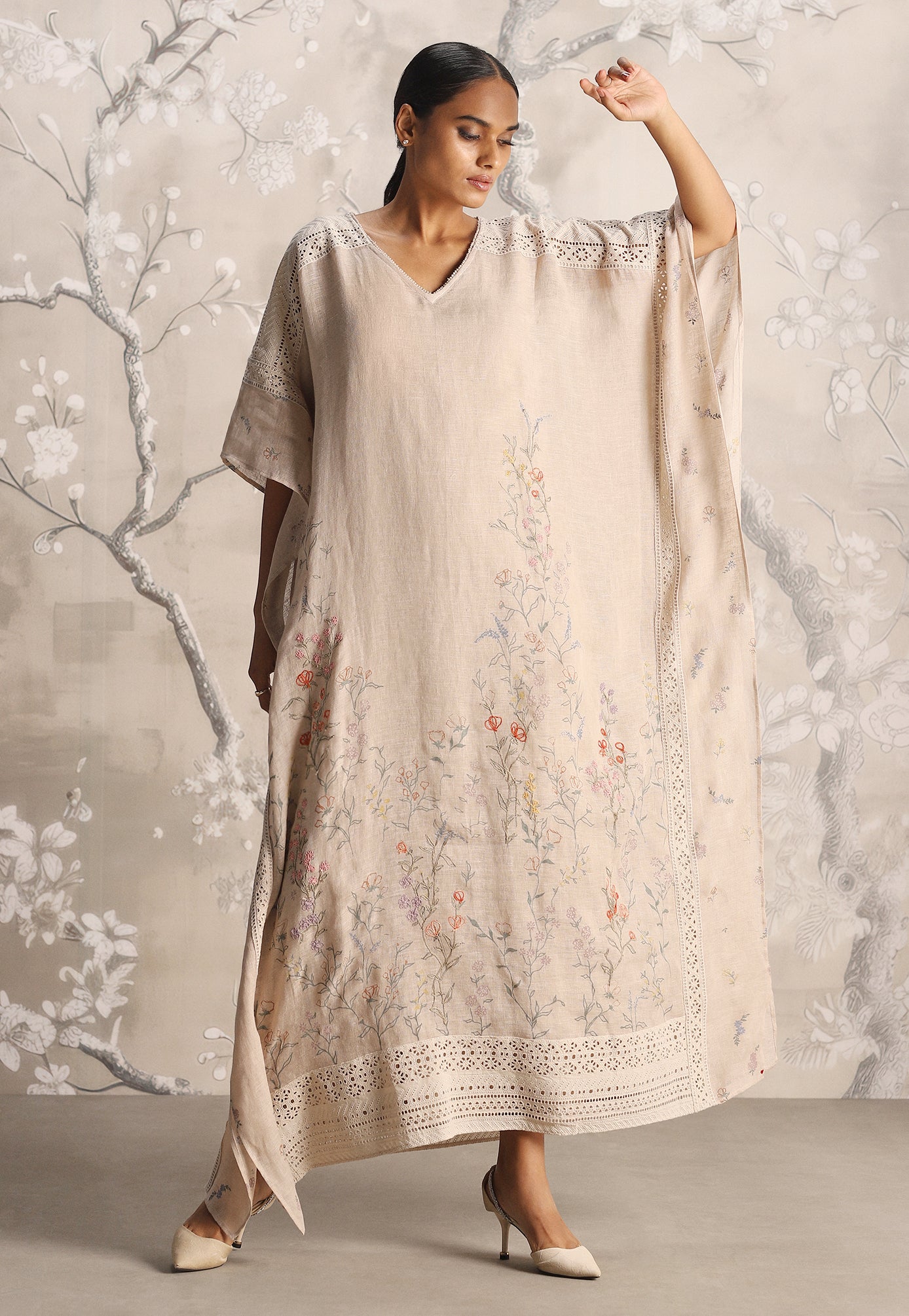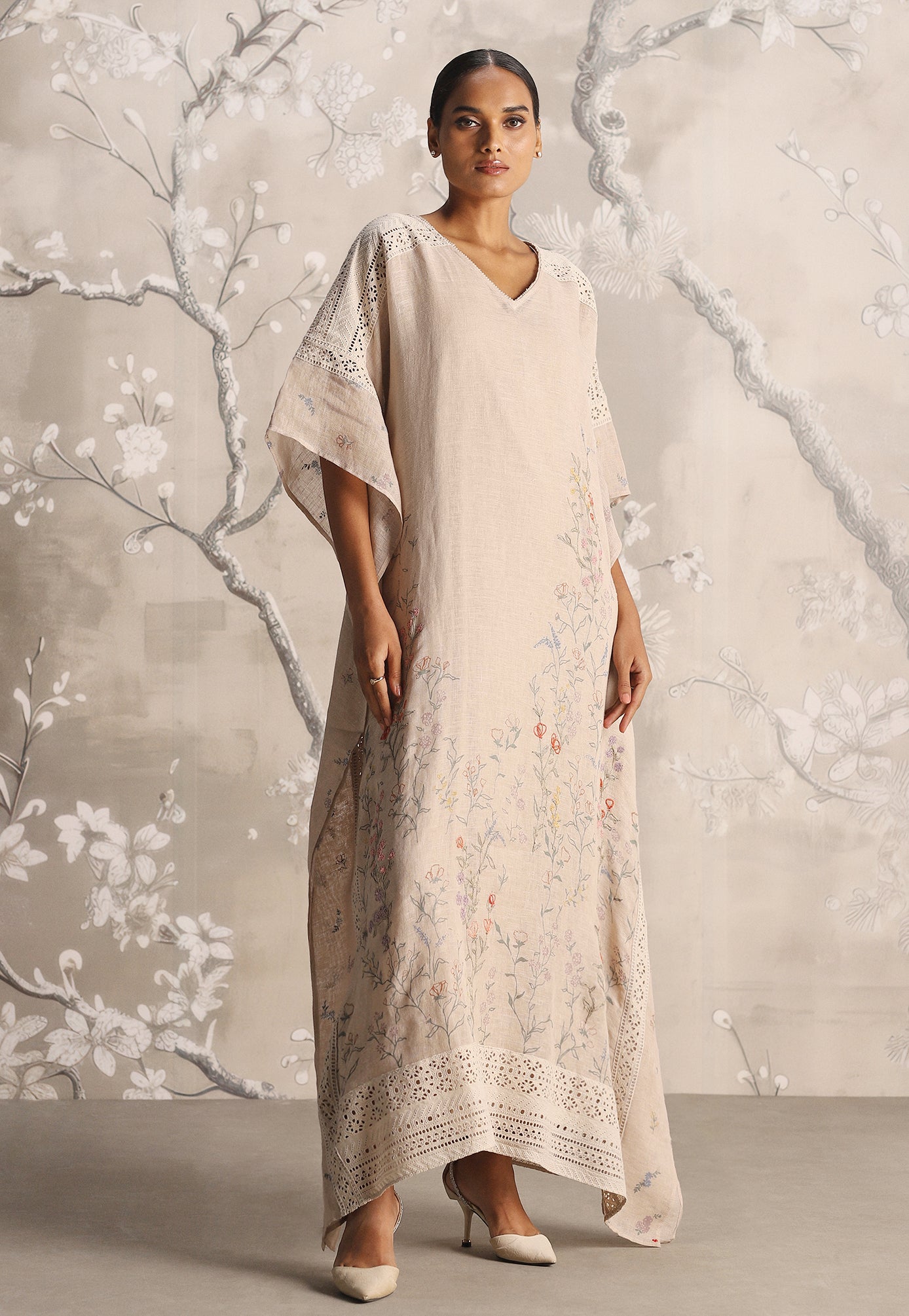 We venture into the forest on luxurious linen and between the denseness we witness exuberant blooms that are hand screen printed; accompanied by the sensuality of delicate Hakuba lace paired with harmonized embroidery to let you commune with mother nature in style.