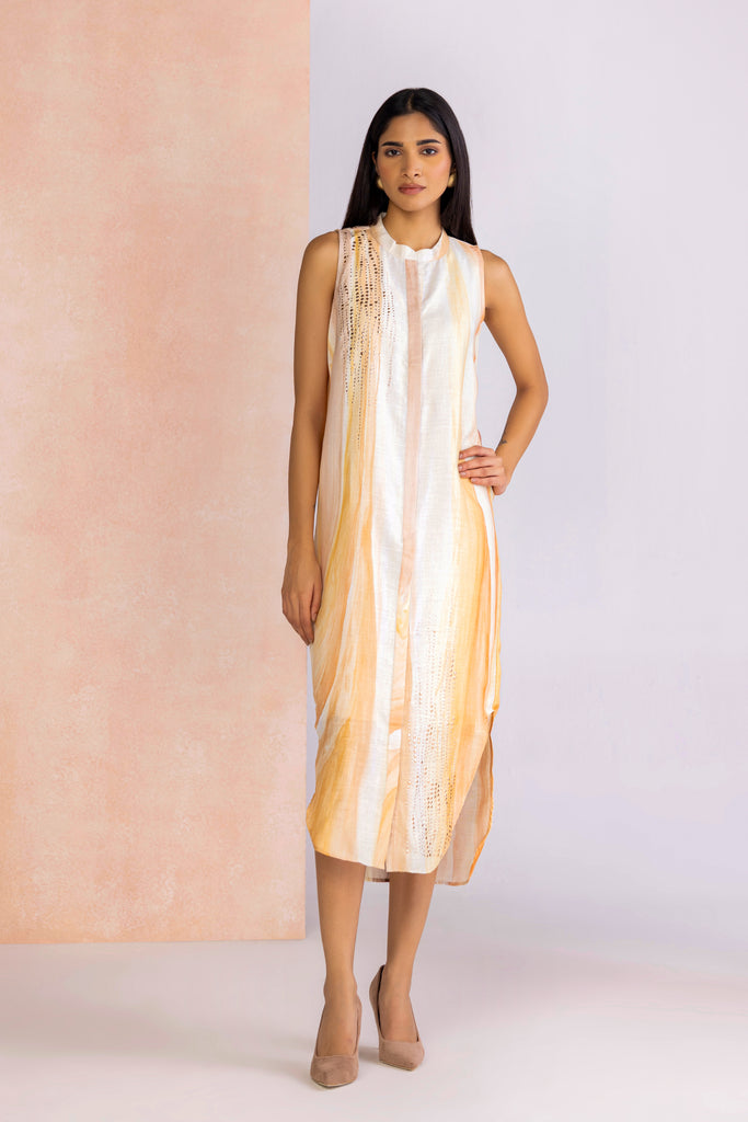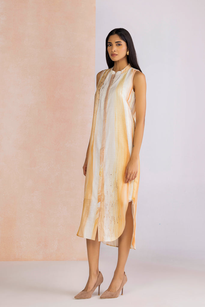 Agate captures the layered poetry of its namesake stone, where every fold and hue speaks of depth and quiet strength. Fluid silhouettes shimmer with the delicate gleam of gold stud work, while the palette unfolds in two striking tones—Rainbow, alive with vibrant iridescence, and Amber, glowing with timeless warmth.