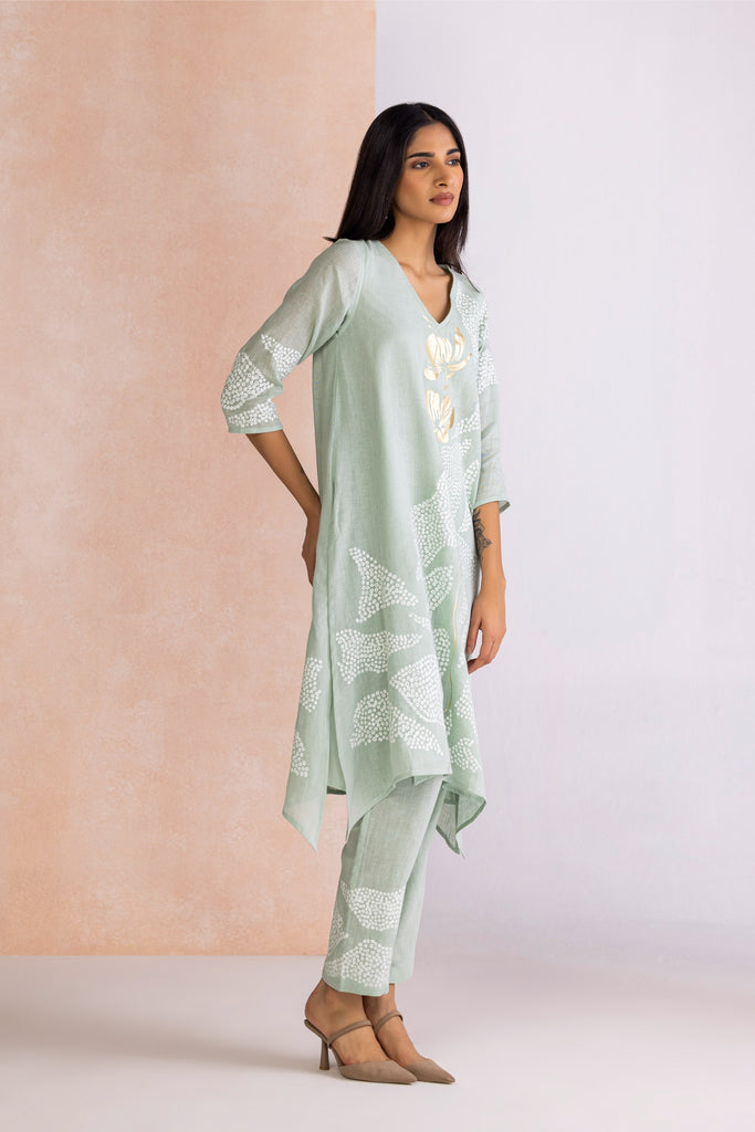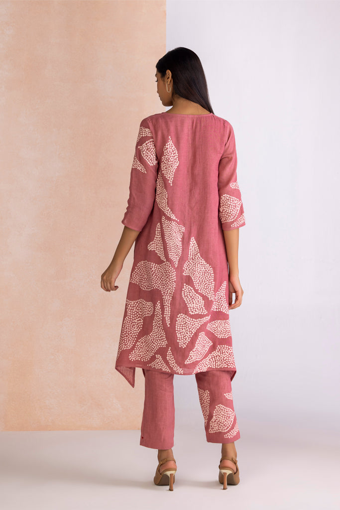Inspired by the timeless artistry of Bandhani, the Aurora collection reinterprets tradition through the modern craft of screen printing. Each piece is adorned with a delicate gold foiled flower at the center, adding a subtle shimmer against bold motifs. Presented in two colourways — Onion, with its warm, earthy richness, and Cloud, with its soft, airy elegance — the collection blends heritage inspiration with contemporary silhouettes, celebrating elegance that feels both rooted and refreshingly modern.