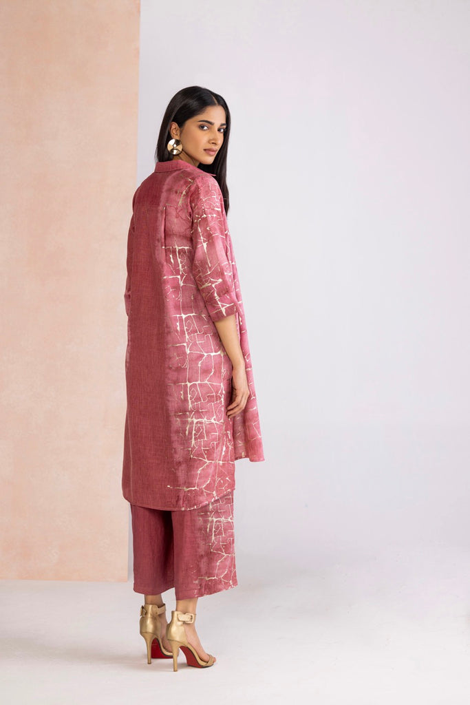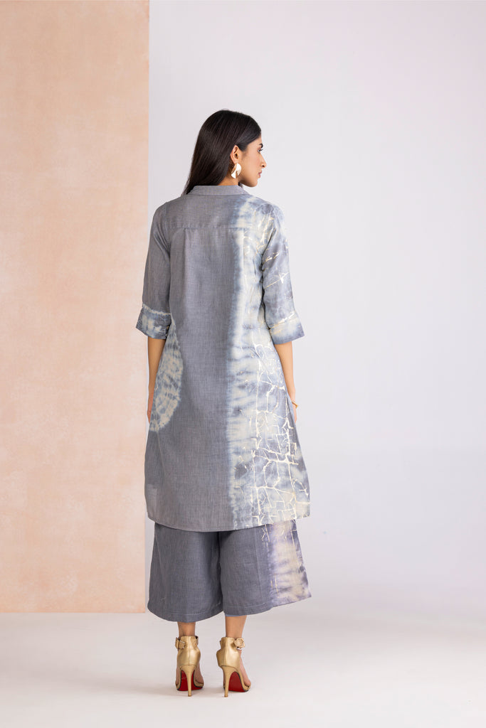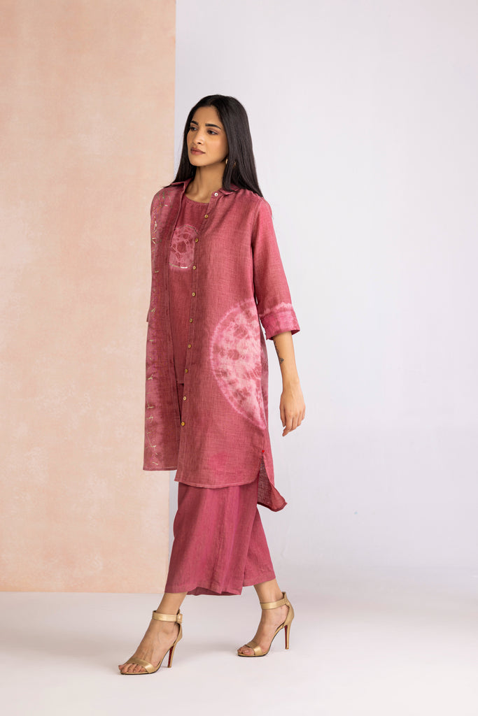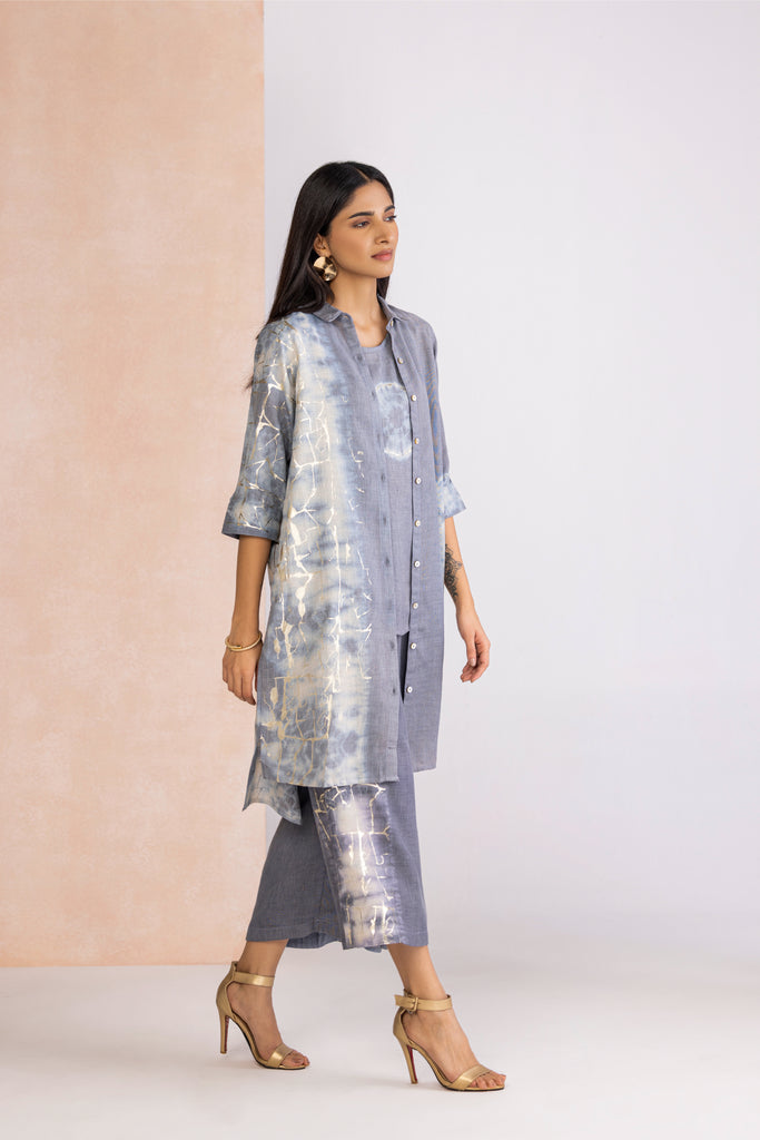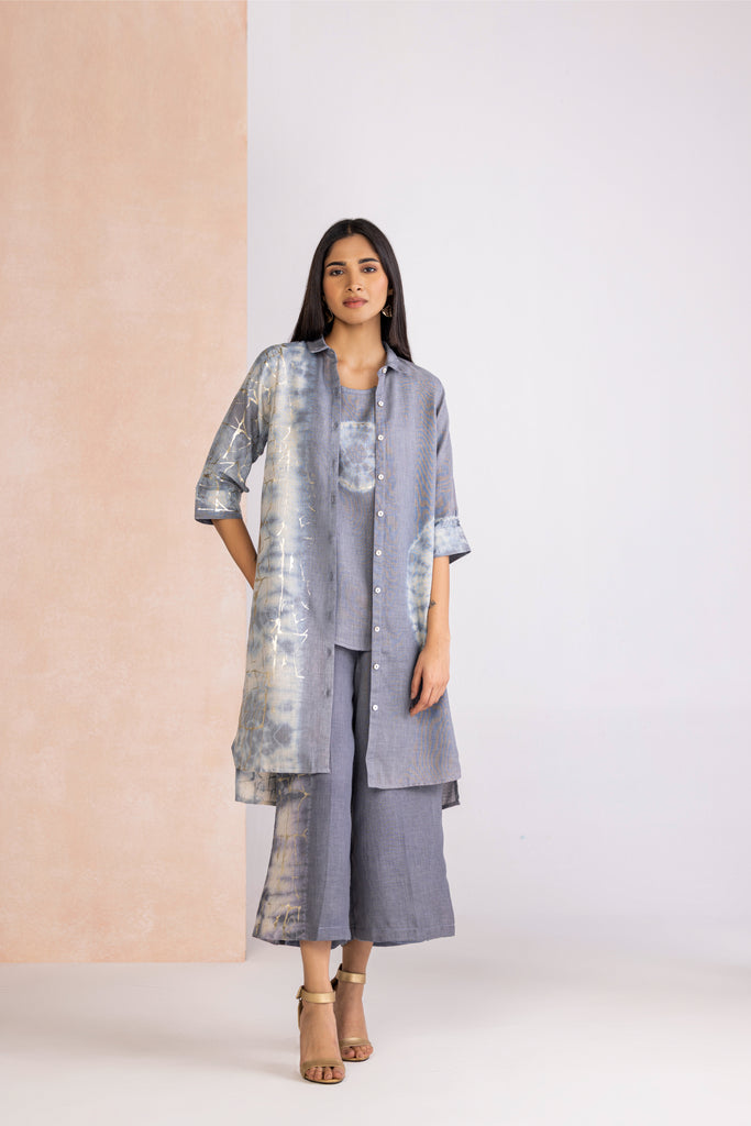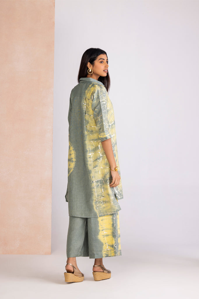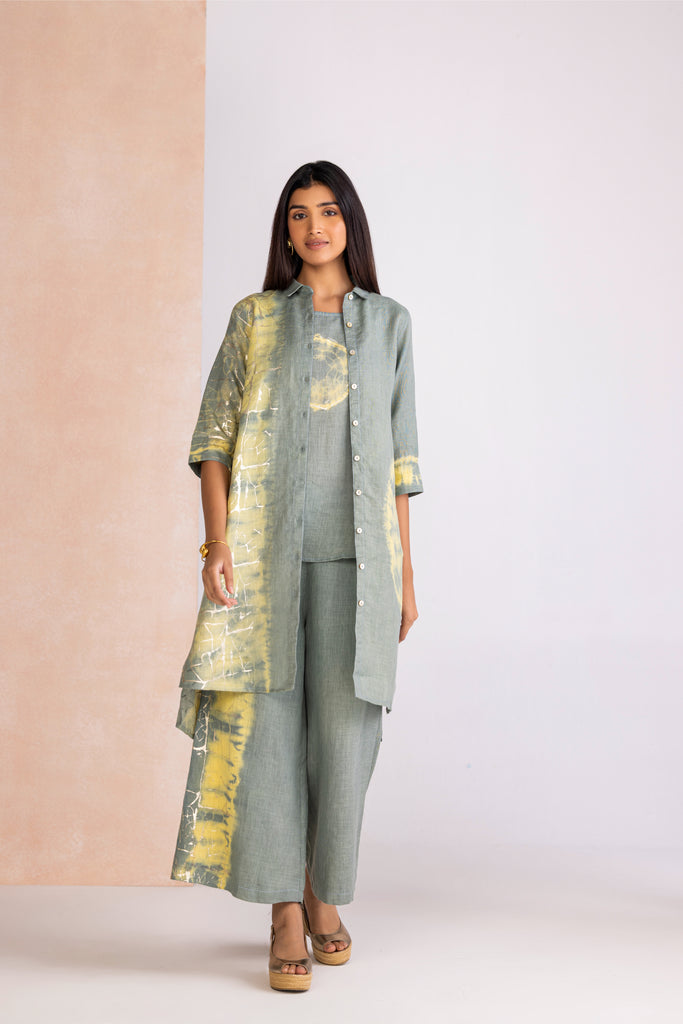 • The Celestides Jacket is a button-down layer designed for versatility, paired with a sleeveless shell top and flare pants for a coordinated look. The ensemble is brought to life with the collection’s signature tie-dye and gold foiling, creating a luminous play of colour and texture. Offered in Oxford on Natural, Jade on Yellow, and Onion on Blush.