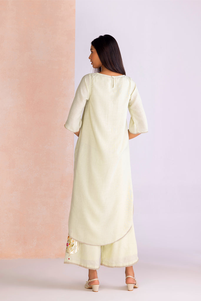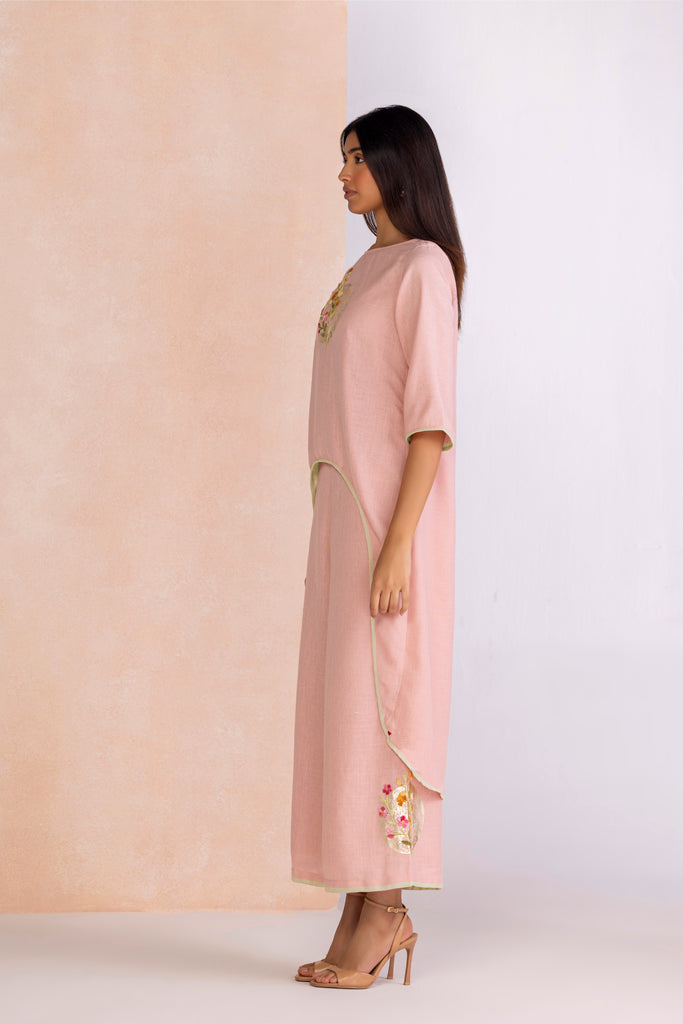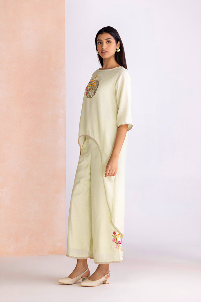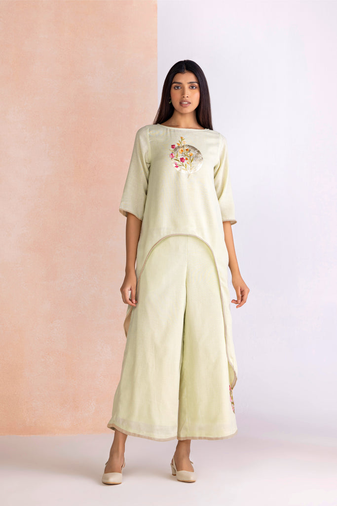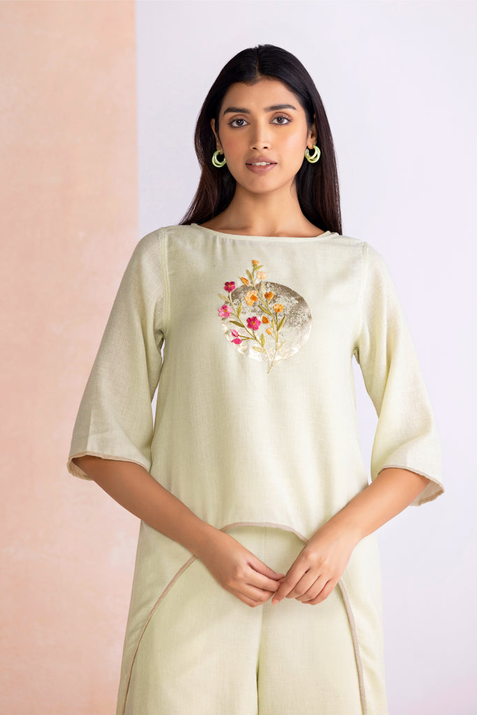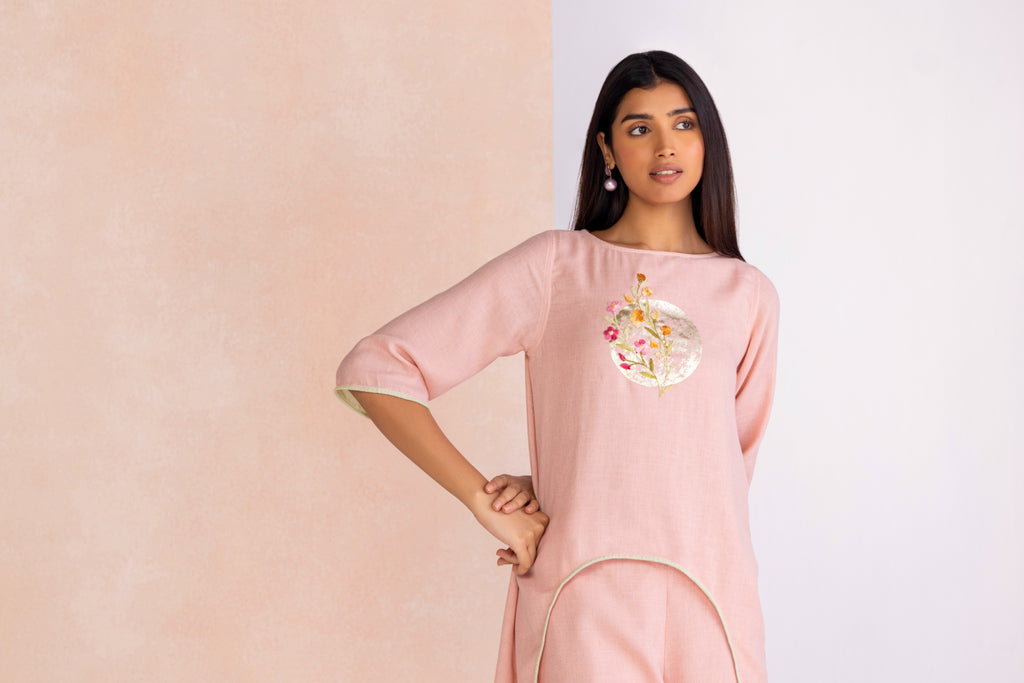 A poetic blend of shimmer and craftsmanship, Floral Moon draws inspiration from the quiet glow of moonlight over blossoming gardens. Delicate floral motifs are brought to life with intricate anchor thread embroidery, their texture adding depth and artistry to every piece. Accents of gold foiling glisten like moonlit reflections, creating a subtle yet striking interplay of light and detail. Offered in the refreshing hue of Lane Green and the romantic softness of Blush, the collection embodies timeless elegance with a luminous charm.