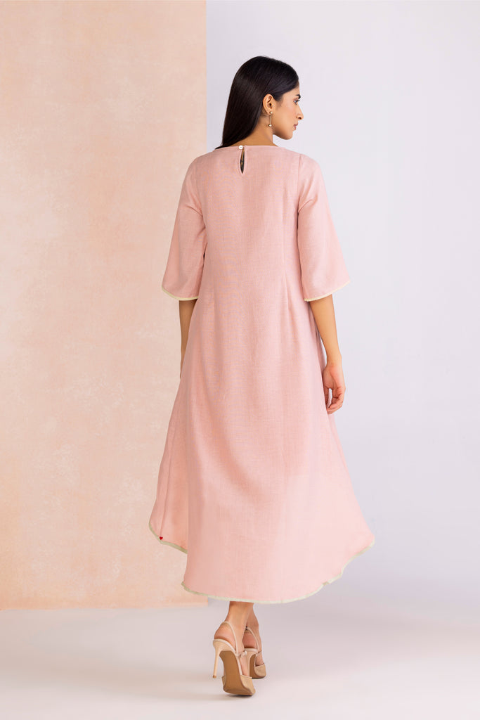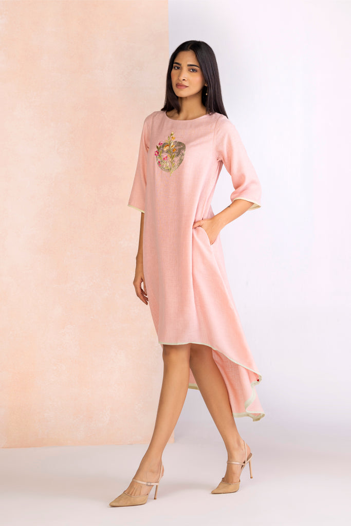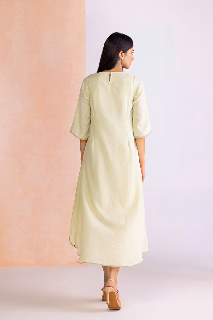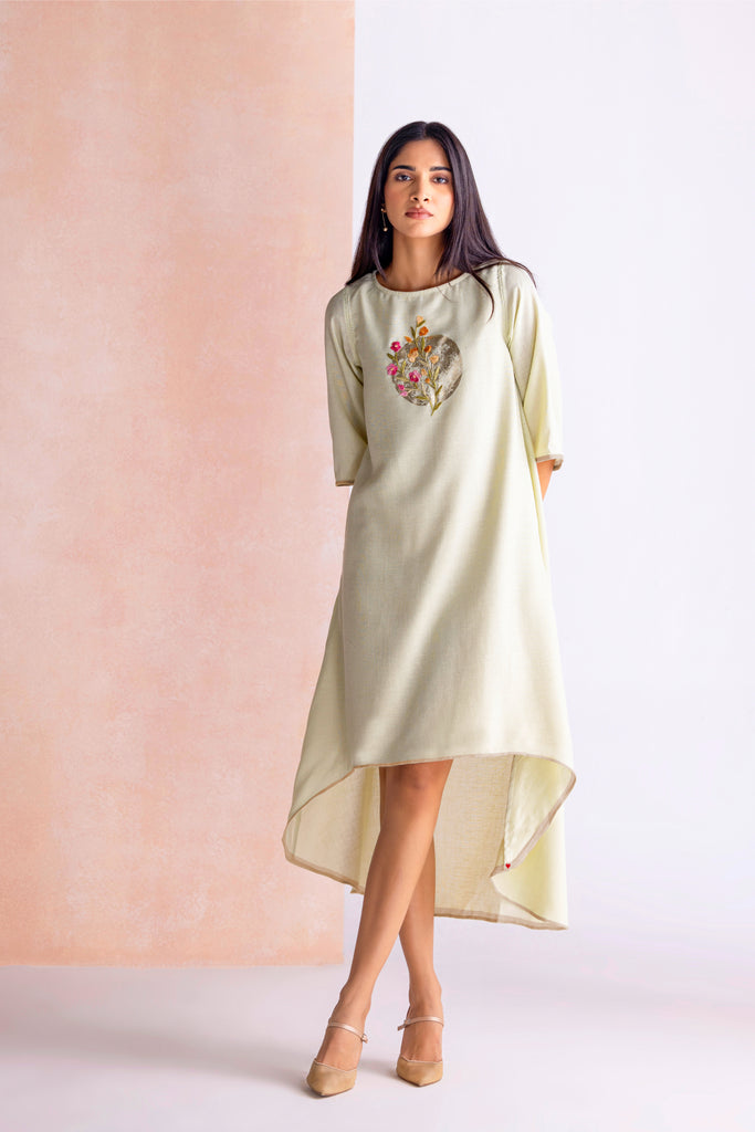 • Designed with a flowing high–low hemline and graceful 3/4 sleeves, this dress is adorned with gold foiling and anchor thread embroidery that add subtle shimmer. Effortlessly refined.