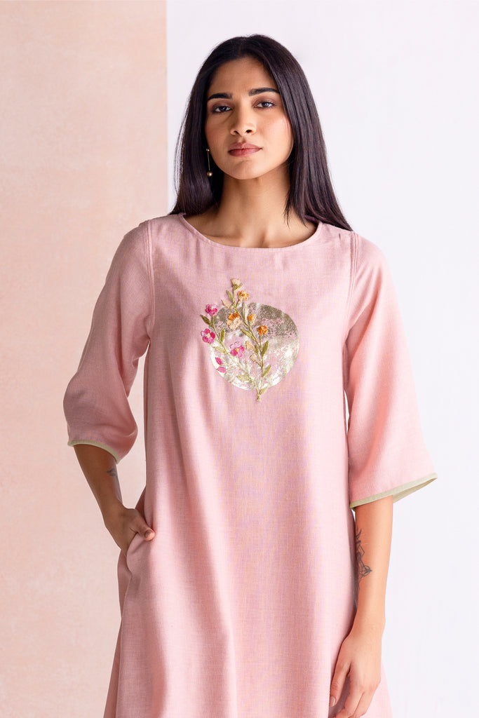 A poetic blend of shimmer and craftsmanship, Floral Moon draws inspiration from the quiet glow of moonlight over blossoming gardens. Delicate floral motifs are brought to life with intricate anchor thread embroidery, their texture adding depth and artistry to every piece. Accents of gold foiling glisten like moonlit reflections, creating a subtle yet striking interplay of light and detail. Offered in the refreshing hue of Lane Green and the romantic softness of Blush, the collection embodies timeless elegance with a luminous charm.